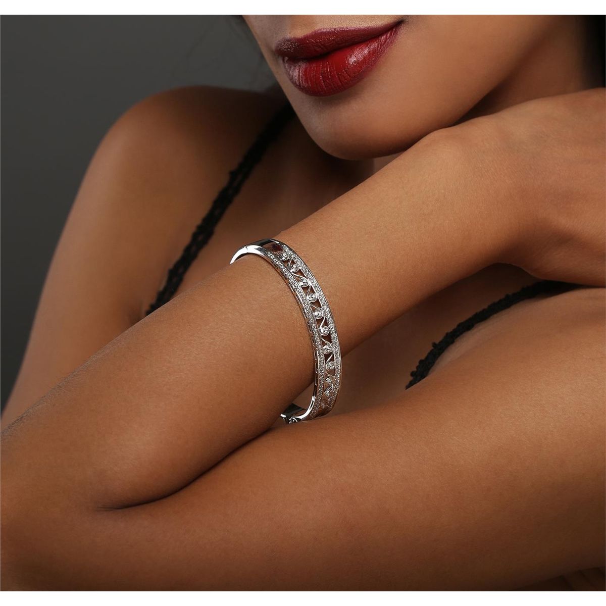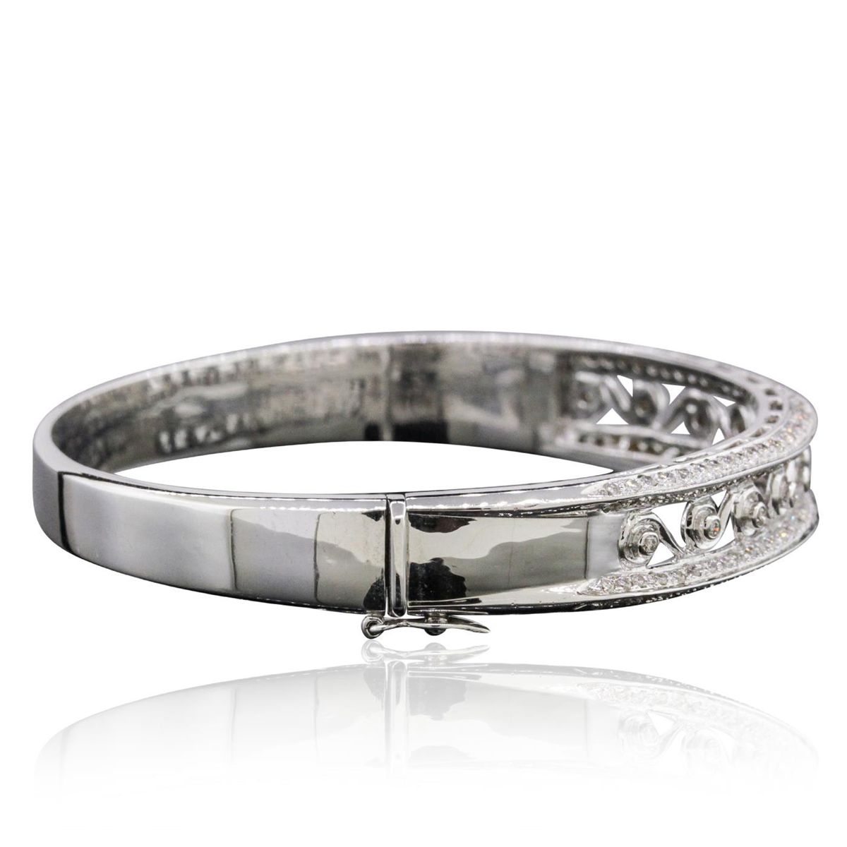 One electronically tested 18KT white gold ladies combination cast & assembled bangle bracelet with a bright polish finish. Measurements: 2.5" x 2.2". Identified with markings of "750". Condition is new. Containing: One Hundred Sixty-Two prong set round brilliant cut diamonds, measuring 1.30 - 1.30 x 0.78mm (depth est.) approximate total weight of 162 Stones = 1.30ct. Clarity: SI-1 to SI-2. Color: J - K, Cut is Good. Eleven bezel set round brilliant cut diamonds, measuring 1.50 - 1.50 x 0.90mm (depth est.) approximate total weight of 11 Stones = 0.14ct. Clarity: SI-2. Color: J, Cut is Good. All diamonds are graded in the mounting, unless otherwise stated. Total Weight of Diamonds 1.43ct. Total Weight of Bracelet 34.90 grams. GGL Appraised at $9,215.00.