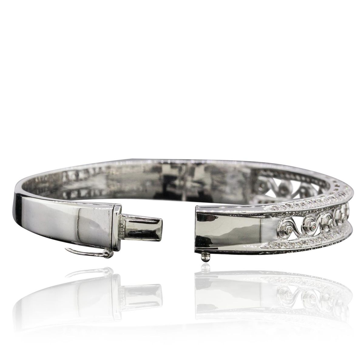 One electronically tested 18KT white gold ladies combination cast & assembled bangle bracelet with a bright polish finish. Measurements: 2.5" x 2.2". Identified with markings of "750". Condition is new. Containing: One Hundred Sixty-Two prong set round brilliant cut diamonds, measuring 1.30 - 1.30 x 0.78mm (depth est.) approximate total weight of 162 Stones = 1.30ct. Clarity: SI-1 to SI-2. Color: J - K, Cut is Good. Eleven bezel set round brilliant cut diamonds, measuring 1.50 - 1.50 x 0.90mm (depth est.) approximate total weight of 11 Stones = 0.14ct. Clarity: SI-2. Color: J, Cut is Good. All diamonds are graded in the mounting, unless otherwise stated. Total Weight of Diamonds 1.43ct. Total Weight of Bracelet 34.90 grams. GGL Appraised at $9,215.00.