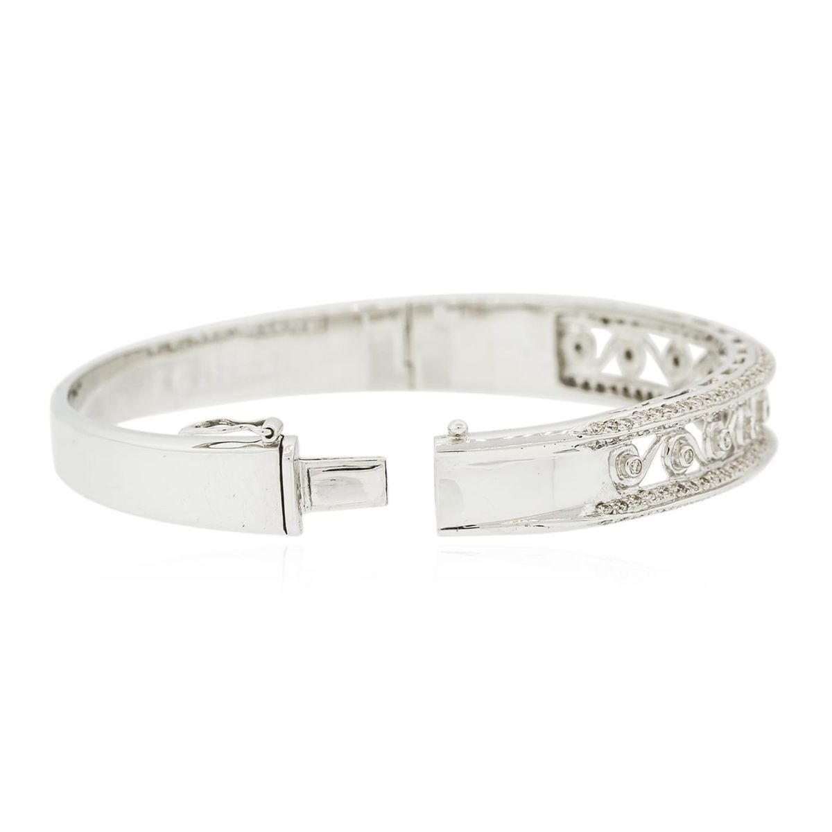 One electronically tested 18KT white gold ladies combination cast & assembled bangle bracelet with a bright polish finish. Measurements: 2.5" x 2.2". Identified with markings of "750". Condition is new. Containing: One Hundred Sixty-Two prong set round brilliant cut diamonds, measuring 1.30 - 1.30 x 0.78mm (depth est.) approximate total weight of 162 Stones = 1.30ct. Clarity: SI-1 to SI-2. Color: J - K, Cut is Good. Eleven bezel set round brilliant cut diamonds, measuring 1.50 - 1.50 x 0.90mm (depth est.) approximate total weight of 11 Stones = 0.14ct. Clarity: SI-2. Color: J, Cut is Good. All diamonds are graded in the mounting, unless otherwise stated. Total Weight of Diamonds 1.43ct. Total Weight of Bracelet 34.90 grams. GGL Appraised at $9,215.00.
