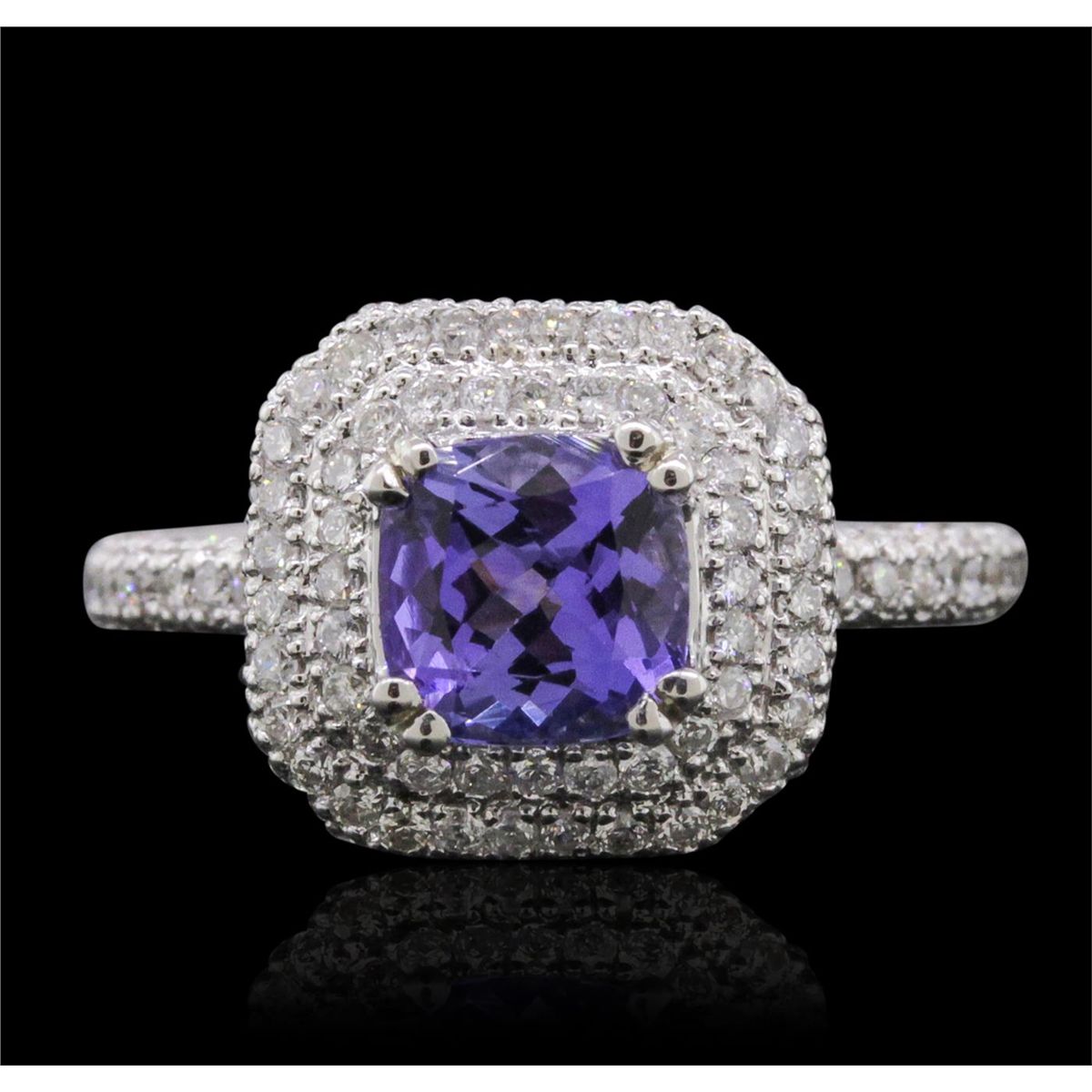 One electronically tested 18KT white gold ladies cast tanzanite and diamond ring. The featured tanzanite is set within a tiered diamond bezel supported by diamond set shoulders, completed by a two millimeter wide band. Bright polish finish with milgrain detailing. Trademark is HANA. Identified with markings of "18K". Condition is new, good workmanship. Containing: One prong set square cushion brilliant cut natural tanzanite, measuring 6.45 x 6.40 x 4.10mm, 8% bulge factor, approximate weight of 1.44ct., clarity is eye clean, type I, medium dark, very slightly grayish, bluish violet color, (GIA bV 6/3), cut is good. Transmitting light with no distortion, transparent. Graded in the setting. Tanzanite is a very rare gemstone that is only found in the country of Tanzania. Originally discovered in 1967. Tiffany & Company, named the stone Tanzanite. It is found in the Usumburu Mountains that border the Umba Valley of northern Tanzania. Tanzanite occurs in gray, brown, violet, blue, reddish-purple, & green. The gem is interesting because of its exceptional pleochroism. Rotated in different directions a tanzanite will exhibit multiple changes of color. Tanzanite has a low tolerance to ultrasonic cleaning, and should not be cleaned using this method. One Hundred Ninety-Four prong set round brilliant cut diamonds, measuring 1.20 - 1.10 x 0.69mm (depth est.) approximate total weight of 194 Stones = 1.08ct. Graded in the setting. Clarity: SI-2 to I-2. Color: H - J. Total Weight of Colored Stones 1.44ct. Total Weight of Diamonds 1.08ct. Total Weight of Ring 4.98 grams. AIG Appraised at $7,705.00.