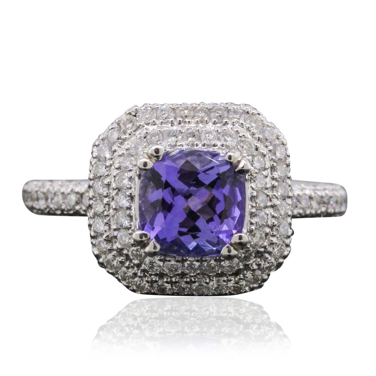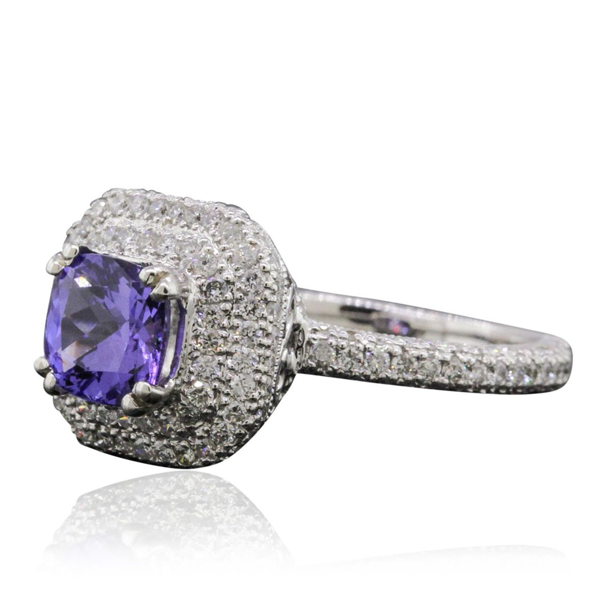 One electronically tested 18KT white gold ladies cast tanzanite and diamond ring. The featured tanzanite is set within a tiered diamond bezel supported by diamond set shoulders, completed by a two millimeter wide band. Bright polish finish with milgrain detailing. Trademark is HANA. Identified with markings of "18K". Condition is new, good workmanship. Containing: One prong set square cushion brilliant cut natural tanzanite, measuring 6.45 x 6.40 x 4.10mm, 8% bulge factor, approximate weight of 1.44ct., clarity is eye clean, type I, medium dark, very slightly grayish, bluish violet color, (GIA bV 6/3), cut is good. Transmitting light with no distortion, transparent. Graded in the setting. Tanzanite is a very rare gemstone that is only found in the country of Tanzania. Originally discovered in 1967. Tiffany & Company, named the stone Tanzanite. It is found in the Usumburu Mountains that border the Umba Valley of northern Tanzania. Tanzanite occurs in gray, brown, violet, blue, reddish-purple, & green. The gem is interesting because of its exceptional pleochroism. Rotated in different directions a tanzanite will exhibit multiple changes of color. Tanzanite has a low tolerance to ultrasonic cleaning, and should not be cleaned using this method. One Hundred Ninety-Four prong set round brilliant cut diamonds, measuring 1.20 - 1.10 x 0.69mm (depth est.) approximate total weight of 194 Stones = 1.08ct. Graded in the setting. Clarity: SI-2 to I-2. Color: H - J. Total Weight of Colored Stones 1.44ct. Total Weight of Diamonds 1.08ct. Total Weight of Ring 4.98 grams. AIG Appraised at $7,705.00.