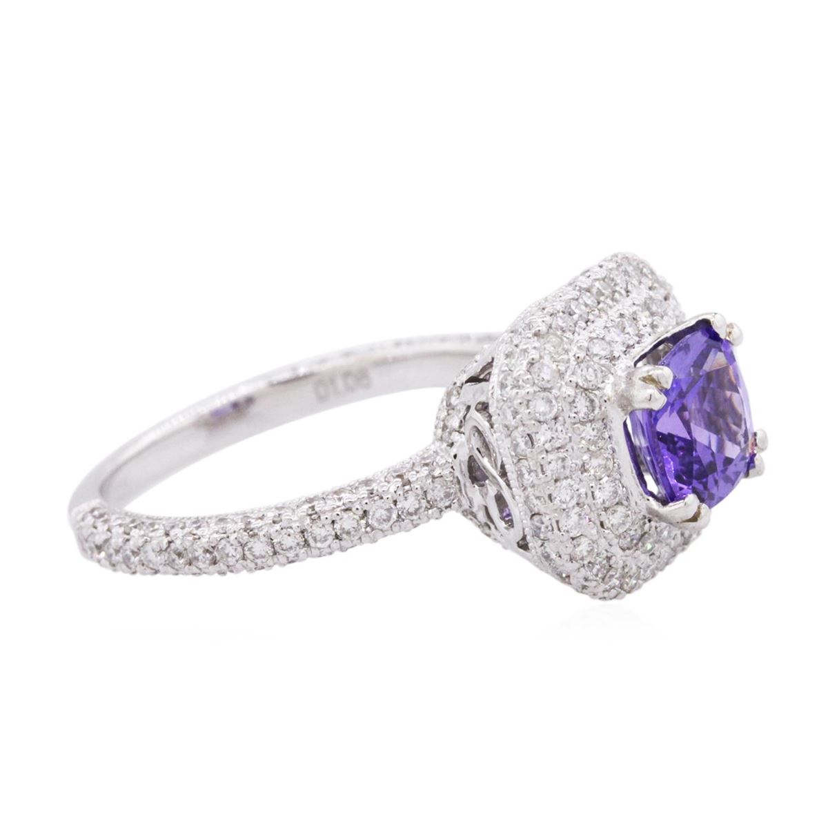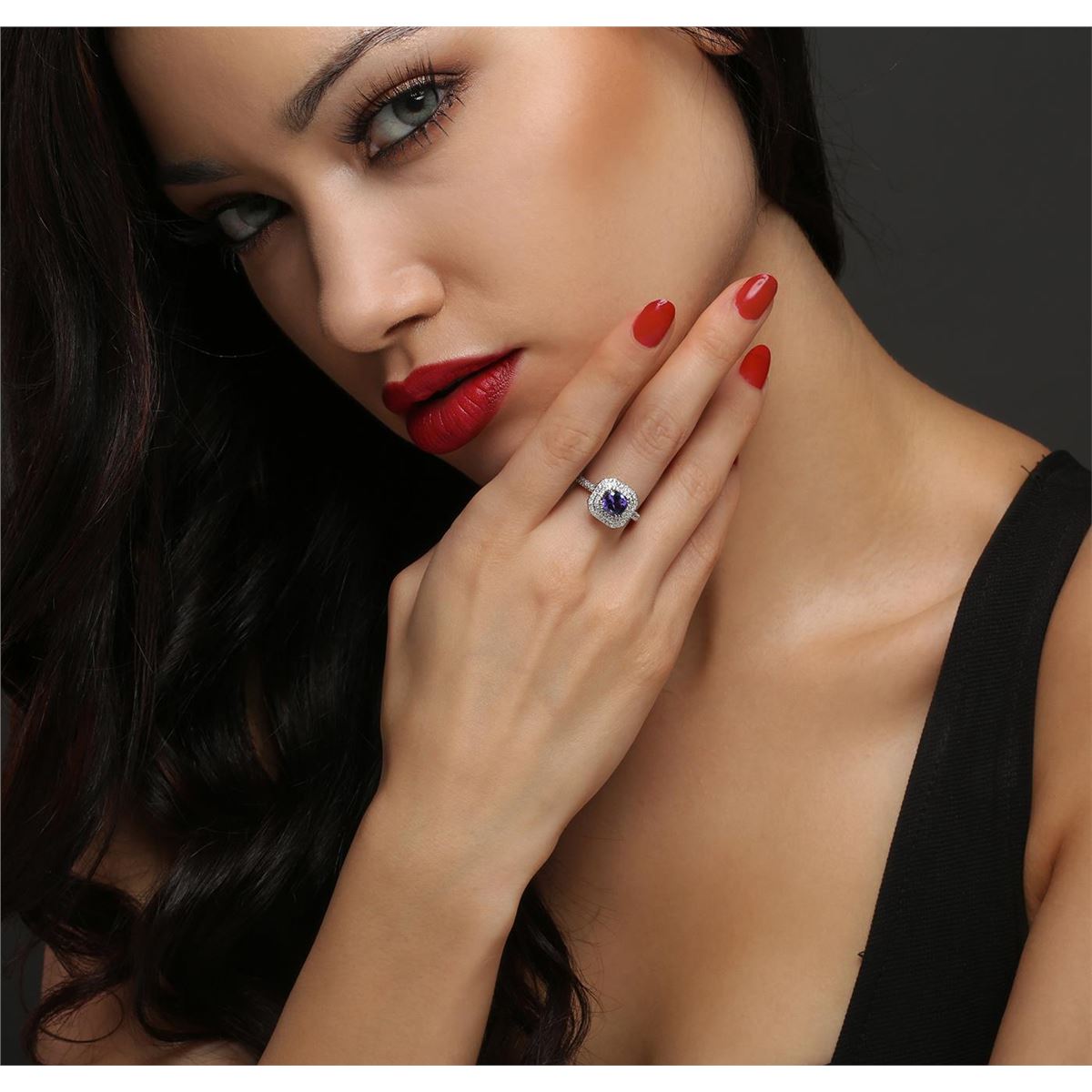 One electronically tested 18KT white gold ladies cast tanzanite and diamond ring. The featured tanzanite is set within a tiered diamond bezel supported by diamond set shoulders, completed by a two millimeter wide band. Bright polish finish with milgrain detailing. Trademark is HANA. Identified with markings of "18K". Condition is new, good workmanship. Containing: One prong set square cushion brilliant cut natural tanzanite, measuring 6.45 x 6.40 x 4.10mm, 8% bulge factor, approximate weight of 1.44ct., clarity is eye clean, type I, medium dark, very slightly grayish, bluish violet color, (GIA bV 6/3), cut is good. Transmitting light with no distortion, transparent. Graded in the setting. Tanzanite is a very rare gemstone that is only found in the country of Tanzania. Originally discovered in 1967. Tiffany & Company, named the stone Tanzanite. It is found in the Usumburu Mountains that border the Umba Valley of northern Tanzania. Tanzanite occurs in gray, brown, violet, blue, reddish-purple, & green. The gem is interesting because of its exceptional pleochroism. Rotated in different directions a tanzanite will exhibit multiple changes of color. Tanzanite has a low tolerance to ultrasonic cleaning, and should not be cleaned using this method. One Hundred Ninety-Four prong set round brilliant cut diamonds, measuring 1.20 - 1.10 x 0.69mm (depth est.) approximate total weight of 194 Stones = 1.08ct. Graded in the setting. Clarity: SI-2 to I-2. Color: H - J. Total Weight of Colored Stones 1.44ct. Total Weight of Diamonds 1.08ct. Total Weight of Ring 4.98 grams. AIG Appraised at $7,705.00.