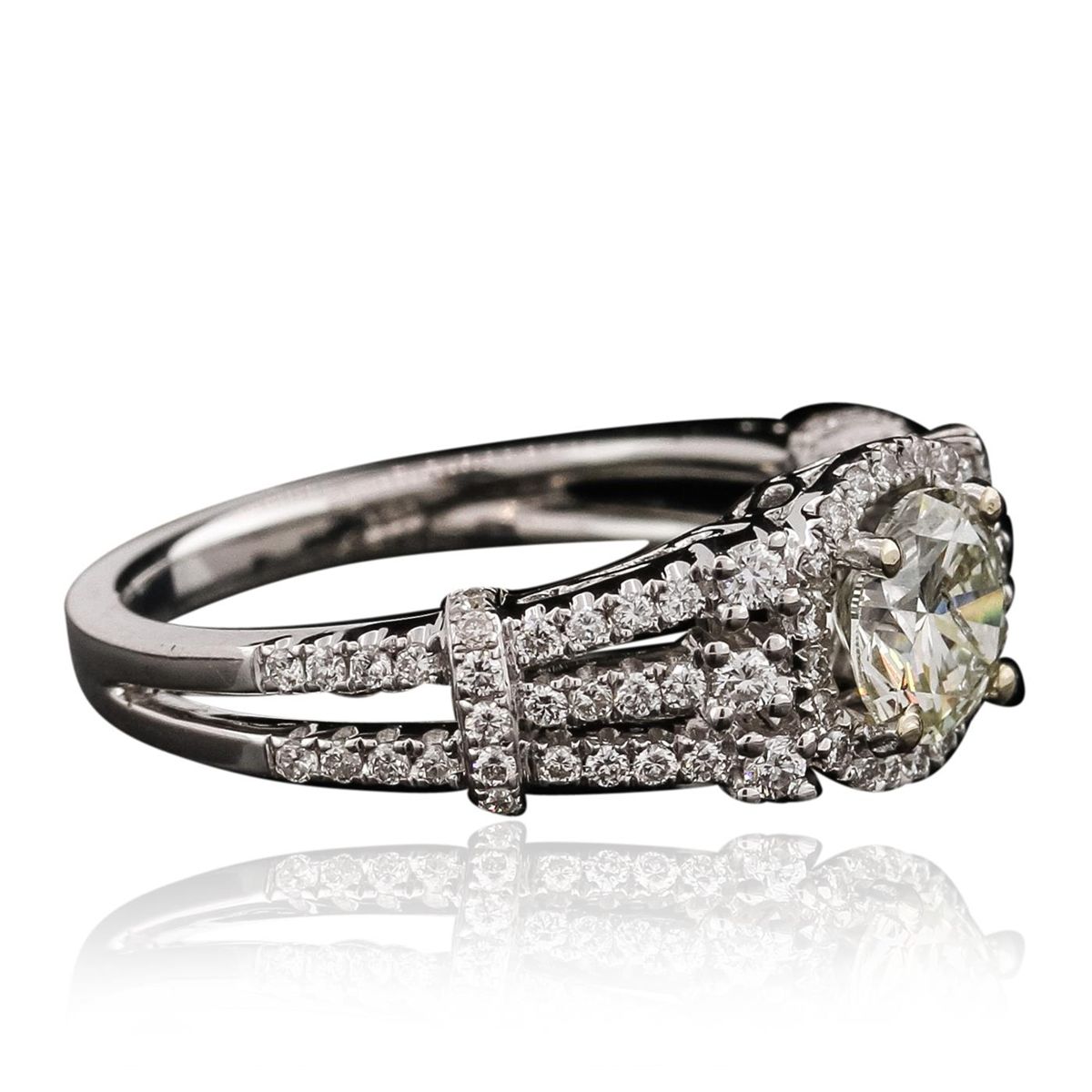 One electronically tested 18KT White Gold ladies cast diamond unity ring with a bright polish finish. The featured diamond is set within a diamond bezel supported by elaborate diamond set shoulders, completed by a two millimeter wide band. Identified with markings of "18K 750". Condition is new, good workmanship. Containing: One prong set round brilliant cut diamond, measuring 6.15 - 6.10 x 3.72mm (depth est.) approximate weight of 0.95ct with a medium blue fluorescence. Graded in the setting. Clarity: I-1. Color: M. Depth 60.7%. Table 63.6%. Eighty-Four prong set round brilliant cut diamonds approximate total weight of 84 Stones = 0.49ct. Graded in the setting. Clarity: VS-1 to SI-1. Color: G - I. Total Weight of Diamonds 1.44ct. Total Weight of Unity Ring 5.32 grams. AIG Appraised at $9,675.00.