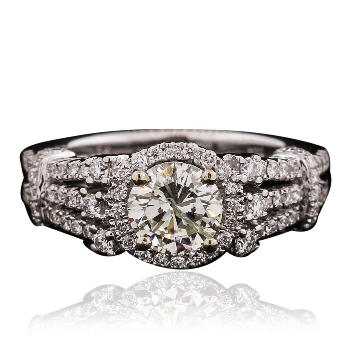 One electronically tested 18KT White Gold ladies cast diamond unity ring with a bright polish finish. The featured diamond is set within a diamond bezel supported by elaborate diamond set shoulders, completed by a two millimeter wide band. Identified with markings of "18K 750". Condition is new, good workmanship. Containing: One prong set round brilliant cut diamond, measuring 6.15 - 6.10 x 3.72mm (depth est.) approximate weight of 0.95ct with a medium blue fluorescence. Graded in the setting. Clarity: I-1. Color: M. Depth 60.7%. Table 63.6%. Eighty-Four prong set round brilliant cut diamonds approximate total weight of 84 Stones = 0.49ct. Graded in the setting. Clarity: VS-1 to SI-1. Color: G - I. Total Weight of Diamonds 1.44ct. Total Weight of Unity Ring 5.32 grams. AIG Appraised at $9,675.00.