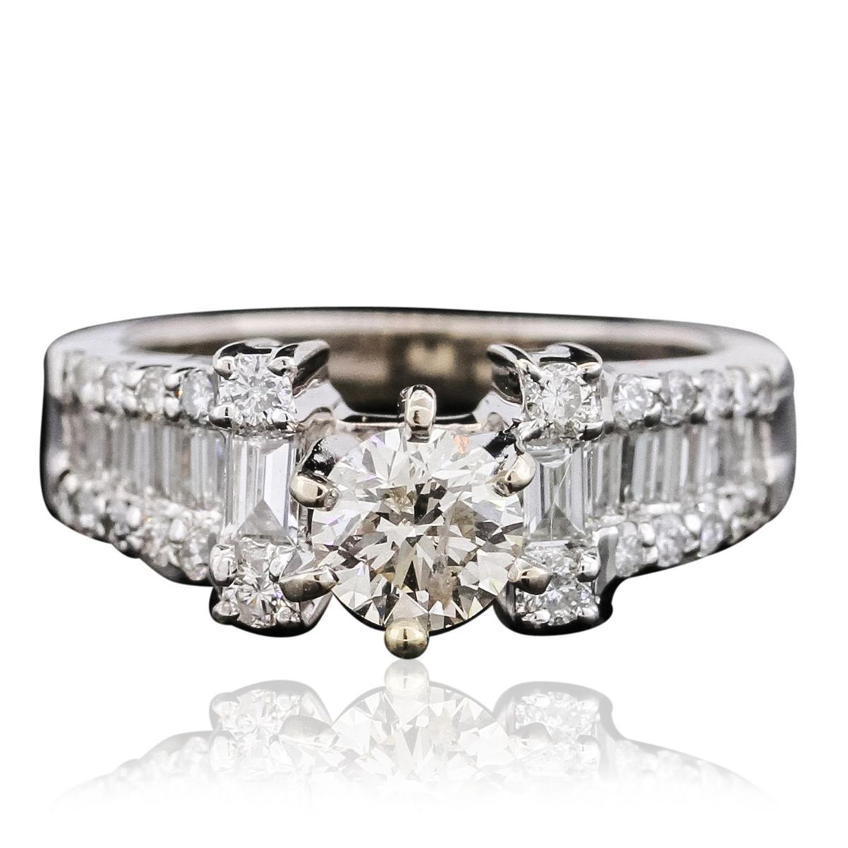 One electronically tested 18KT white gold ladies combination cast & assembled engagement ring with a bright polish finish. Identified with markings of "18K". Condition is very good. Containing: One prong set round brilliant cut diamond, measuring 5.36 - 5.29 x 3.19mm (depth est.) approximate weight of 0.55ct. Clarity: SI-2. Color: K, Cut is Good. Twenty-Four prong set round brilliant cut diamonds, measuring 1.70 - 1.30 x 0.90mm (depth est.) approximate total weight of 24 Stones = 0.30ct. Clarity: SI-2 to I-1. Color: J - K, Cut is Good. Fourteen channel set baguette cut diamonds, measuring from 1.70 x 1.30 x 1.11mm (depth est.) to 3.00 x 1.80 x 1.53mm (depth est.) approximate total weight of 14 Stones = 0.62ct. Clarity: VS-2 to SI-1. Color: I - J, Cut is Good. All diamonds are graded in the mounting, unless otherwise stated. Total Weight of Diamonds 1.46ct. Total Weight of Ring 6.20 grams. GGL Appraised at $6,885.00.