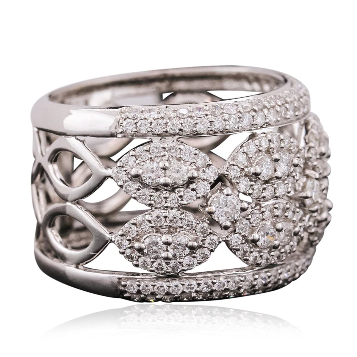 One electronically tested 18KT white gold ladies combination cast & assembled ring with a bright polish finish. Identified with markings of "750". Condition is new. Containing: Two Hundred Twenty-Nine prong set round brilliant cut diamonds, measuring 1.70 - 1.10 x 0.84mm (depth est.) approximate total weight of 229 Stones = 1.48ct. Clarity: SI-2 to I-2. Color: H - I, Cut is Good. All diamonds are graded in the mounting, unless otherwise stated. Total Weight of Diamonds 1.48ct. Total Weight of Ring 8.10 grams. GGL Appraised at $8,505.00.