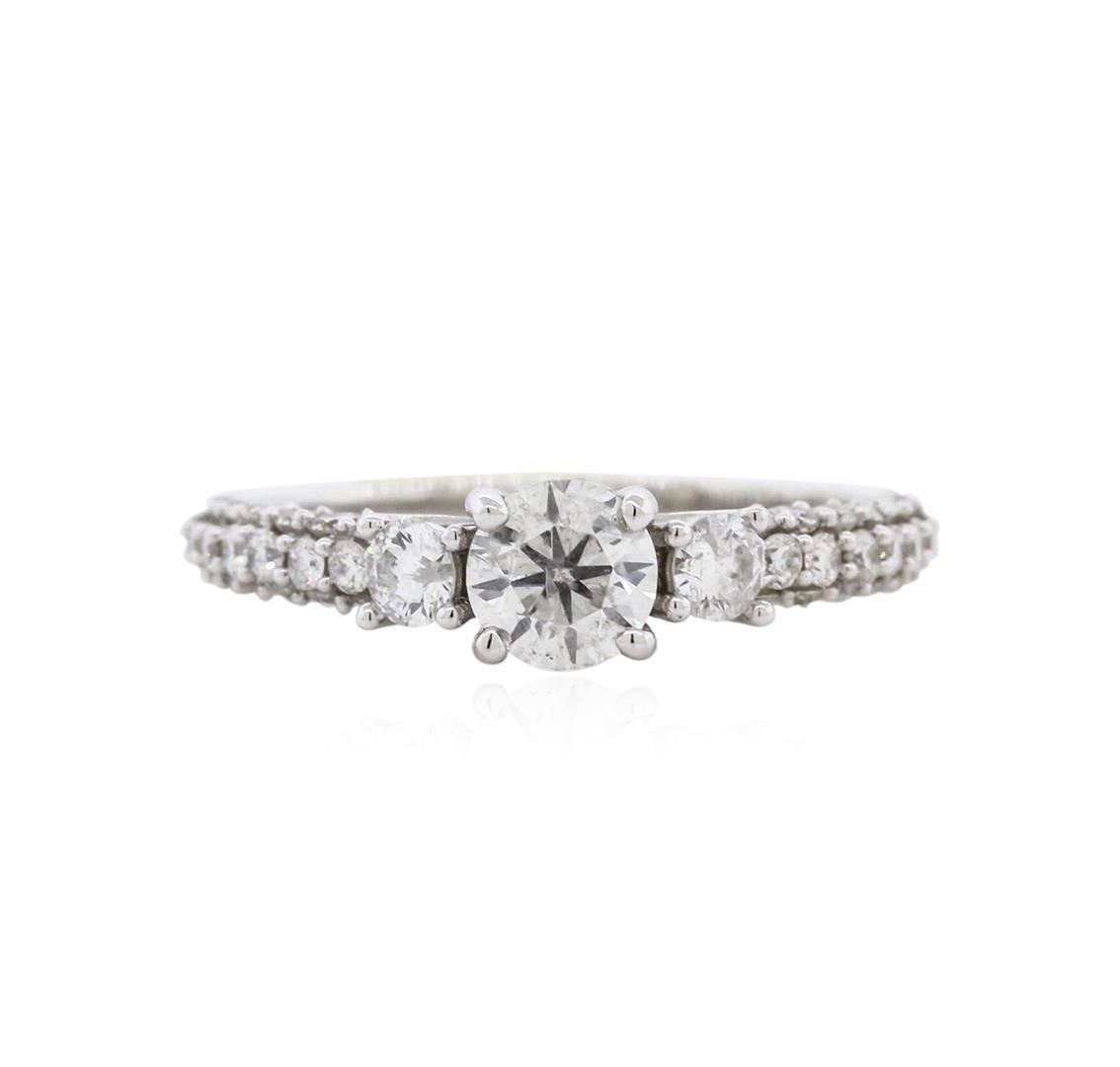 One electronically tested 18KT white gold ladies cast diamond unity ring with a bright polish finish. The featured diamond is supported by diamond set shoulders, completed by a one and one-half millimeter wide band. Trademark is Orianne. Identified with markings of "18K". Condition is new, good workmanship. Containing: One prong set round brilliant cut diamond, measuring 5.11 - 5.10 x 3.00mm (depth est.) approximate weight of 0.57ct with a medium blue fluorescence. Graded in the setting. Clarity: I-1. Color: I. Depth 58.7%. Table 59.7%. Fifty-Six prong set round brilliant cut diamonds (depth est.) approximate total weight of 56 Stones = 0.93ct. Graded in the setting. Clarity: SI-1 to I-1. Color: G - I. Total Weight of Diamonds 1.50ct. Total Weight of Ring 2.81 grams. AIG Appraised at $6,300.00.