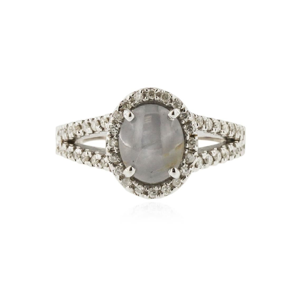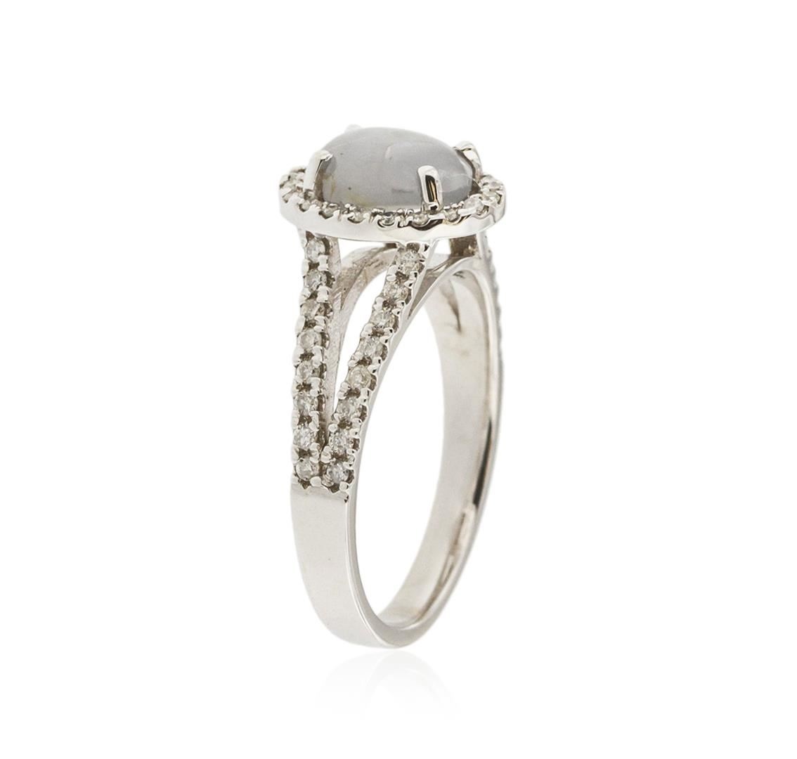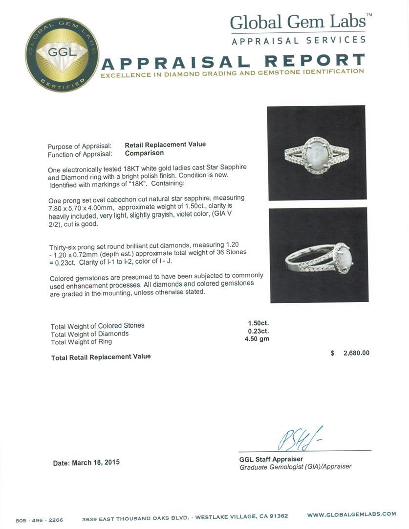 One electronically tested 18KT white gold ladies cast Star Sapphire and Diamond ring with a bright polish finish. Identified with markings of "18K". Condition is new. Containing: One prong set oval cabochon cut natural star sapphire, measuring 7.80 x 5.70 x 4.00mm, approximate weight of 1.50ct., clarity is heavily included, very light, slightly grayish, violet color, (GIA V 2/2), cut is good. Thirty-Six prong set round brilliant cut diamonds, measuring 1.20 - 1.20 x 0.72mm (depth est.) approximate total weight of 36 Stones = 0.23ct. Clarity of I-1 to I-2, Color of I - J. Colored gemstones are presumed to have been subjected to commonly used enhancement processes. All diamonds and colored gemstones are graded in the mounting, unless otherwise stated. Total Weight of Colored Stones 1.50ct. Total Weight of Diamonds 0.23ct. Total Weight of Ring 4.50 grams. GGL Appraised at $2,680.00.