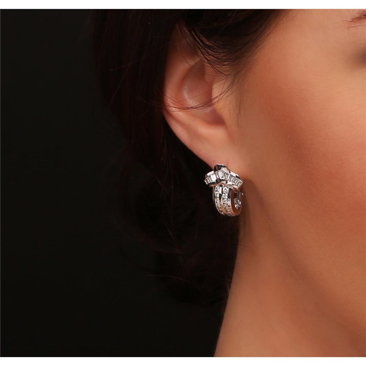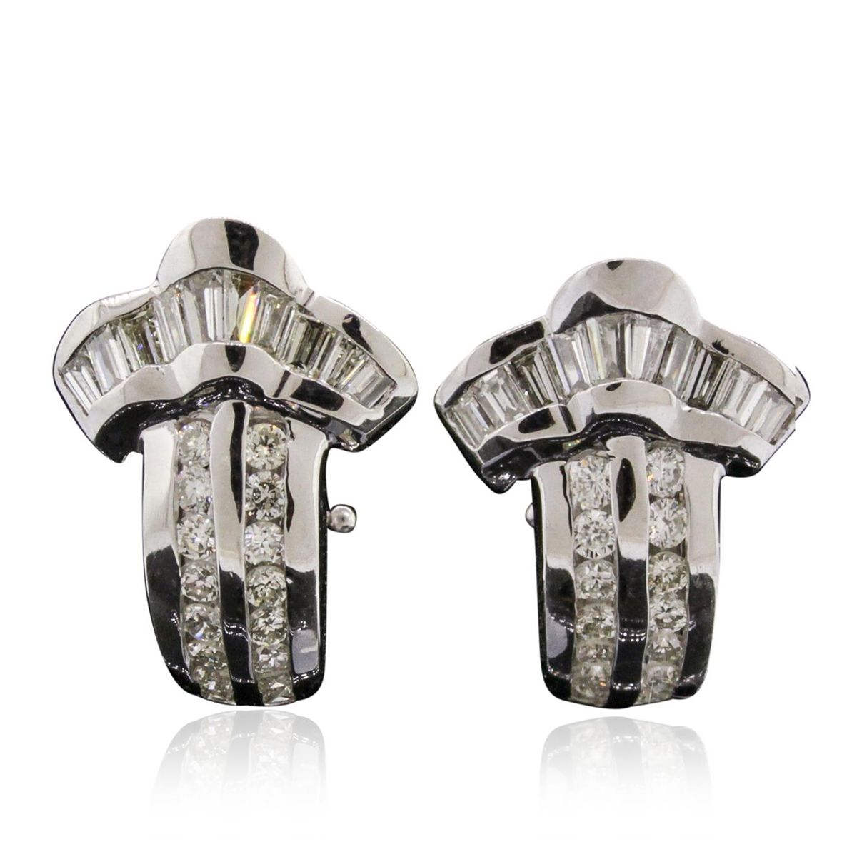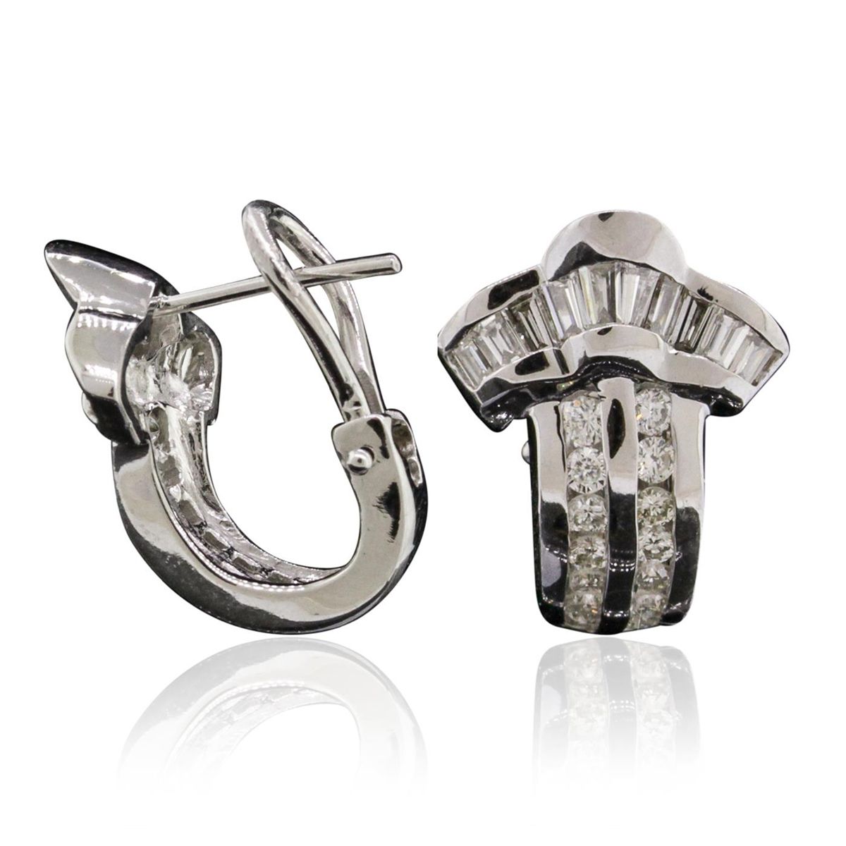 One pair electronically tested 18KT white gold ladies cast diamond earrings with omega backs. Condition is new, good workmanship. Bright polish finish. Identified with markings of "18K". Containing: Thirty-Two channel set round brilliant cut diamonds, measuring 1.80 - 1.70 x 1.05mm (depth est.) approximate. Total Weight of 32 Stones = 0.72ct. Graded in the setting. Clarity: VS-2 to SI-2. Color: H - J Twenty channel set baguette cut (tapered) diamonds, measuring from 2.20 x 1.50 x 1.05mm (depth est.) to 2.80 x 1.60 x 1.12mm (depth est.) approximate. Total Weight of 20 Stones = 0.80ct. Graded in the setting. Clarity: VS-1 to SI-1. Color: H - J. Total Weight of Diamonds 1.52ct. Total Weight of Earrings 9.01 grams. AIG Appraised at $7,230.00.