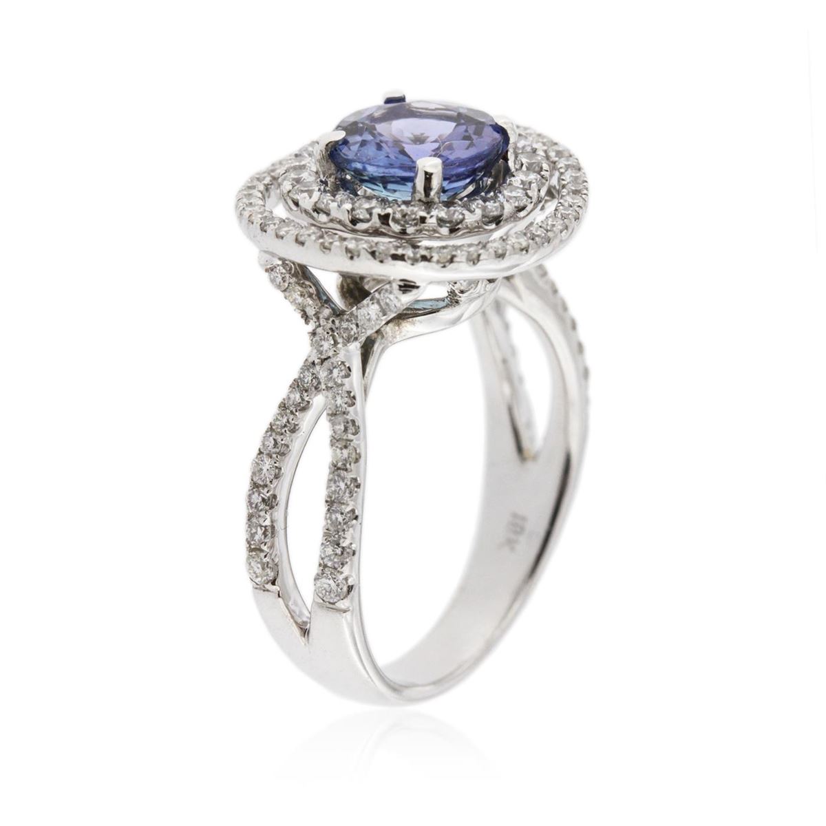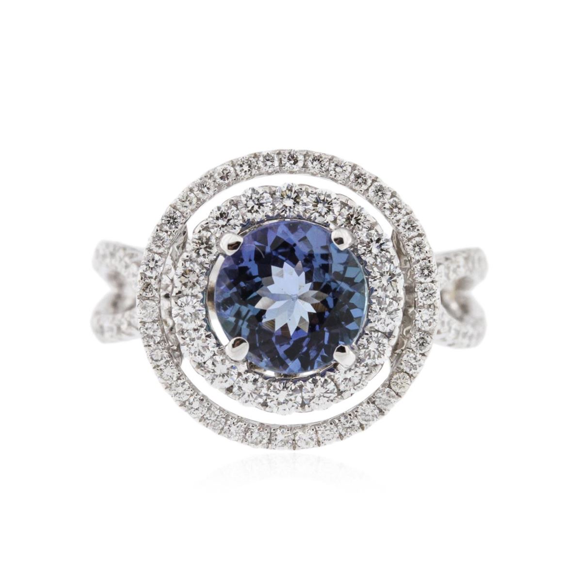 One electronically tested 18KT white gold ladies cast tanzanite and diamond ring with a bright polish finish. Condition is new, good workmanship. The featured tanzanite is set within a two tiered diamond lattice gallery, supported by diamond set split shoulders and completed by a three millimeter wide band. Identified with markings of "18K". Containing: One prong set round mixed cut natural tanzanite, measuring 7.30 - 7.30 x 4.05 mm, 6%. bulge factor, approximate weight of 1.53ct., clarity is eye clean, type I, medium, very slightly grayish, violet color, (GIA V 5/3), cut is good. Transmitting light with no distortion, transparent. Graded in the setting. Tanzanite is a very rare gemstone that is only found in the country of Tanzania. Originally discovered in 1967. Tiffany & Company, named the stone Tanzanite. It is found in the Usumburu Mountains that border the Umba Valley of northern Tanzania. Tanzanite occurs in gray, brown, violet, blue, reddish-purple, & green. The gem is interesting because of its exceptional pleochroism. Rotated in different directions a tanzanite will exhibit multiple changes of color. Tanzanite has a low tolerance to ultrasonic cleaning, and should not be cleaned using this method. Eighteen prong set round brilliant cut diamonds, measuring 1.70 - 1.60 x 0.99mm (depth est.) approximate. Total Weight of 18 Stones = 0.41ct. Graded in the setting. Clarity: SI-1 to SI-2. Color: F - H Ninety-Six prong set round brilliant cut diamonds, measuring 1.50 - 1.00 x 0.75mm (depth est.) approximate. Total Weight of 96 Stones = 0.78ct. Graded in the setting. Clarity: SI-1 to I-1. Color: F - H. Total Weight of Colored Stones 1.53ct. Total Weight of Diamonds 1.19ct. Total Weight of Ring 6.50 grams. AIG Appraised at $7,890.00.
