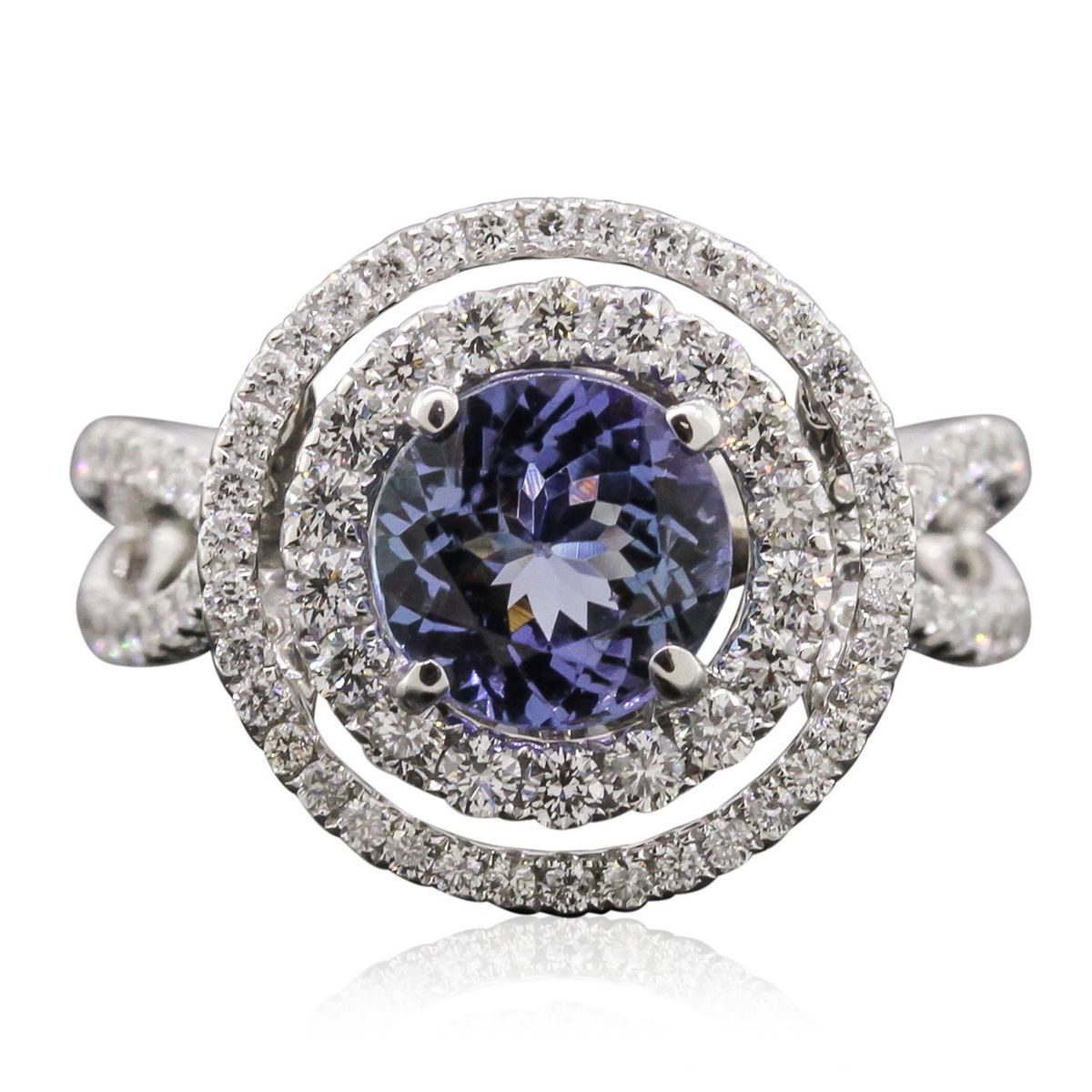 One electronically tested 18KT white gold ladies cast tanzanite and diamond ring with a bright polish finish. Condition is new, good workmanship. The featured tanzanite is set within a two tiered diamond lattice gallery, supported by diamond set split shoulders and completed by a three millimeter wide band. Identified with markings of "18K". Containing: One prong set round mixed cut natural tanzanite, measuring 7.30 - 7.30 x 4.05 mm, 6%. bulge factor, approximate weight of 1.53ct., clarity is eye clean, type I, medium, very slightly grayish, violet color, (GIA V 5/3), cut is good. Transmitting light with no distortion, transparent. Graded in the setting. Tanzanite is a very rare gemstone that is only found in the country of Tanzania. Originally discovered in 1967. Tiffany & Company, named the stone Tanzanite. It is found in the Usumburu Mountains that border the Umba Valley of northern Tanzania. Tanzanite occurs in gray, brown, violet, blue, reddish-purple, & green. The gem is interesting because of its exceptional pleochroism. Rotated in different directions a tanzanite will exhibit multiple changes of color. Tanzanite has a low tolerance to ultrasonic cleaning, and should not be cleaned using this method. Eighteen prong set round brilliant cut diamonds, measuring 1.70 - 1.60 x 0.99mm (depth est.) approximate. Total Weight of 18 Stones = 0.41ct. Graded in the setting. Clarity: SI-1 to SI-2. Color: F - H Ninety-Six prong set round brilliant cut diamonds, measuring 1.50 - 1.00 x 0.75mm (depth est.) approximate. Total Weight of 96 Stones = 0.78ct. Graded in the setting. Clarity: SI-1 to I-1. Color: F - H. Total Weight of Colored Stones 1.53ct. Total Weight of Diamonds 1.19ct. Total Weight of Ring 6.50 grams. AIG Appraised at $7,890.00.