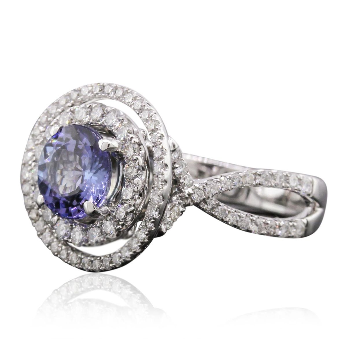 One electronically tested 18KT white gold ladies cast tanzanite and diamond ring with a bright polish finish. Condition is new, good workmanship. The featured tanzanite is set within a two tiered diamond lattice gallery, supported by diamond set split shoulders and completed by a three millimeter wide band. Identified with markings of "18K". Containing: One prong set round mixed cut natural tanzanite, measuring 7.30 - 7.30 x 4.05 mm, 6%. bulge factor, approximate weight of 1.53ct., clarity is eye clean, type I, medium, very slightly grayish, violet color, (GIA V 5/3), cut is good. Transmitting light with no distortion, transparent. Graded in the setting. Tanzanite is a very rare gemstone that is only found in the country of Tanzania. Originally discovered in 1967. Tiffany & Company, named the stone Tanzanite. It is found in the Usumburu Mountains that border the Umba Valley of northern Tanzania. Tanzanite occurs in gray, brown, violet, blue, reddish-purple, & green. The gem is interesting because of its exceptional pleochroism. Rotated in different directions a tanzanite will exhibit multiple changes of color. Tanzanite has a low tolerance to ultrasonic cleaning, and should not be cleaned using this method. Eighteen prong set round brilliant cut diamonds, measuring 1.70 - 1.60 x 0.99mm (depth est.) approximate. Total Weight of 18 Stones = 0.41ct. Graded in the setting. Clarity: SI-1 to SI-2. Color: F - H Ninety-Six prong set round brilliant cut diamonds, measuring 1.50 - 1.00 x 0.75mm (depth est.) approximate. Total Weight of 96 Stones = 0.78ct. Graded in the setting. Clarity: SI-1 to I-1. Color: F - H. Total Weight of Colored Stones 1.53ct. Total Weight of Diamonds 1.19ct. Total Weight of Ring 6.50 grams. AIG Appraised at $7,890.00.