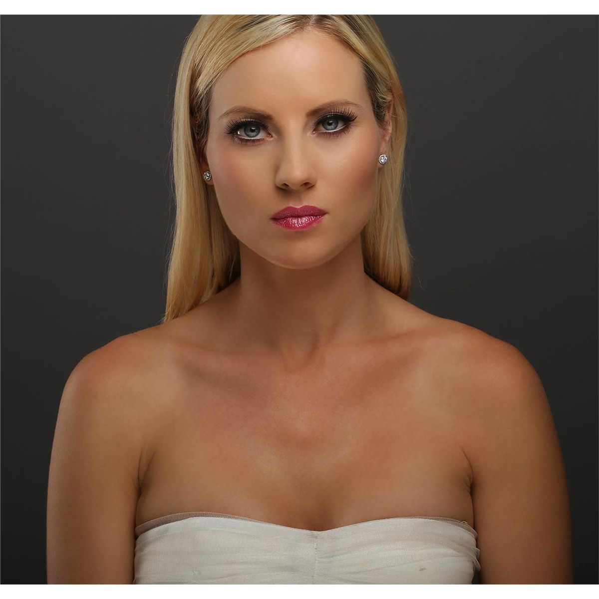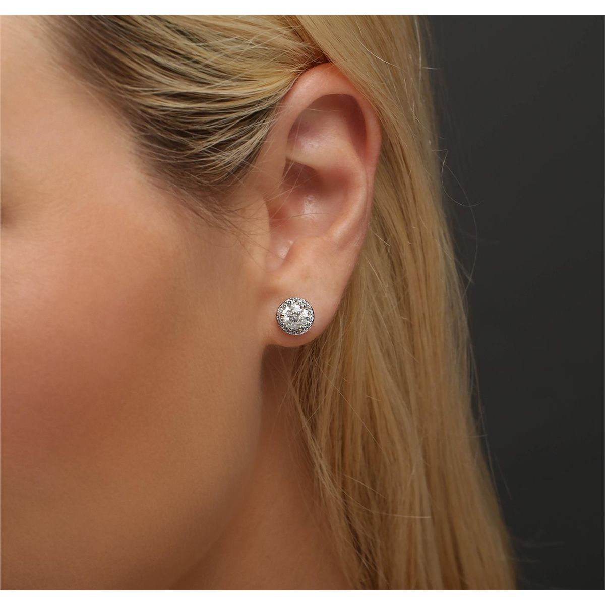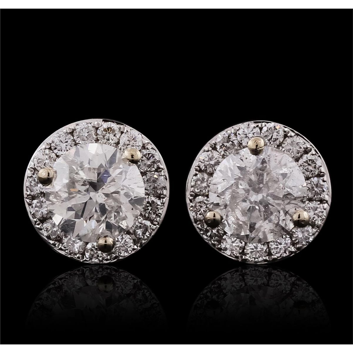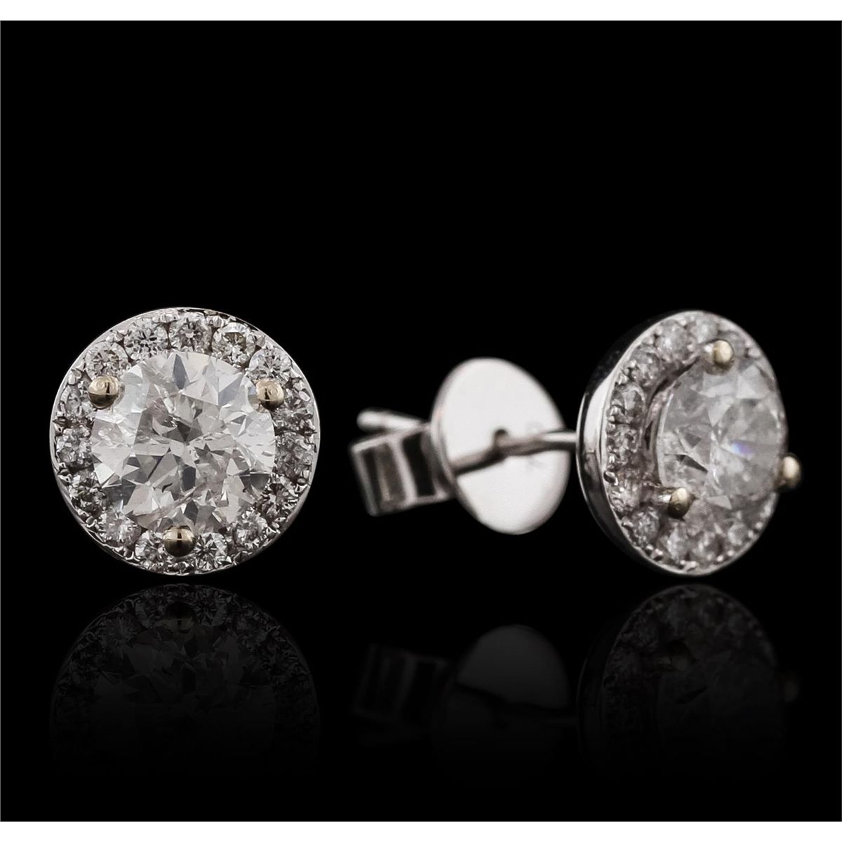 One pair electronically tested 18KT White Gold ladies cast diamond earrings with standard backs. Each earring features a round brilliant diamond set within a diamond bezel. Bright polish finish. Identified with markings of "18K 750". Condition is new, good workmanship. Containing: Two prong set round brilliant cut diamonds, measuring 5.35 - 5.25 x 3.30mm (depth est.) approximate total weight of 2 Stones = 1.25ct. The clarity & color grade reflect the overall average for the pair. Graded in the setting. Clarity: I-1. Color: H Thirty prong set round brilliant cut diamonds, measuring 1.40 - 1.30 x 0.81mm (depth est.) approximate total weight of 30 Stones = 0.28ct. Graded in the setting. Clarity: SI-1 to I-1. Color: G - I. Total Weight of Diamonds 1.53ct. Total Weight of Earrings 2.23 grams. AIG Appraised at $9,865.00.