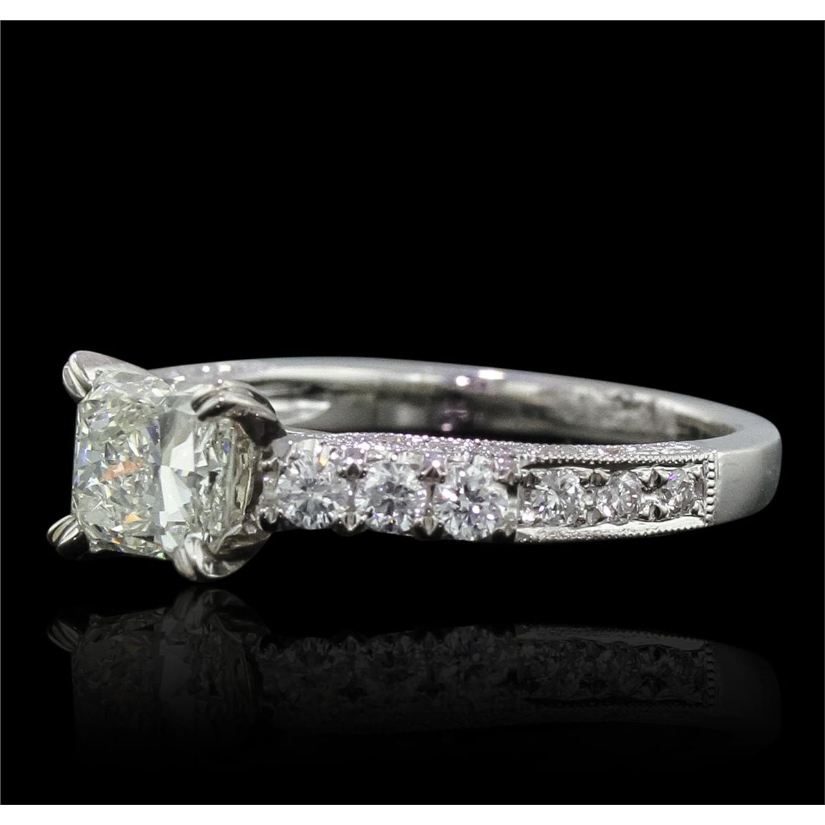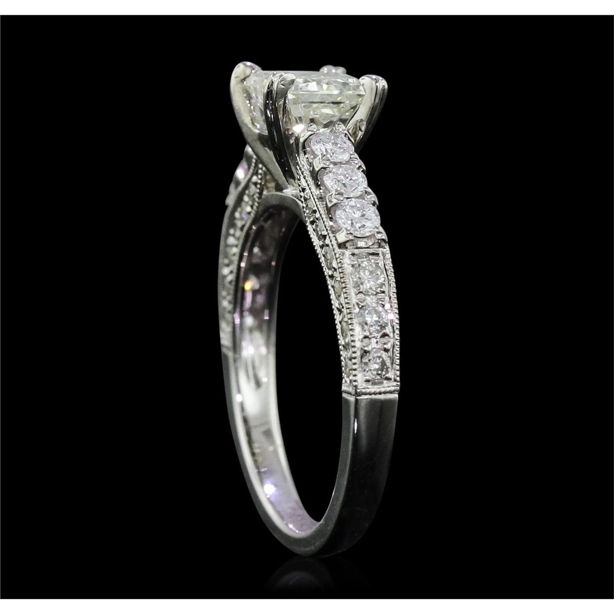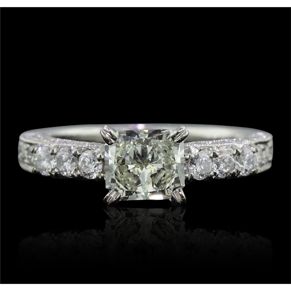 One electronically tested 18KT white gold Ladies combination cast & assembled engagement ring with a bright polish finish. Condition is new. Identified with markings of "750". Containing: One prong set radiant shaped cut diamond, measuring 6.07 x 5.40 x 3.80mm (depth est.) approximate weight of 1.02ct. Clarity: VS-2. Color: K, Cut is Very Good. Six prong set round brilliant cut diamonds, measuring 2.20 - 2.20 x 1.32mm (depth est.) approximate. Total Weight of 6 Stones = 0.23ct. Clarity: SI-2. Color: I - J, Cut is Good. Thirty bead set round brilliant cut diamonds, measuring 1.50 - 1.30 x 0.84mm (depth est.) approximate. Total Weight of 30 Stones = 0.30ct. Clarity: SI-2 to I-1. Color: I - J, Cut is Good. Total Weight of Diamonds 1.55ct. Total Weight of Engagement Ring 4.00 grams. GGL Appraised at $15,075.00.