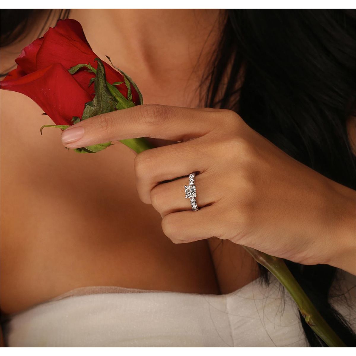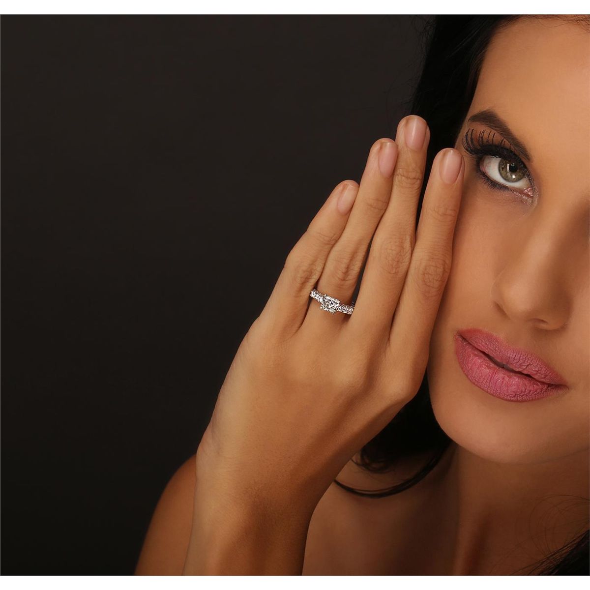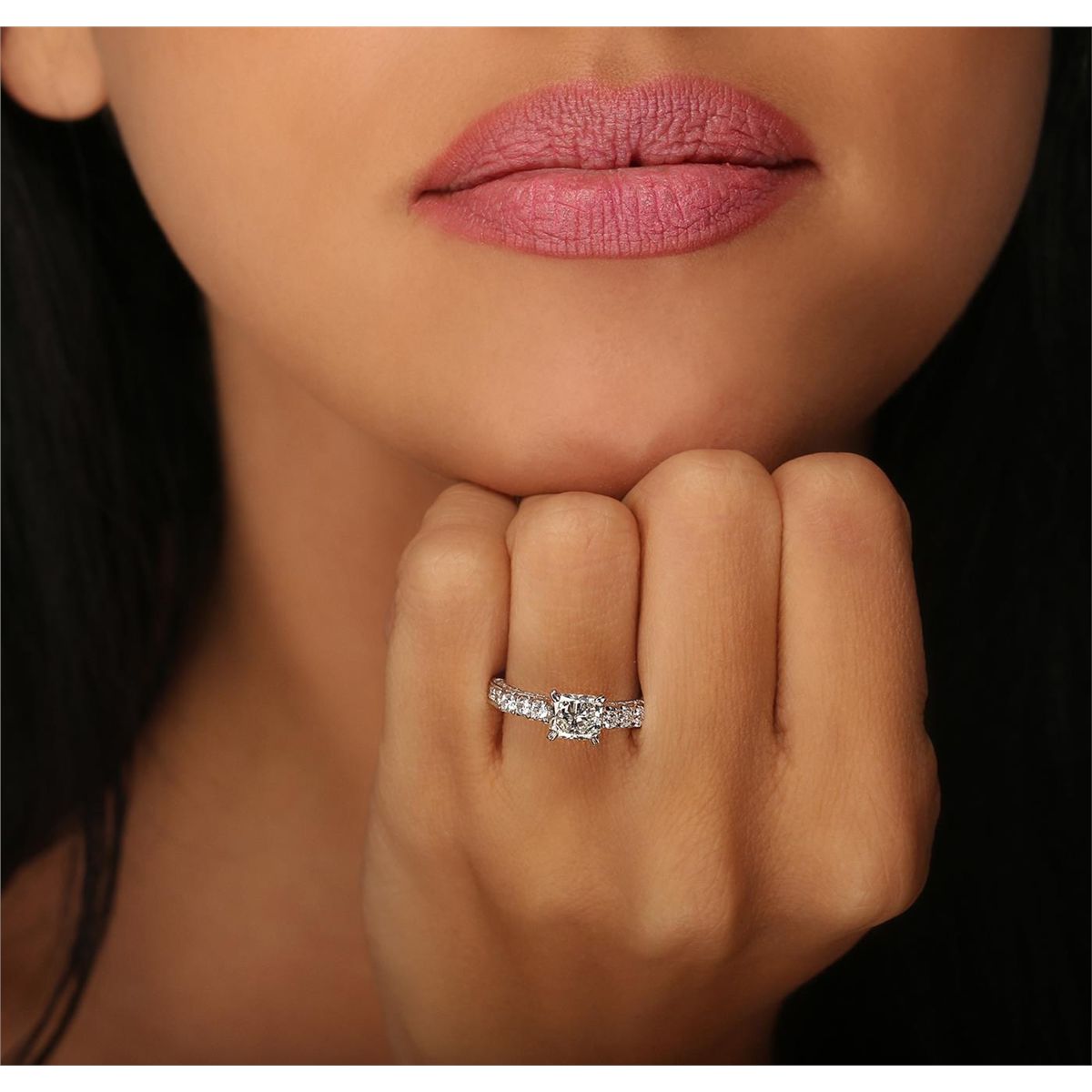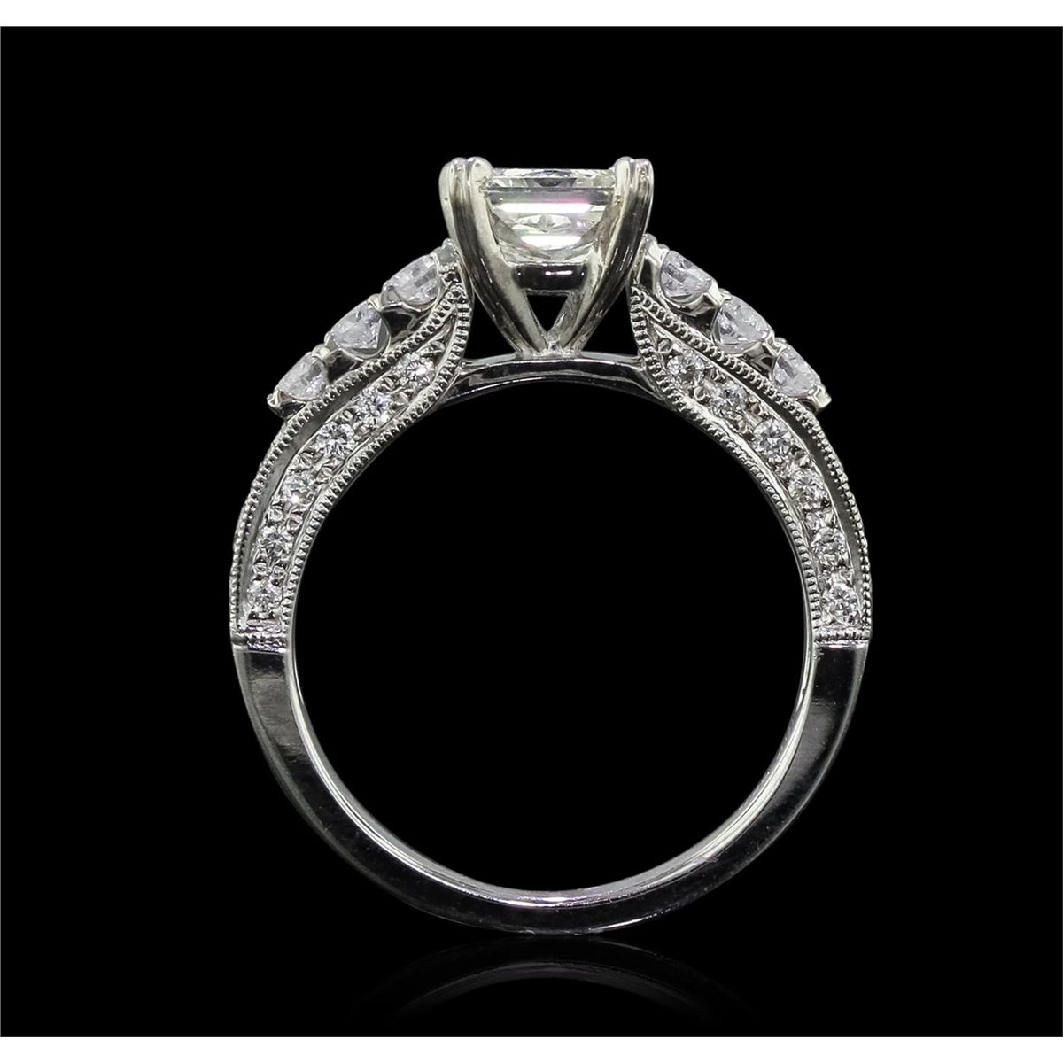 One electronically tested 18KT white gold Ladies combination cast & assembled engagement ring with a bright polish finish. Condition is new. Identified with markings of "750". Containing: One prong set radiant shaped cut diamond, measuring 6.07 x 5.40 x 3.80mm (depth est.) approximate weight of 1.02ct. Clarity: VS-2. Color: K, Cut is Very Good. Six prong set round brilliant cut diamonds, measuring 2.20 - 2.20 x 1.32mm (depth est.) approximate. Total Weight of 6 Stones = 0.23ct. Clarity: SI-2. Color: I - J, Cut is Good. Thirty bead set round brilliant cut diamonds, measuring 1.50 - 1.30 x 0.84mm (depth est.) approximate. Total Weight of 30 Stones = 0.30ct. Clarity: SI-2 to I-1. Color: I - J, Cut is Good. Total Weight of Diamonds 1.55ct. Total Weight of Engagement Ring 4.00 grams. GGL Appraised at $15,075.00.