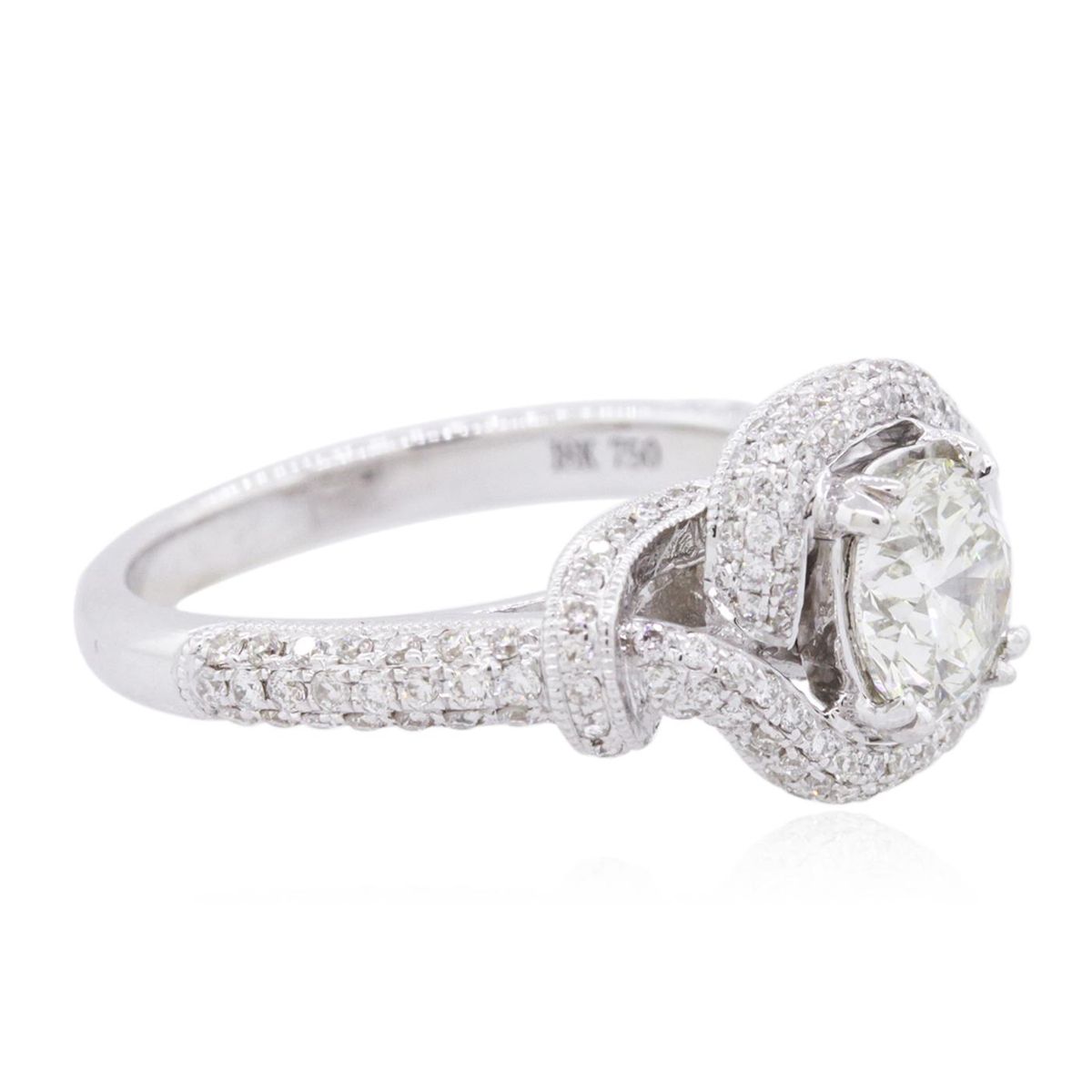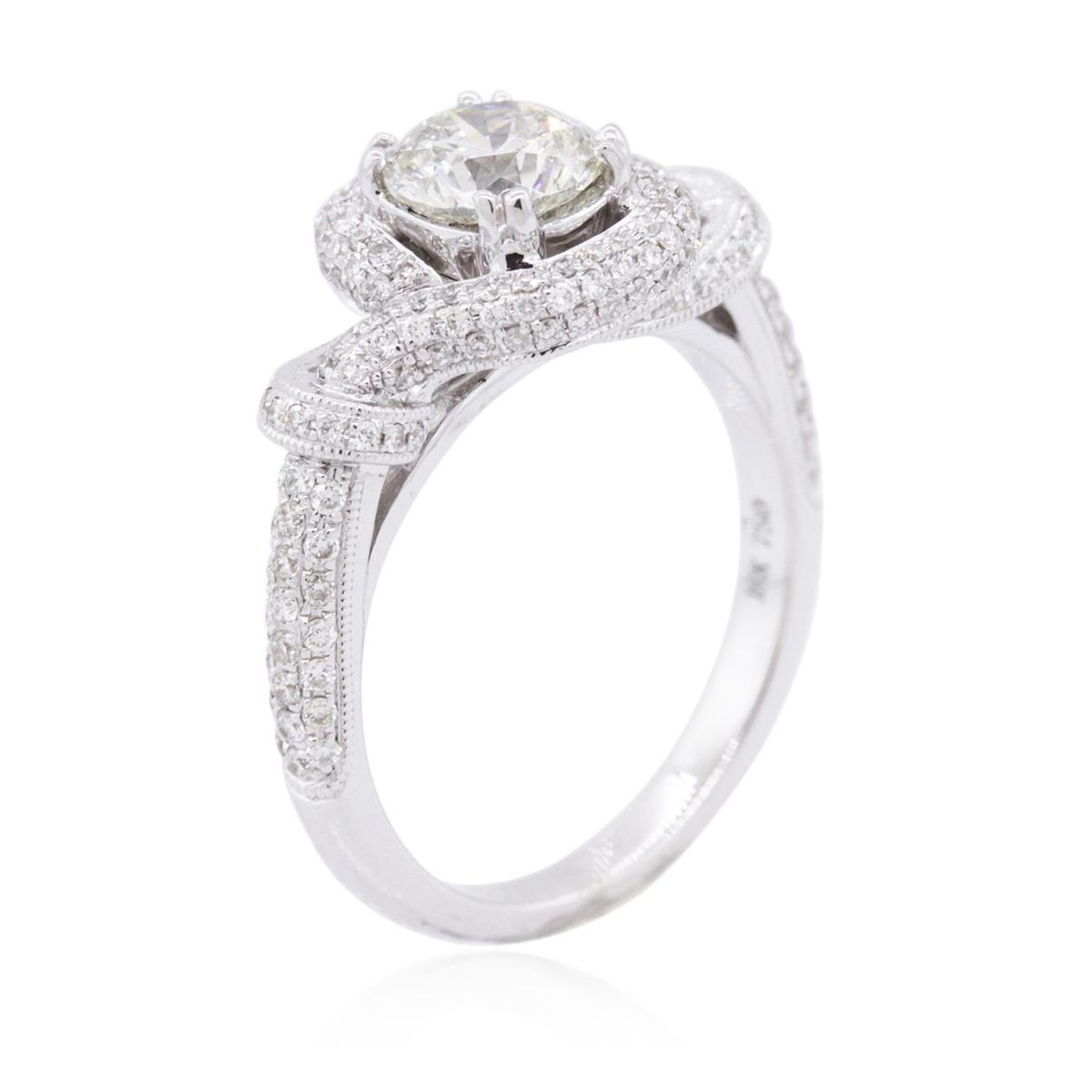 One electronically tested 18KT white gold ladies cast diamond unity ring. The featured diamond is set within a stylized bezel supported by an elaborate intertwining diamond set under gallery and diamond set shoulders, completed by a two and one-half millimeter wide band. Bright polish finish with milgrain detailing. Identified with markings of "18K 750". Condition is new, good workmanship. Containing: One prong set round brilliant cut diamond, measuring 6.15 - 6.12 x 3.70mm (depth est.), 6.00.%. GTCF approximate weight of 1.00ct. Graded in the setting. Clarity: I-1. Color: M. Depth 60.3%. Table 59.5%. One Hundred Sixty-Eight prong set round brilliant cut diamonds, measuring 1.00 - 0.90 x 0.57mm (depth est.) approximate total weight of 168 Stones = 0.55ct. Graded in the setting. Clarity: VS-2 to SI-2. Color: G - I. Total Weight of Diamonds 1.55ct. Total Weight of Ring 6.50 grams. AIG Appraised at $13,405.00.