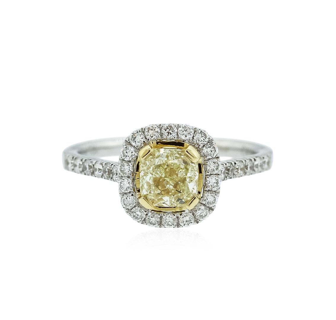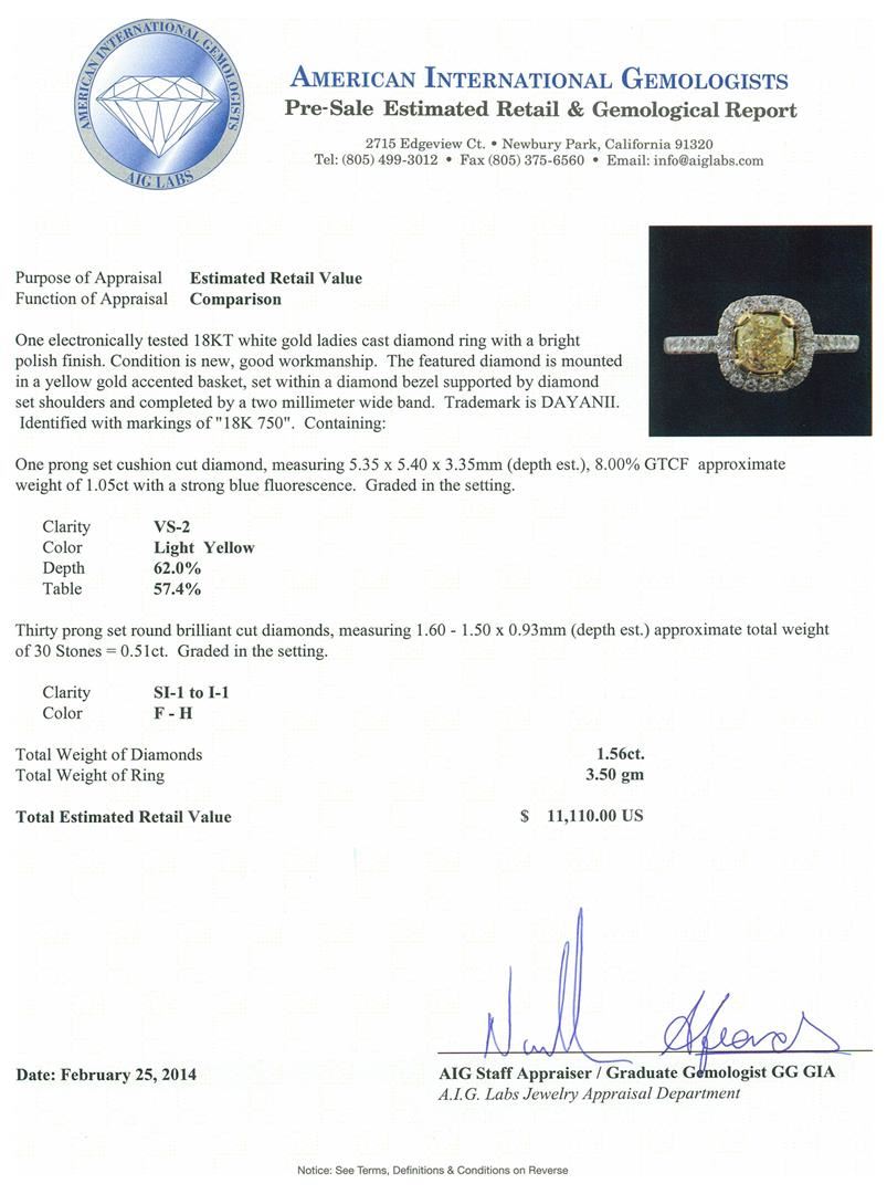 One electronically tested 18KT white gold ladies cast diamond ring with a bright polish finish. Condition is new, good workmanship. The featured diamond is mounted in a yellow gold accented basket, set within a diamond bezel supported by diamond set shoulders and completed by a two millimeter wide band. Trademark is DAYANII. Identified with markings of "18K 750". Containing: One prong set cushion cut diamond, measuring 5.35 x 5.40 x 3.35mm (depth est.), 8.00% GRCF approximate weight of 1.05ct with a strong blue fluorescence. Graded in the setting. Clarity VS-2 Color Light Yellow Depth 62.0% Table 57.4% Thirty prong set round brilliant cut diamonds, measuring 1.60 - 1.50 x 0.93mm (depth est.) approximate total weight of 30 Stones = 0.51ct. Graded in the setting. Clarity SI-1 to I-1 Color F -H Total Weight of Diamonds 1.56ct. Total Weight of Ring 3.50 grams. AIG appraised at $11,110.00. AIG Appraised at $11,110.00.