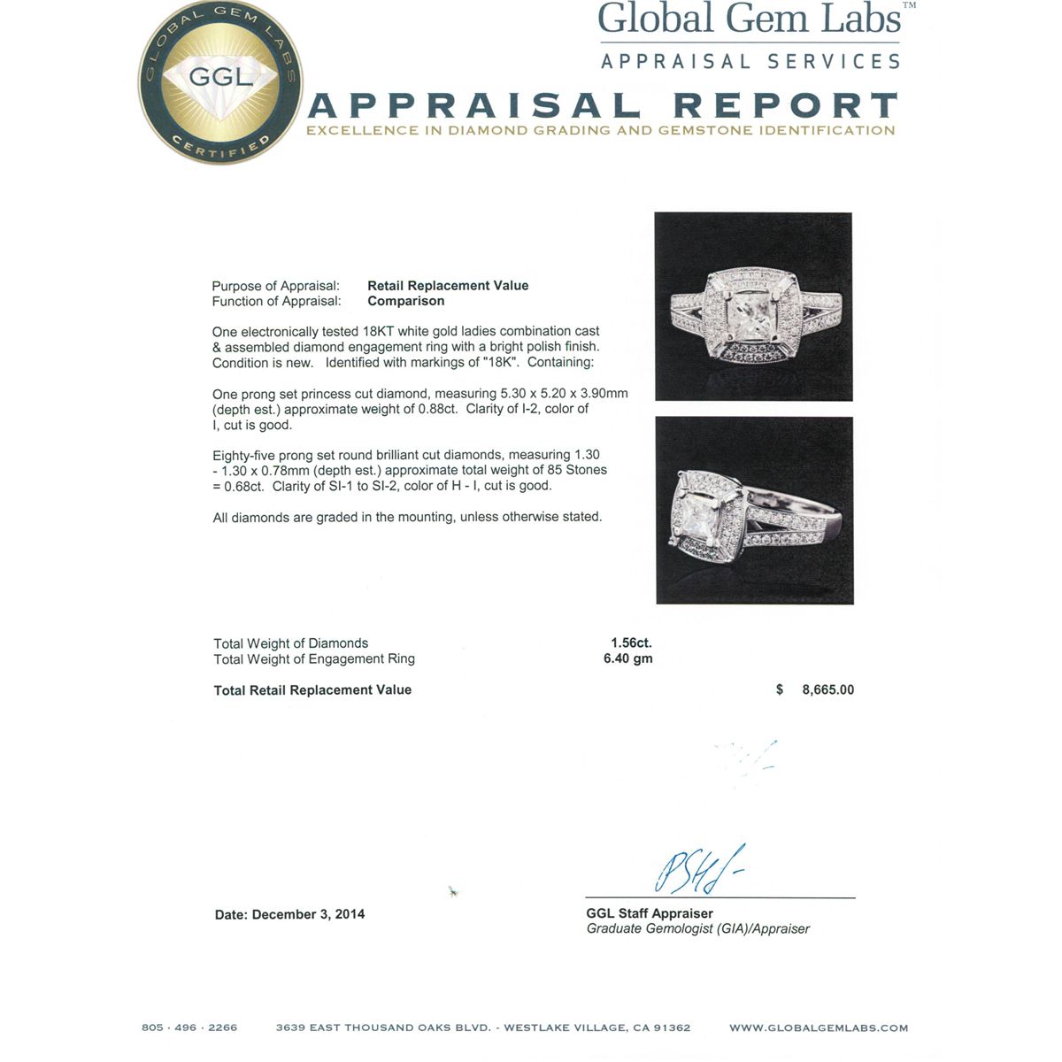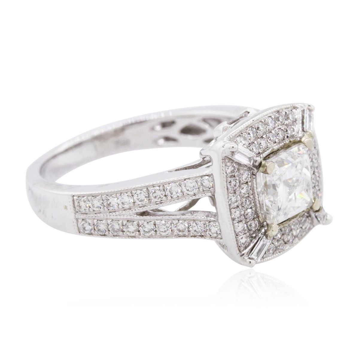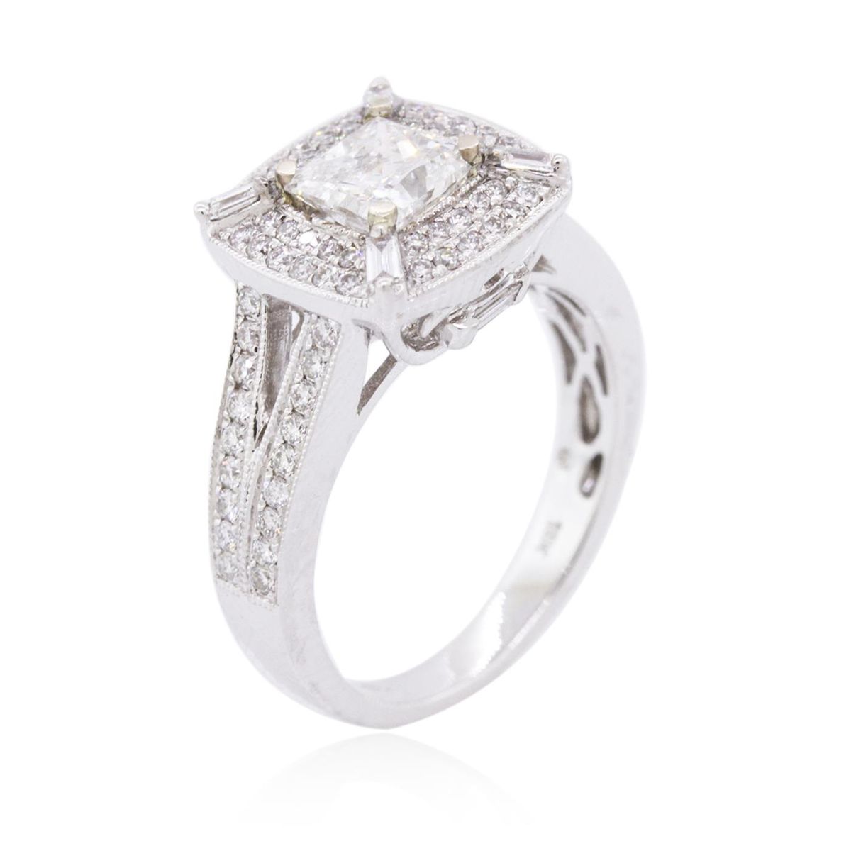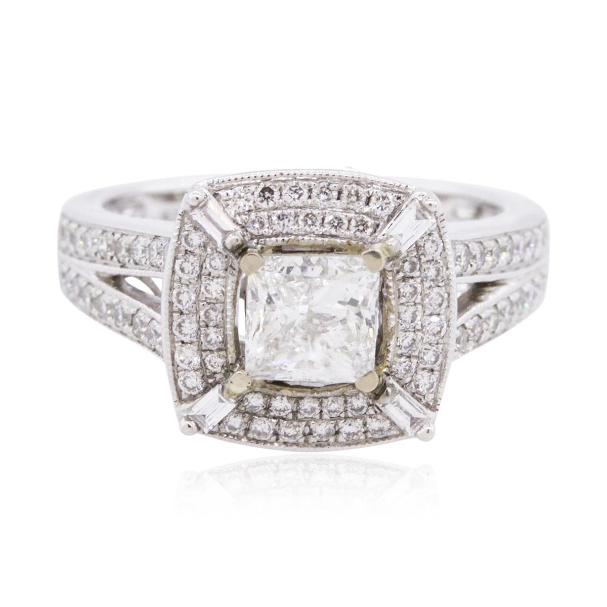 One electronically tested 18KT white gold ladies combination cast & assembled diamond engagement ring with a bright polish finish. Identified with markings of "18K". Condition is new. Containing: One prong set princess cut diamond, measuring 5.30 x 5.20 x 3.90mm (depth est.) approximate weight of 0.88ct. Clarity: I-2. Color: I, Cut is Good. Eighty-Five prong set round brilliant cut diamonds, measuring 1.30 - 1.30 x 0.78mm (depth est.) approximate total weight of 85 Stones = 0.68ct. Clarity: SI-1 to SI-2. Color: H - I, Cut is Good. All diamonds are graded in the mounting, unless otherwise stated. Total Weight of Diamonds 1.56ct. Total Weight of Engagement Ring 6.40 grams. GGL Appraised at $8,665.00.