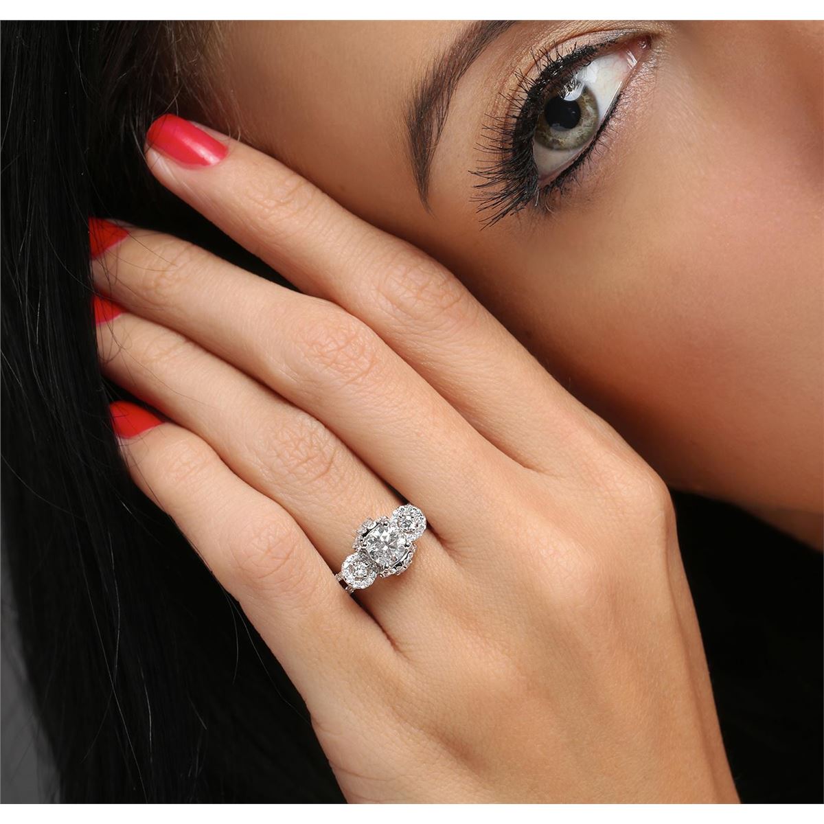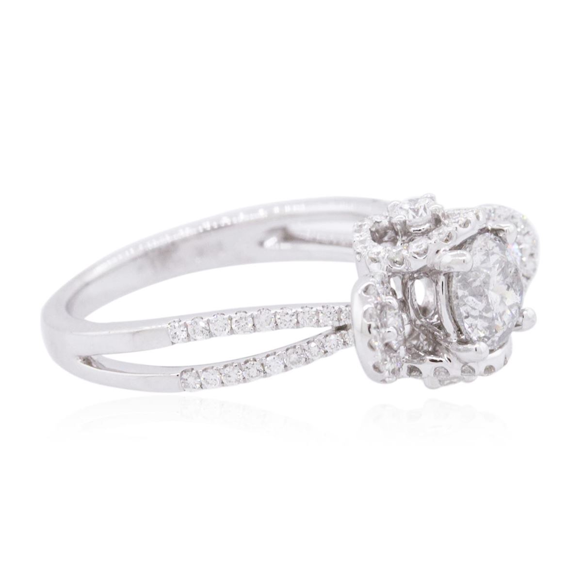 One electronically tested 18KT white gold ladies cast diamond unity ring with a bright polish finish. The featured diamond is cathedral set within a stylized floral basket supported by diamond set split shoulders, completed by a two millimeter wide band. Identified with markings of "18K". Condition is new, good workmanship. Containing: One prong set round brilliant cut diamond, measuring 5.60 - 5.55 x 3.35mm (depth est.), 6.00.%. GTCF approximate weight of 0.77ct with a faint blue fluorescence. Graded in the setting. Clarity: I-1. Color: G. Depth 60.1%. Table 59.3%. Four prong set round brilliant cut diamonds, measuring 2.40 - 2.30 x 1.41mm (depth est.) approximate total weight of 4 Stones = 0.25ct. Graded in the setting. Clarity: VS-2 to SI-1. Color: G - I Ninety-Two prong set round brilliant cut diamonds, measuring 1.20 - 1.00 x 0.66mm (depth est.) approximate total weight of 92 Stones = 0.54ct. Graded in the setting. Clarity: VS-2 to SI-2. Color: G - I. Total Weight of Diamonds 1.56ct. Total Weight of Ring 4.55 grams. AIG Appraised at $11,345.00.