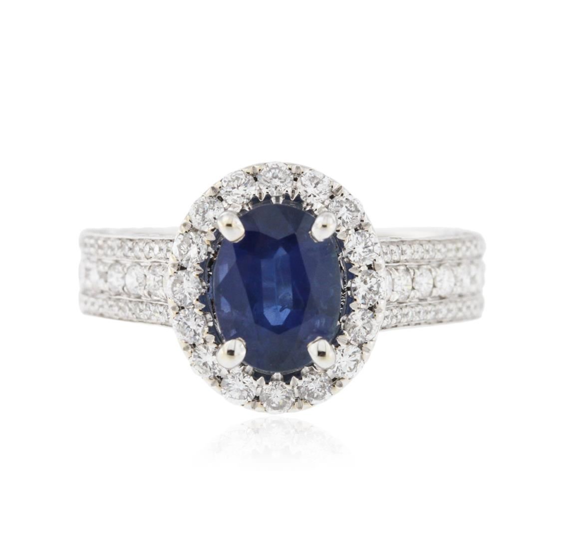 One electronically tested 18KT white gold ladies cast sapphire and diamond ring with a bright polish finish. Identified with markings of "18K". Condition is new. Containing: One prong set oval modified brilliant cut natural blue sapphire, measuring 8.00 x 6.00 x 3.90mm, approximate weight of 1.57ct., clarity is slightly included, type II, medium, moderately strong, blue color, (GIA B 5/4), cut is good. Two Hundred Thirty-Eight prong set round brilliant cut diamonds, measuring 1.80 - 1.10 x 0.87mm (depth est.) approximate total weight of 238 Stones = 1.34ct. Clarity: SI-1 to SI-2. Color: I - J, Cut is Good. Colored gemstones are presumed to have been subjected to commonly used enhancement processes. All diamonds and colored gemstones are graded in the mounting, unless otherwise stated. Total Weight of Colored Stones 1.57ct. Total Weight of Diamonds 1.34ct. Total Weight of Ring 5.30 grams. GGL Appraised at $5,095.00.