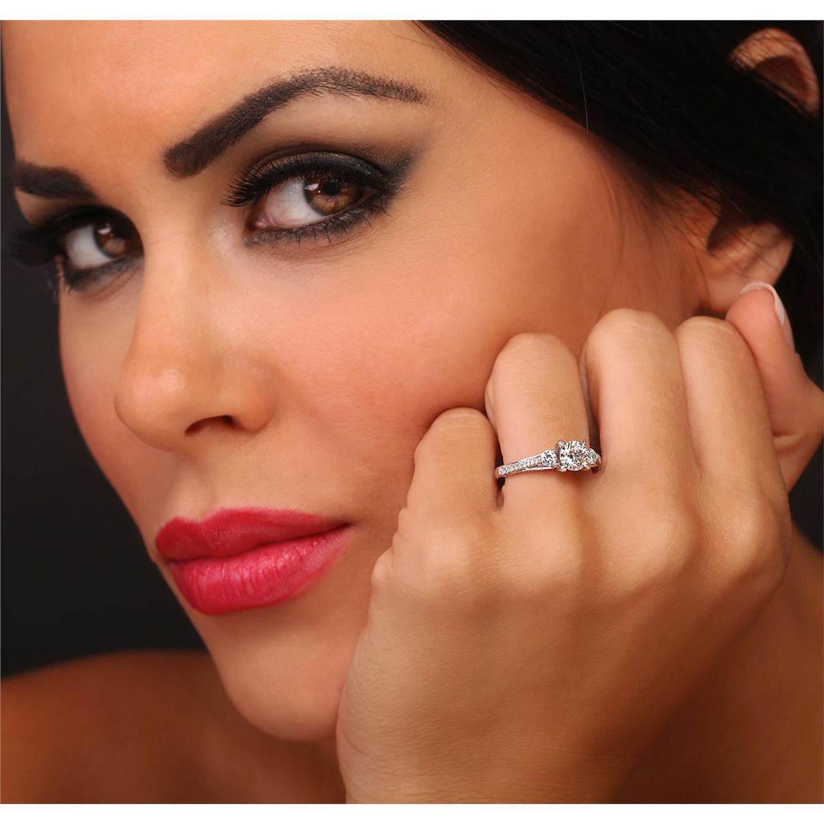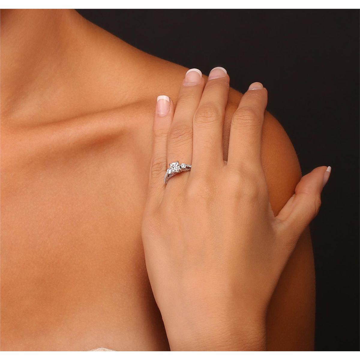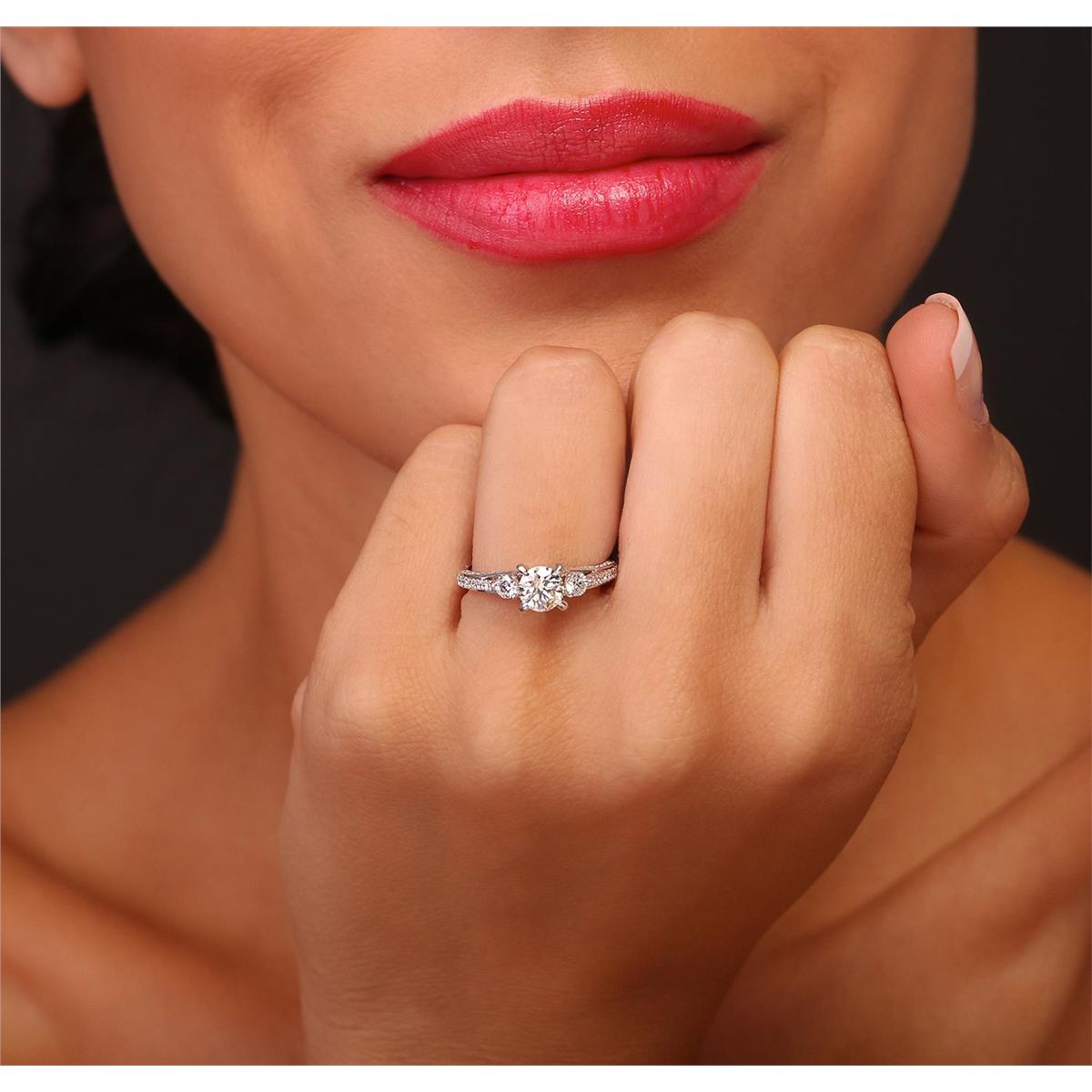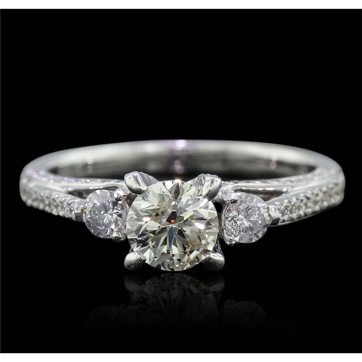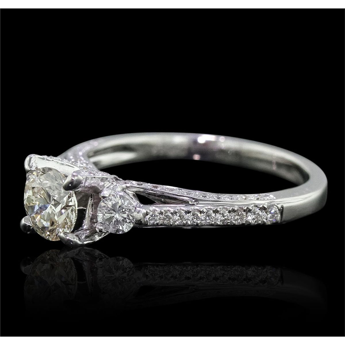 One electronically tested 18KT white gold Ladies combination cast & assembled engagement ring with a bright polish finish. Condition is new. Identified with markings of "750". Containing: One prong set round brilliant cut diamond, measuring 5.60 - 5.50 x 3.87mm (depth est.) approximate weight of 0.73ct. Clarity: SI-2. Color: L, Cut is Good. Two prong set round brilliant cut diamonds, measuring 3.00 - 3.00 x 1.80mm (depth est.) approximate. Total Weight of 2 Stones = 0.20ct. Clarity: I-1 to I-2. Color: I - J, Cut is Good. Eighty prong set round brilliant cut diamonds, measuring 1.30 - 1.30 x 0.78mm (depth est.) approximate. Total Weight of 80 Stones = 0.64ct. Clarity: SI-2 to I-1. Color: I - J, Cut is Good. Diamonds graded in the mounting. Total Weight of Diamonds 1.57ct. Total Weight of Ring 3.70 grams. GGL Appraised at $7,670.00.