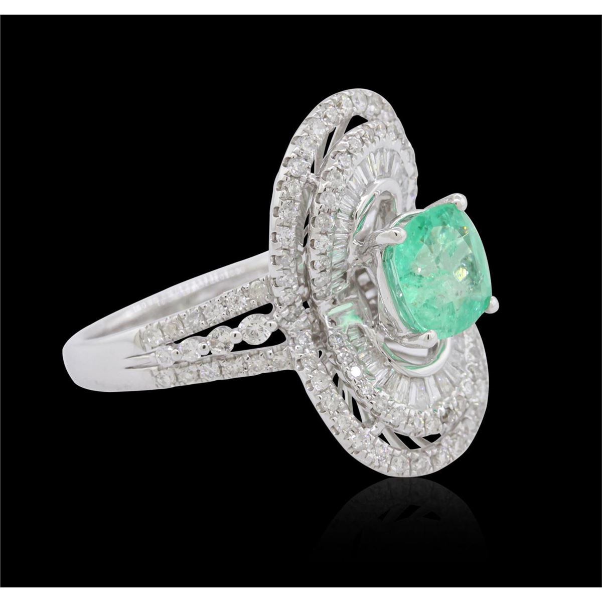 One ring featuring: 18KT white gold weighing 7.00 grams containing one emerald center stone with a total weight of 1.59ct and round and baguette diamonds with a total weight of 0.77cts.