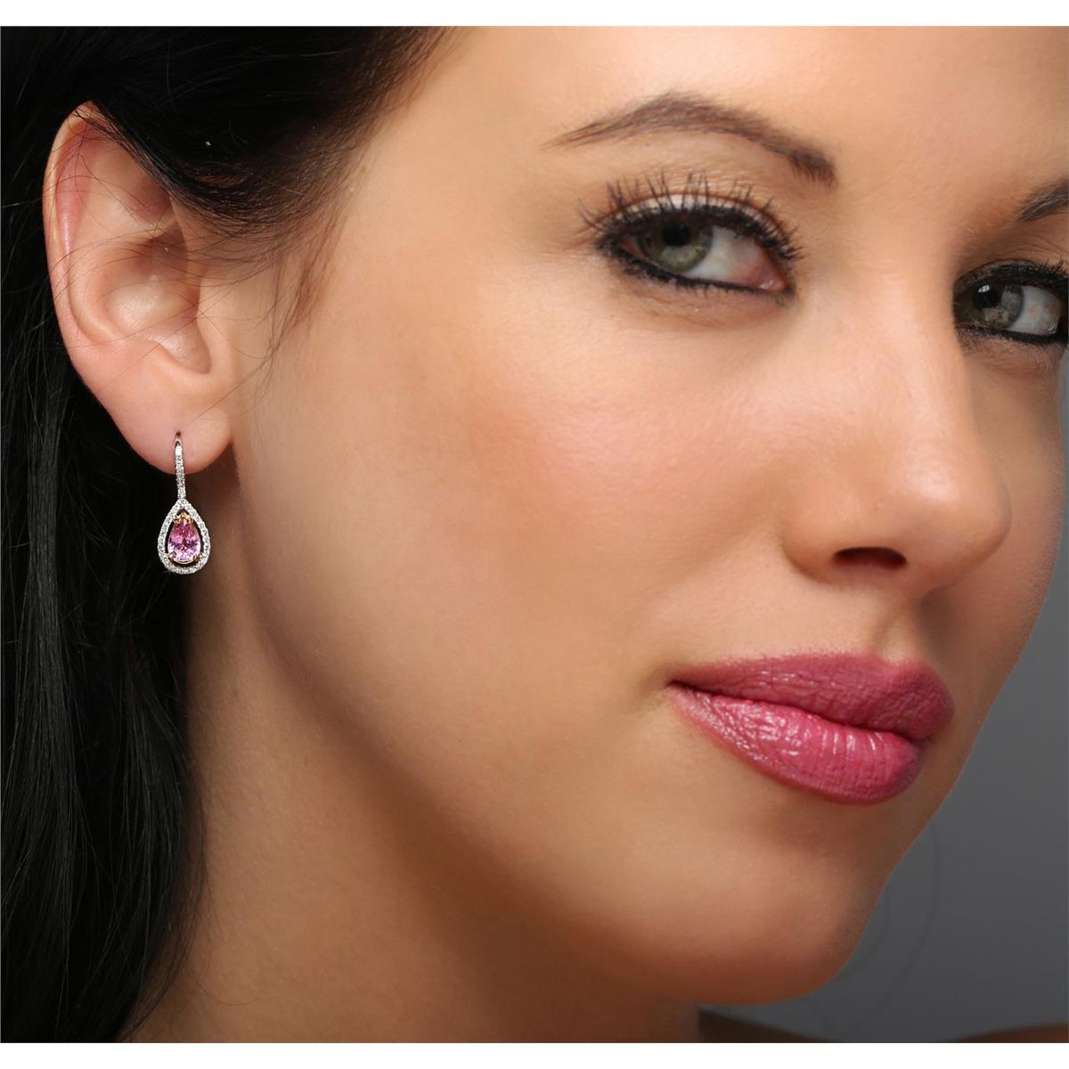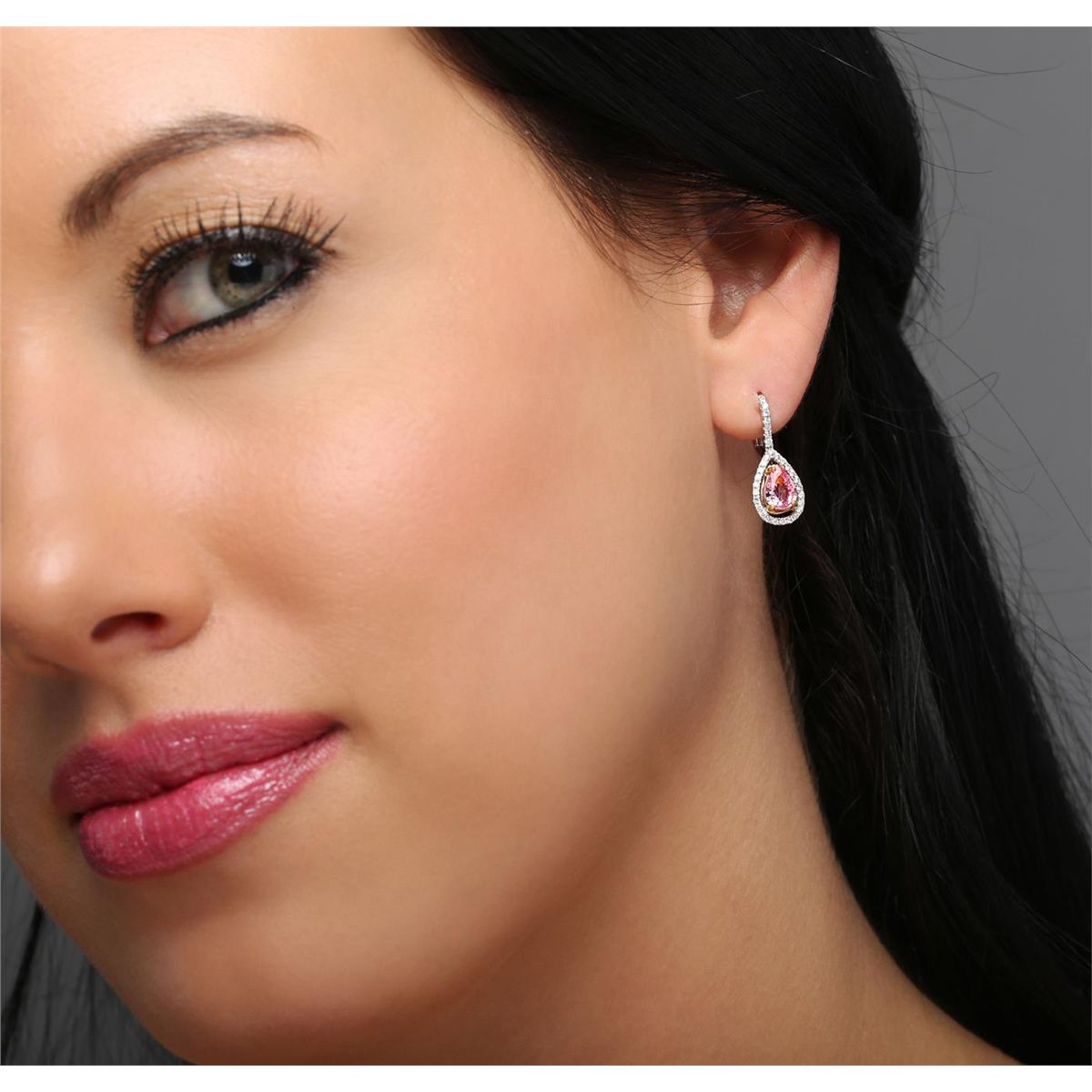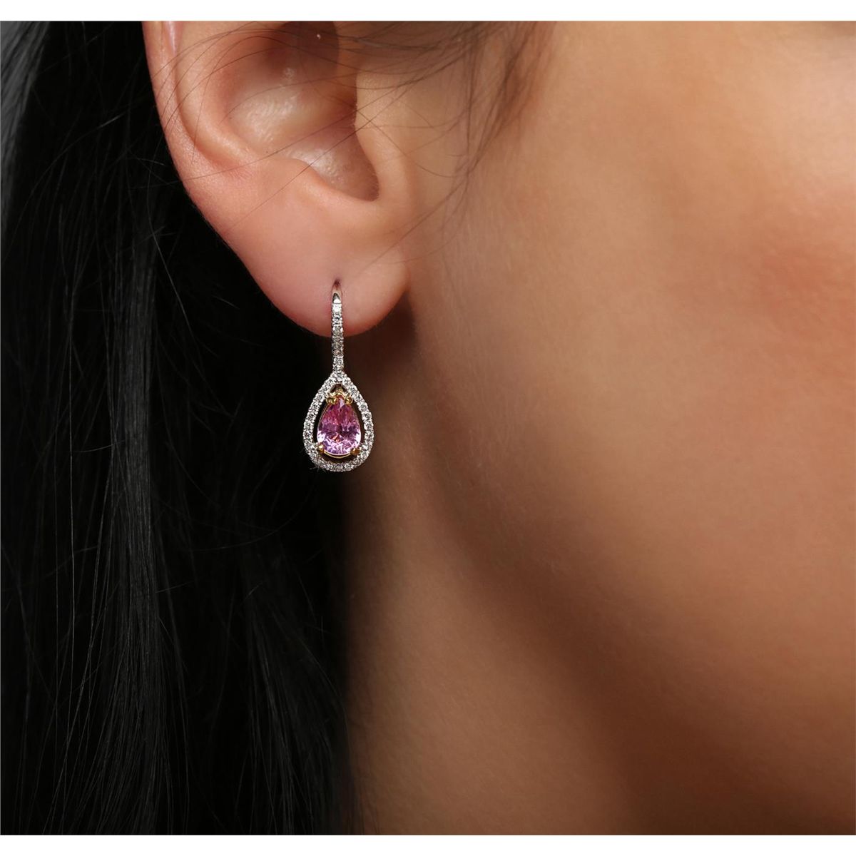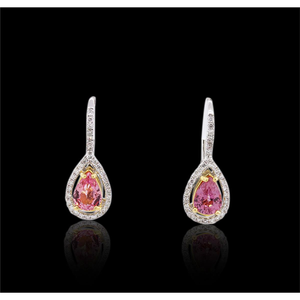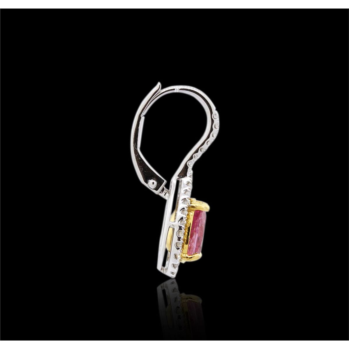 One pair of earrings featuring: 18KT white gold weighing 3.10 grams containing two pink sapphires with a total weight of 1.59cts and 62 round cut diamonds with a total weight of 0.33cts.