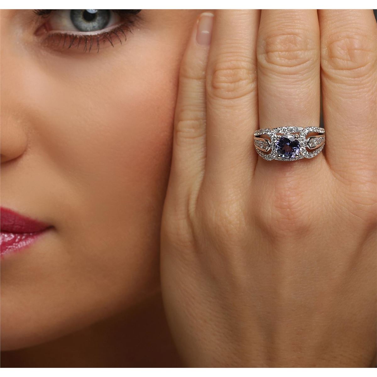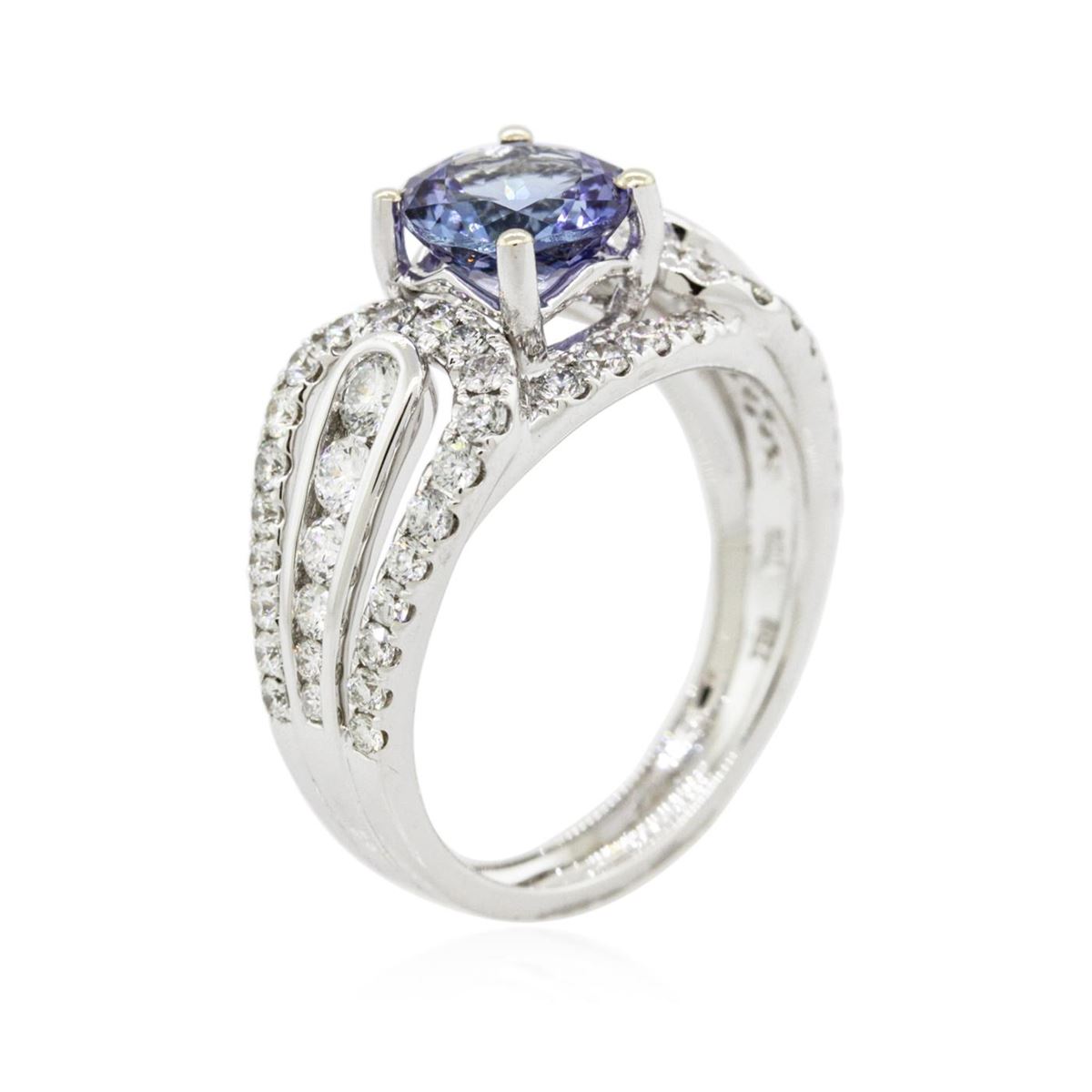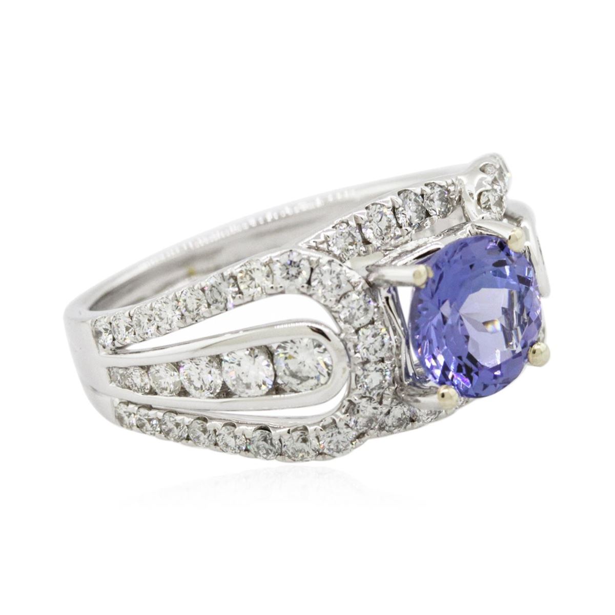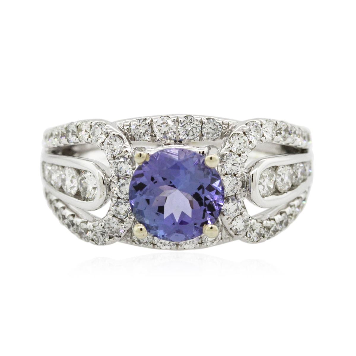 One electronically tested 18KT White Gold ladies cast tanzanite and diamond ring with a bright polish finish. The featured tanzanite is supported by elaborate diamond set shoulders, completed by a grooved three millimeter wide band. Identified with markings of "18K 750". Condition is new, good workmanship. Containing: One prong set round brilliant cut natural tanzanite, measuring 7.10 - 7.05 x 4.40 mm, 8% bulge factor, approximate weight of 1.60ct., clarity is eye clean, type I, dark, very slightly grayish, violetish blue color, (GIA vB 7/3), cut is good. Transmitting light with no distortion, transparent. Graded in the setting. Tanzanite is a very rare gemstone that is only found in the country of Tanzania. Originally discovered in 1967. Tiffany & Company, named the stone Tanzanite. It is found in the Usumburu Mountains that border the Umba Valley of northern Tanzania. Tanzanite occurs in gray, brown, violet, blue, reddish-purple, & green. The gem is interesting because of its exceptional pleochroism. Rotated in different directions a tanzanite will exhibit multiple changes of color. Tanzanite has a low tolerance to ultrasonic cleaning, and should not be cleaned using this method. Sixty-Two prong and channel set round brilliant cut diamonds approximate total weight of 62 Stones = 1.13ct. Graded in the setting. Clarity: VS-1 to SI-1. Color: H - J. Total Weight of Colored Stones 1.60ct. Total Weight of Diamonds 1.13ct. Total Weight of Ring 5.58 grams. AIG Appraised at $8,380.00.