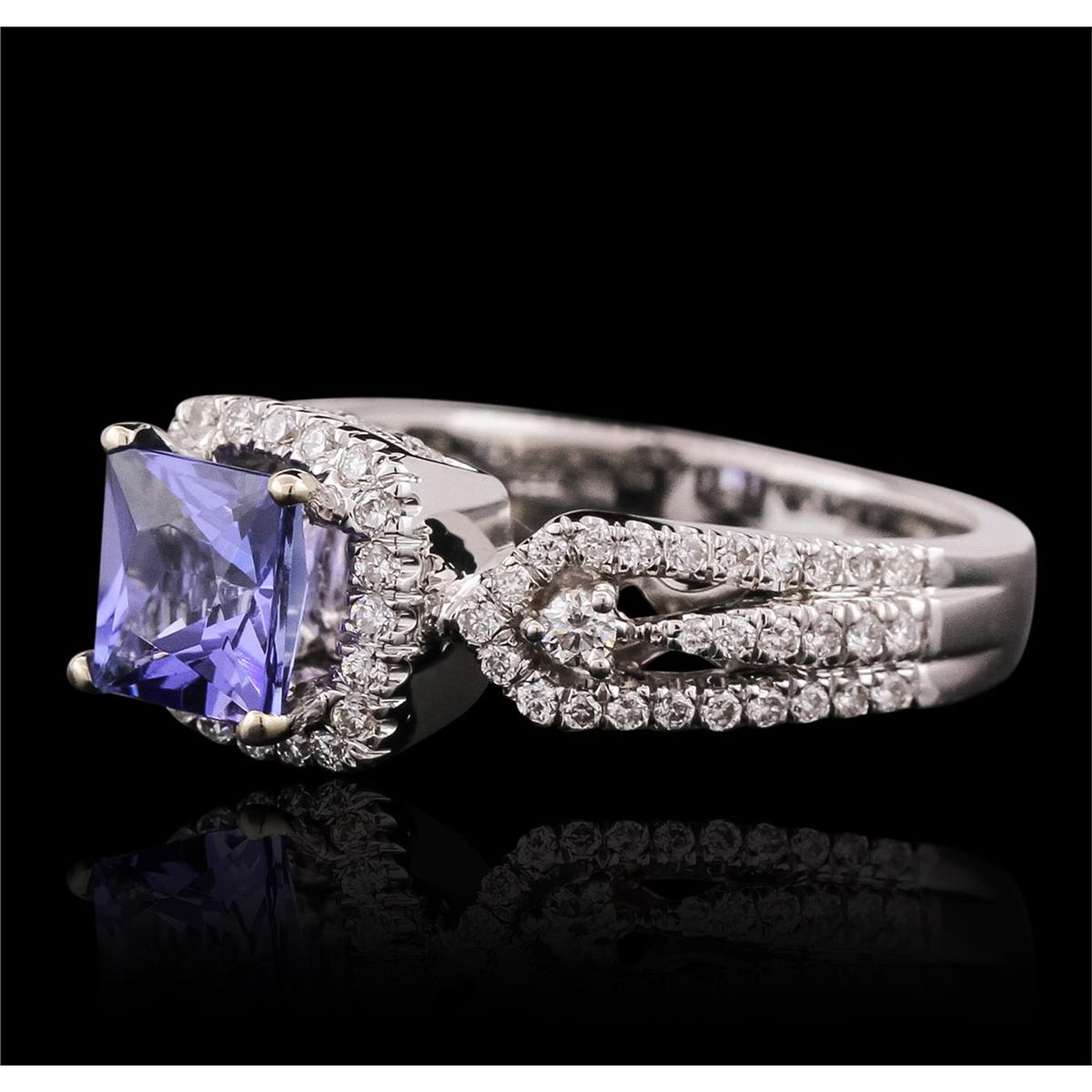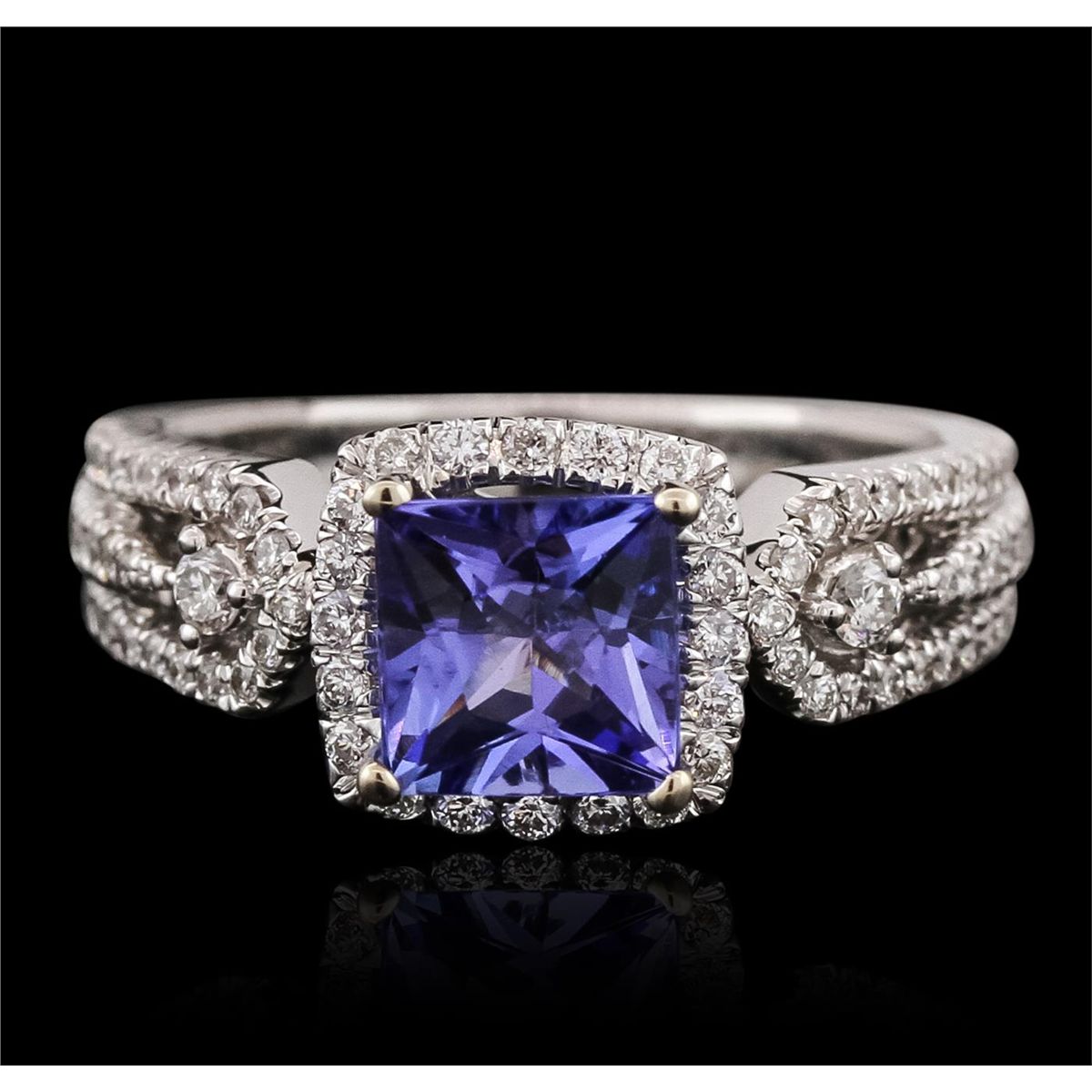 One electronically tested 18KT White Gold ladies cast tanzanite and diamond ring with a bright polish finish. The featured tanzanite is set within a diamond bezel supported by elaborate diamond set shoulders, completed by a two and one-half millimeter wide band. Identified with markings of "18K 750". Condition is new, good workmanship. Containing: One prong set square brilliant cut natural tanzanite, measuring 6.40 x 6.35 x 4.40mm, 8% bulge factor, approximate weight of 1.62ct., clarity is eye clean, type I, medium dark, very slightly grayish, bluish violet color, (GIA bV 6/3), cut is good. Transmitting light with no distortion, transparent. Graded in the setting. Tanzanite is a very rare gemstone that is only found in the country of Tanzania. Originally discovered in 1967. Tiffany & Company, named the stone Tanzanite. It is found in the Usumburu Mountains that border the Umba Valley of northern Tanzania. Tanzanite occurs in gray, brown, violet, blue, reddish-purple, & green. The gem is interesting because of its exceptional pleochroism. Rotated in different directions a tanzanite will exhibit multiple changes of color. Tanzanite has a low tolerance to ultrasonic cleaning, and should not be cleaned using this method. Eighty prong set round brilliant cut diamonds approximate total weight of 80 Stones = 0.53ct. Graded in the setting. Clarity: VS-1 to SI-1. Color: H - J. Total Weight of Colored Stones 1.62ct. Total Weight of Diamonds 0.53ct. Total Weight of Ring 7.83 grams. AIG Appraised at $7,305.00.