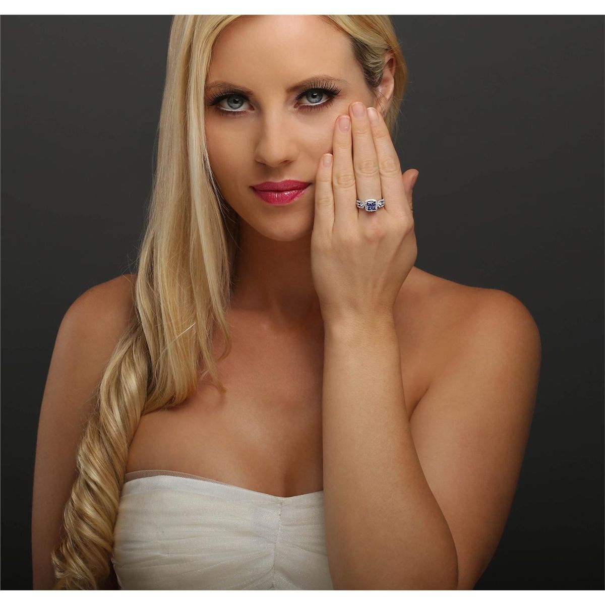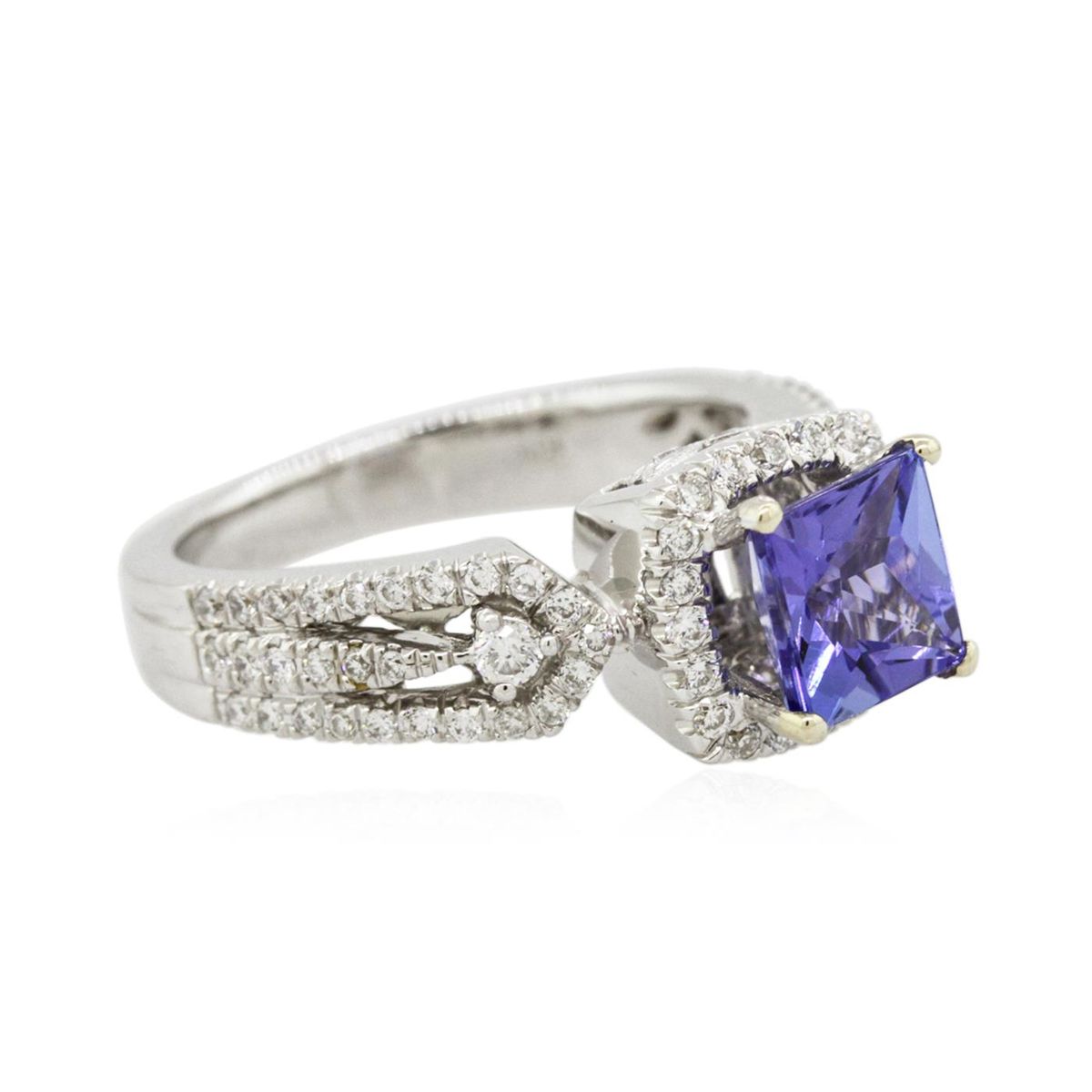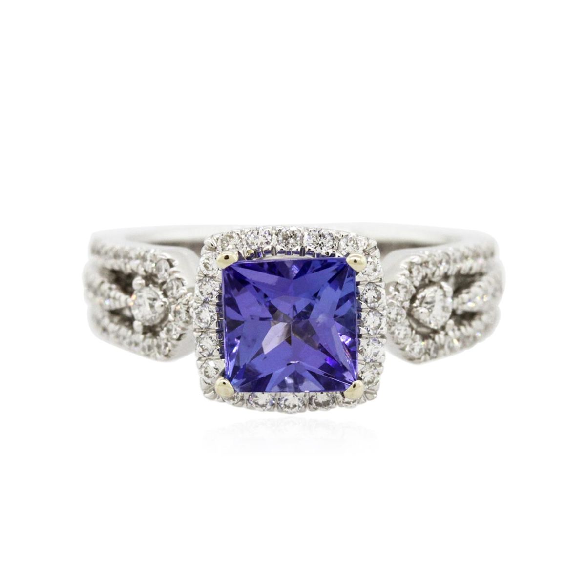 One electronically tested 18KT White Gold ladies cast tanzanite and diamond ring with a bright polish finish. The featured tanzanite is set within a diamond bezel supported by elaborate diamond set shoulders, completed by a two and one-half millimeter wide band. Identified with markings of "18K 750". Condition is new, good workmanship. Containing: One prong set square brilliant cut natural tanzanite, measuring 6.40 x 6.35 x 4.40mm, 8% bulge factor, approximate weight of 1.62ct., clarity is eye clean, type I, medium dark, very slightly grayish, bluish violet color, (GIA bV 6/3), cut is good. Transmitting light with no distortion, transparent. Graded in the setting. Tanzanite is a very rare gemstone that is only found in the country of Tanzania. Originally discovered in 1967. Tiffany & Company, named the stone Tanzanite. It is found in the Usumburu Mountains that border the Umba Valley of northern Tanzania. Tanzanite occurs in gray, brown, violet, blue, reddish-purple, & green. The gem is interesting because of its exceptional pleochroism. Rotated in different directions a tanzanite will exhibit multiple changes of color. Tanzanite has a low tolerance to ultrasonic cleaning, and should not be cleaned using this method. Eighty prong set round brilliant cut diamonds approximate total weight of 80 Stones = 0.53ct. Graded in the setting. Clarity: VS-1 to SI-1. Color: H - J. Total Weight of Colored Stones 1.62ct. Total Weight of Diamonds 0.53ct. Total Weight of Ring 7.83 grams. AIG Appraised at $7,305.00.