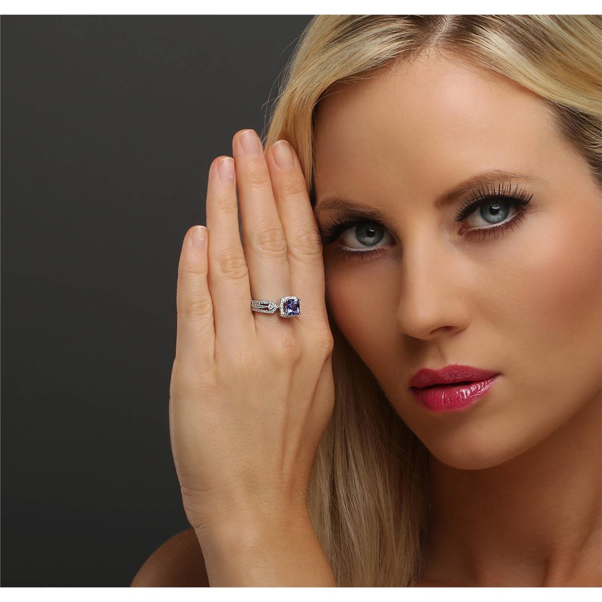 One electronically tested 18KT White Gold ladies cast tanzanite and diamond ring with a bright polish finish. The featured tanzanite is set within a diamond bezel supported by elaborate diamond set shoulders, completed by a two and one-half millimeter wide band. Identified with markings of "18K 750". Condition is new, good workmanship. Containing: One prong set square brilliant cut natural tanzanite, measuring 6.40 x 6.35 x 4.40mm, 8% bulge factor, approximate weight of 1.62ct., clarity is eye clean, type I, medium dark, very slightly grayish, bluish violet color, (GIA bV 6/3), cut is good. Transmitting light with no distortion, transparent. Graded in the setting. Tanzanite is a very rare gemstone that is only found in the country of Tanzania. Originally discovered in 1967. Tiffany & Company, named the stone Tanzanite. It is found in the Usumburu Mountains that border the Umba Valley of northern Tanzania. Tanzanite occurs in gray, brown, violet, blue, reddish-purple, & green. The gem is interesting because of its exceptional pleochroism. Rotated in different directions a tanzanite will exhibit multiple changes of color. Tanzanite has a low tolerance to ultrasonic cleaning, and should not be cleaned using this method. Eighty prong set round brilliant cut diamonds approximate total weight of 80 Stones = 0.53ct. Graded in the setting. Clarity: VS-1 to SI-1. Color: H - J. Total Weight of Colored Stones 1.62ct. Total Weight of Diamonds 0.53ct. Total Weight of Ring 7.83 grams. AIG Appraised at $7,305.00.