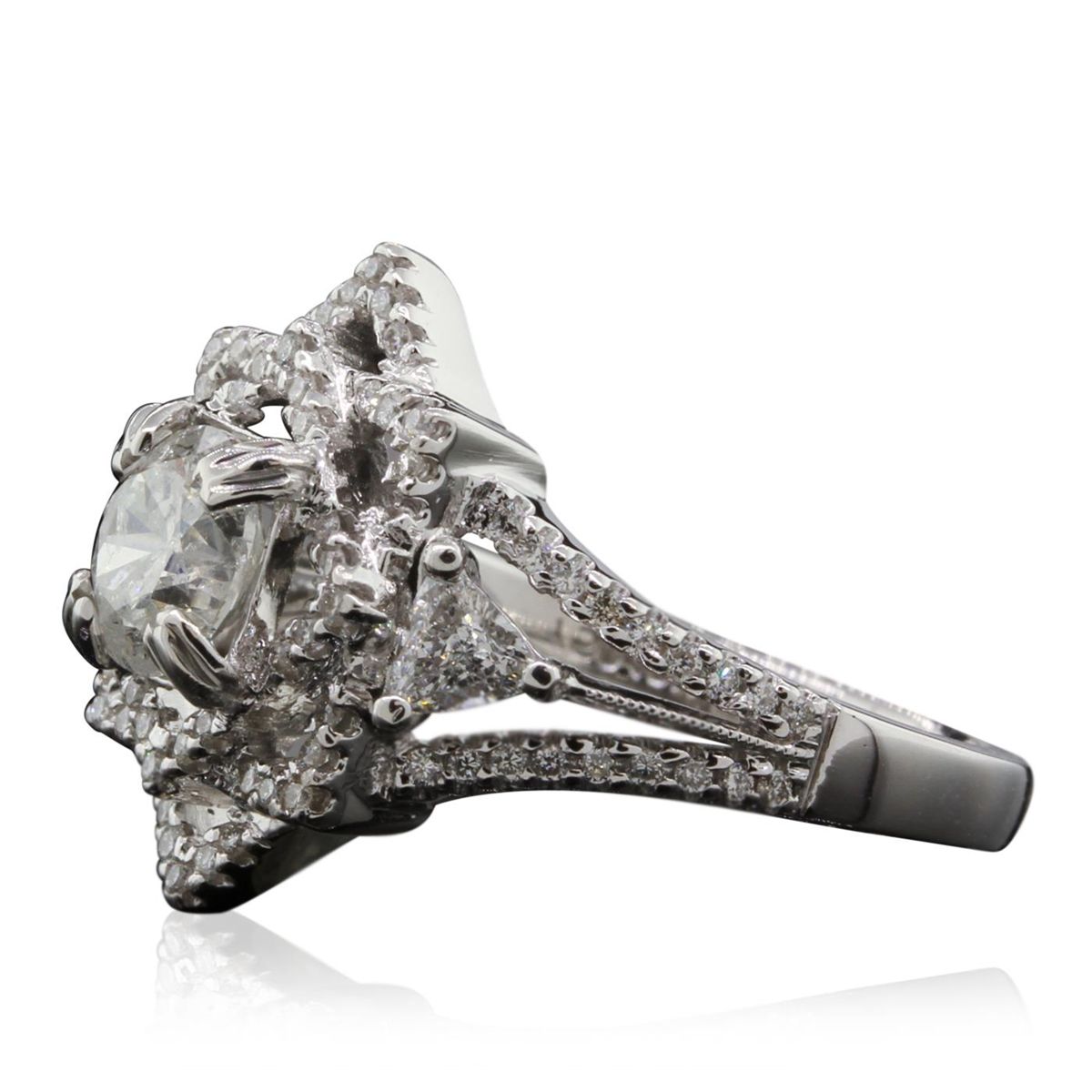 One electronically tested 18KT White Gold ladies cast diamond ring with a bright polish finish. Condition is new, good workmanship. The ring features a diamond set within an elaborate diamond lattice gallery supported by diamond set split shoulders, completed by a two and one-half millimeter wide band. Identified with markings of "18K 750". Containing: One prong set round brilliant cut diamond, measuring 6.25 - 6.20 x 3.90mm (depth est.) approximate weight of 1.03ct. Graded in the setting. Clarity: I-1. Color: I. Depth: 62.6%. Table 61.0%. Two prong set triangle brilliant cut diamonds, measuring 3.70 x 3.60 x 1.90mm (depth est.) approximate. Total Weight of 2 Stones = 0.30ct. Graded in the setting. Clarity: VS-1 to VS-2. Color: G - H. Eighty-Six prong set round brilliant cut diamonds, measuring 1.00 - 0.90 x 0.57mm (depth est.) approximate. Total Weight of 86 Stones = 0.29ct. Graded in the setting. Clarity: VS-2 to SI-2. Color: G - I. Total Weight of Diamonds 1.62ct. Total Weight of Ring 7.41gm. AIG Appraised at $19,750.00.