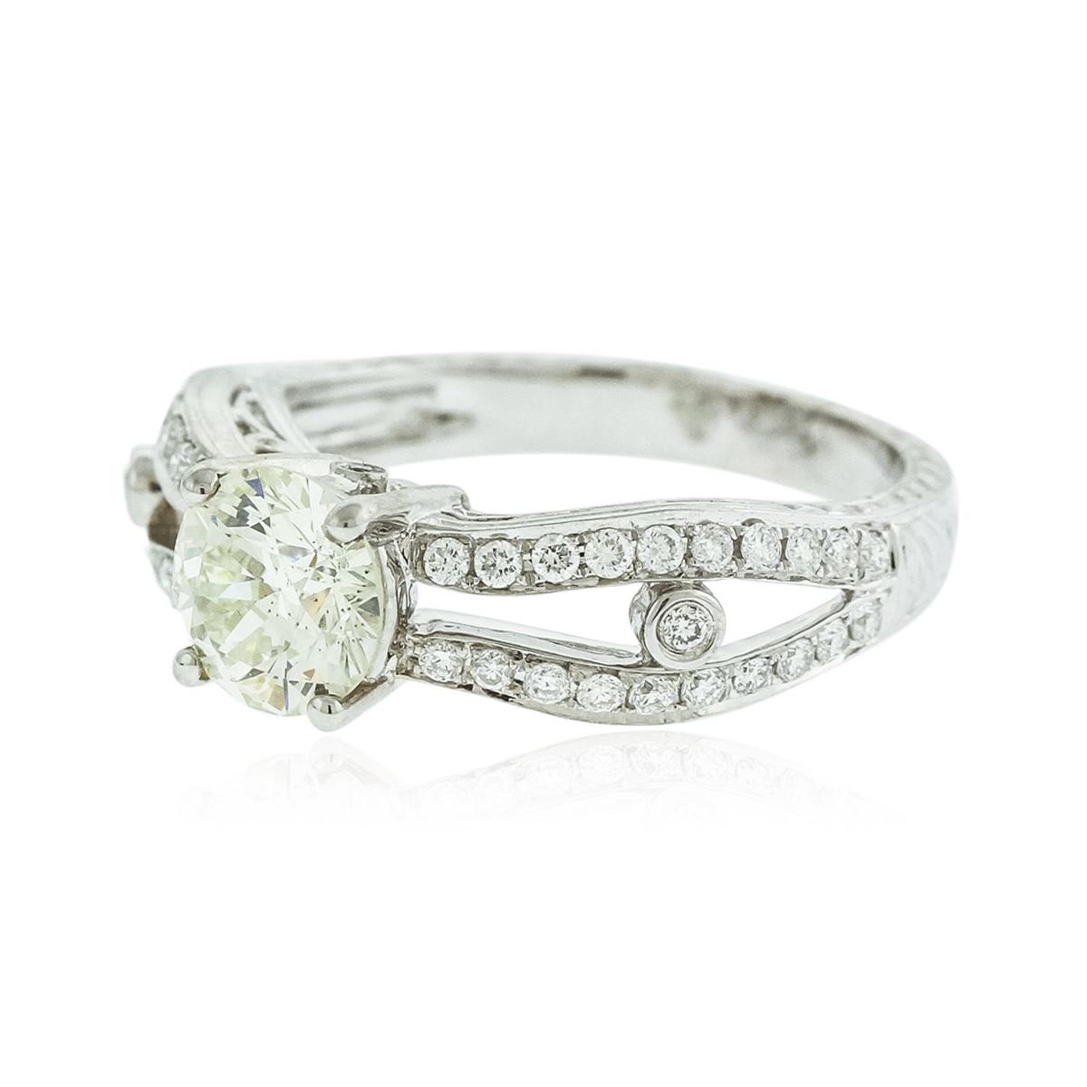 One electronically tested 18KT white gold Ladies combination cast & assembled engagement ring with a bright polish finish. Condition is new. Identified with markings of "18K". Containing: One prong set round brilliant cut diamond, measuring 6.70 - 6.69 x 4.00mm (depth est.) approximate weight of 1.09ct. Clarity: SI-2. Color: M, Cut is Very Good. Forty-Four prong set round brilliant cut diamonds, measuring 1.50 - 1.50 x 0.90mm (depth est.) approximate. Total Weight of 44 Stones = 0.54ct. Clarity: I-1. Color: I - J, Cut is Good. Total Weight of Diamonds 1.64ct. Total Weight of Engagement Ring 5.00 grams. GGL Appraised at $15,570.00.