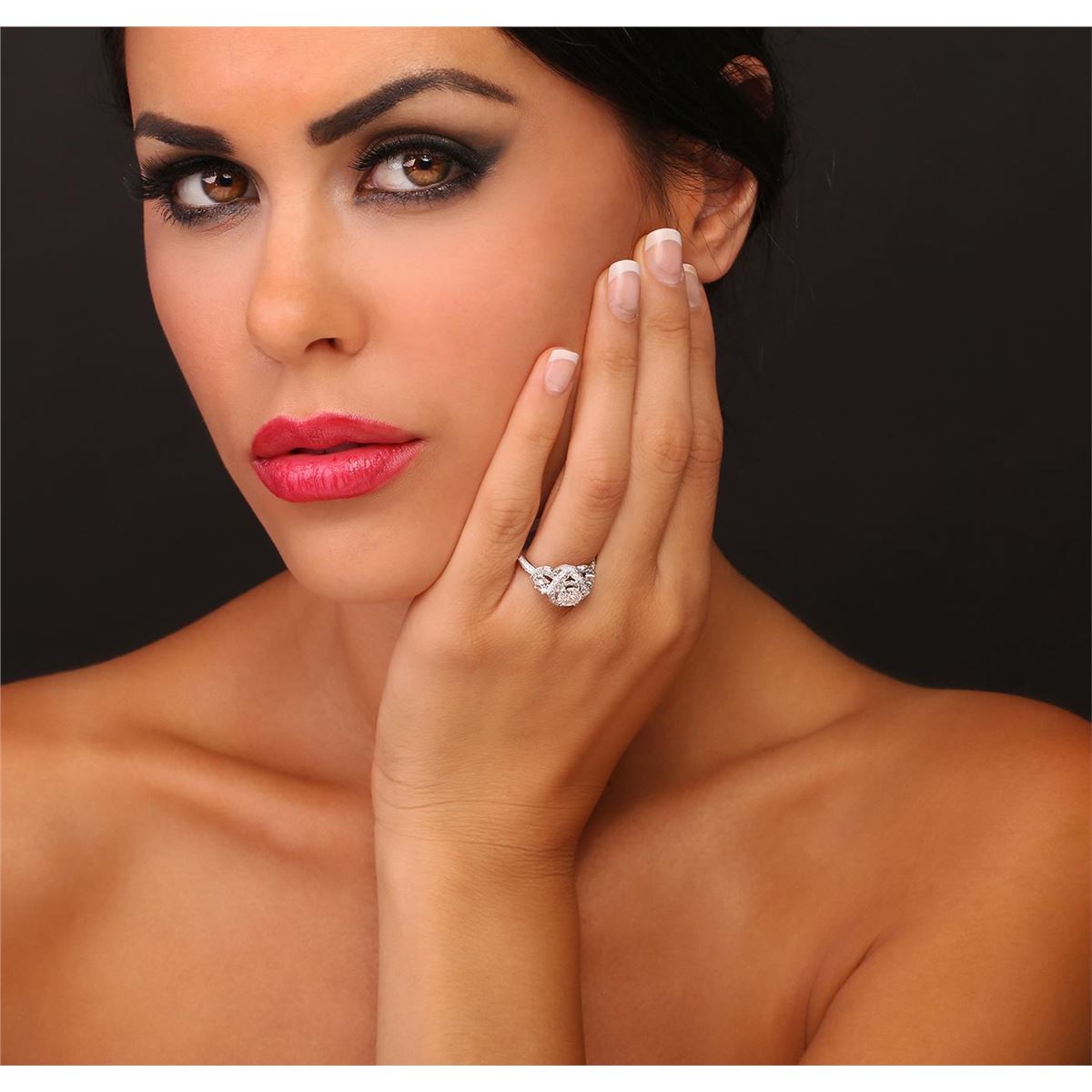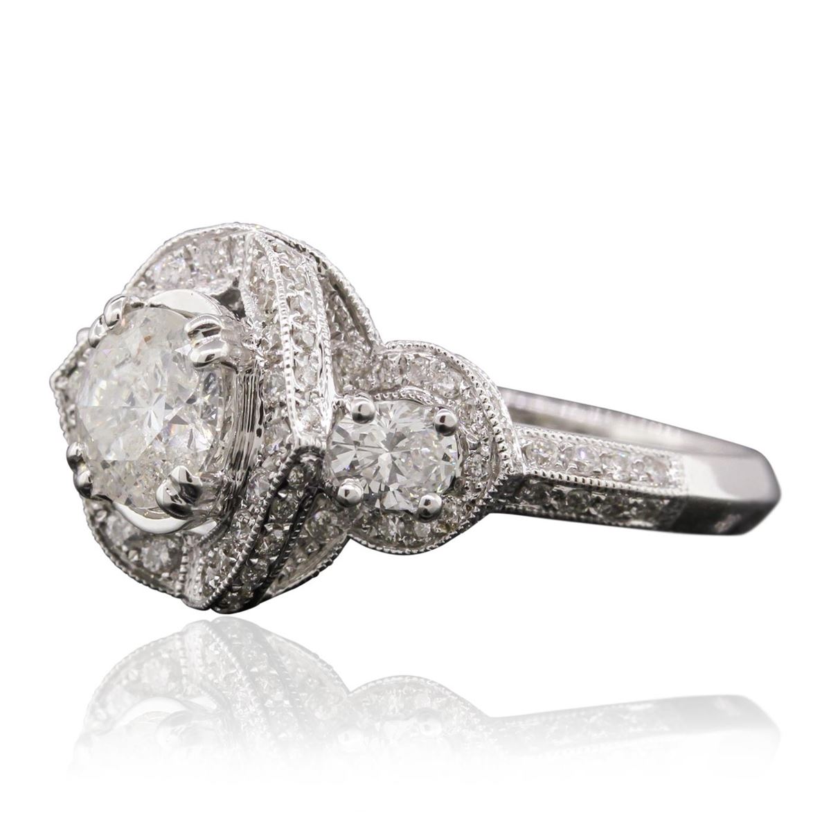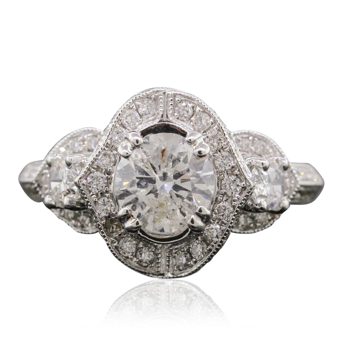 One electronically tested 18KT white gold Ladies combination cast & assembled engagement ring with a bright polish finish. Condition is new. Identified with markings of "18K". Containing: One prong set round brilliant cut diamond, measuring 6.30 - 6.30 x 3.70mm (depth est.) approximate weight of 0.90ct. Clarity: I-3. Color: I, Cut is Good. Two prong set oval shaped cut diamonds, measuring 4.10 x 3.40 x 2.14mm (depth est.) approximate. Total Weight of 2 Stones = 0.37ct. Clarity: VS-1 to VS-2. Color: I - J, Cut is Very Good. Seventy-Eight bead set round brilliant cut diamonds, measuring 1.10 - 1.10 x 0.66mm (depth est.) approximate. Total Weight of 78 Stones = 0.37ct. Clarity: I-1. Color: I - J, Cut is Good. Total Weight of Diamonds 1.64ct. Total Weight of Engagement Ring 6.50 grams. GGL Appraised at $8,770.00.