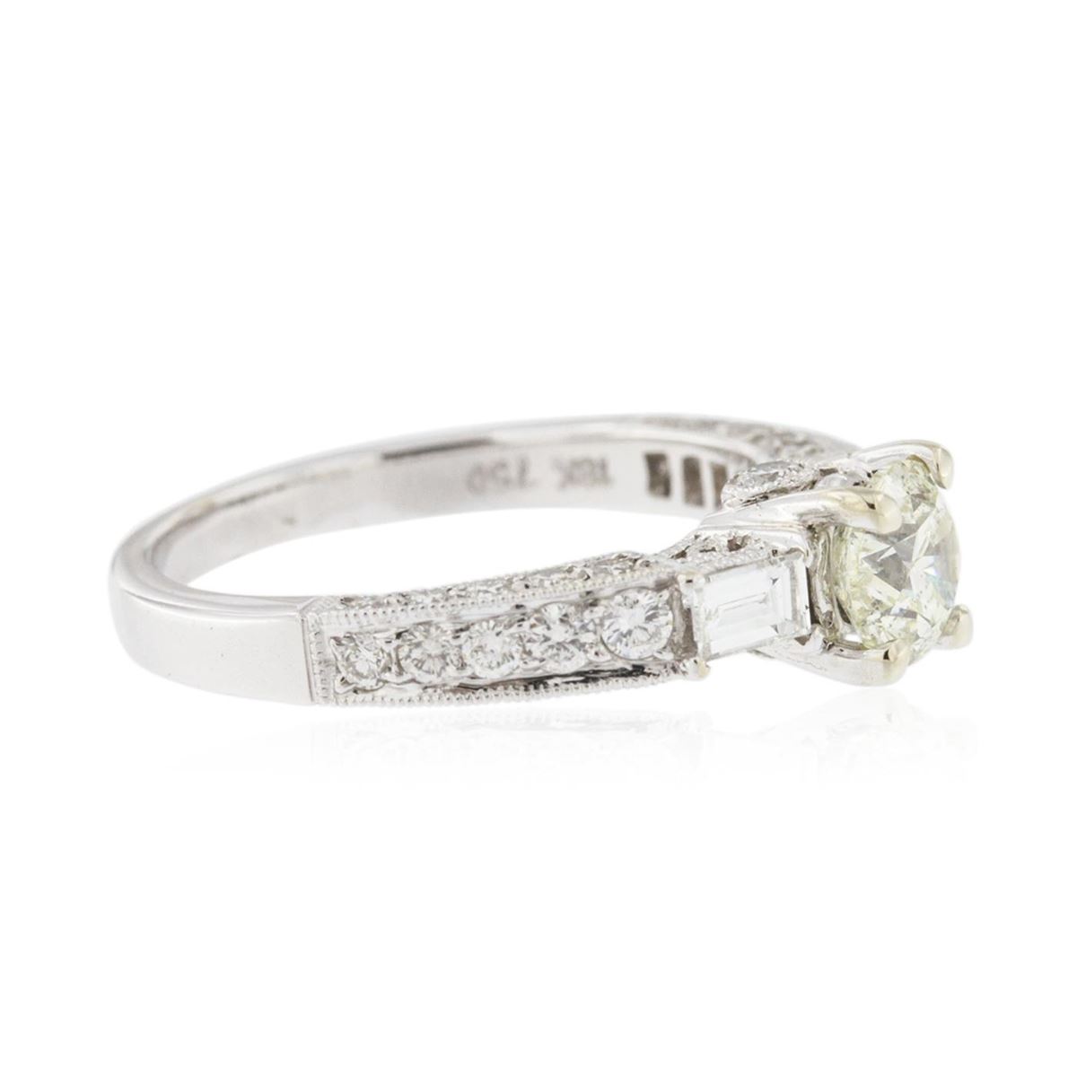 One electronically tested 18KT white gold ladies cast diamond unity ring. Condition is new, good workmanship. The featured diamond is supported by diamond set shoulders, completed by a two millimeter wide band. Bright polish finish with milgrain detailing. Identified with markings of "18K 750". Containing: One prong set round brilliant cut diamond, measuring 5.45 - 5.40 x 3.90mm (depth est.) approximate weight of 0.80ct with a medium blue fluorescence. Graded in the setting. Clarity: I-1 . Color: L Depth 71.8%. Table 55.3%. Thirty-Four prong and bezel set round brilliant & baguette cut diamonds approximate. Total Weight of 34 Stones = 0.85ct. Graded in the setting. Clarity: VS-1 to SI-1 . Color: G - I. Total Weight of Diamonds 1.65ct.. Total Weight of Ring 3.70 grams. AIG Appraised at $8,585.00.