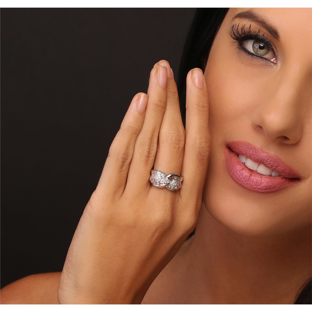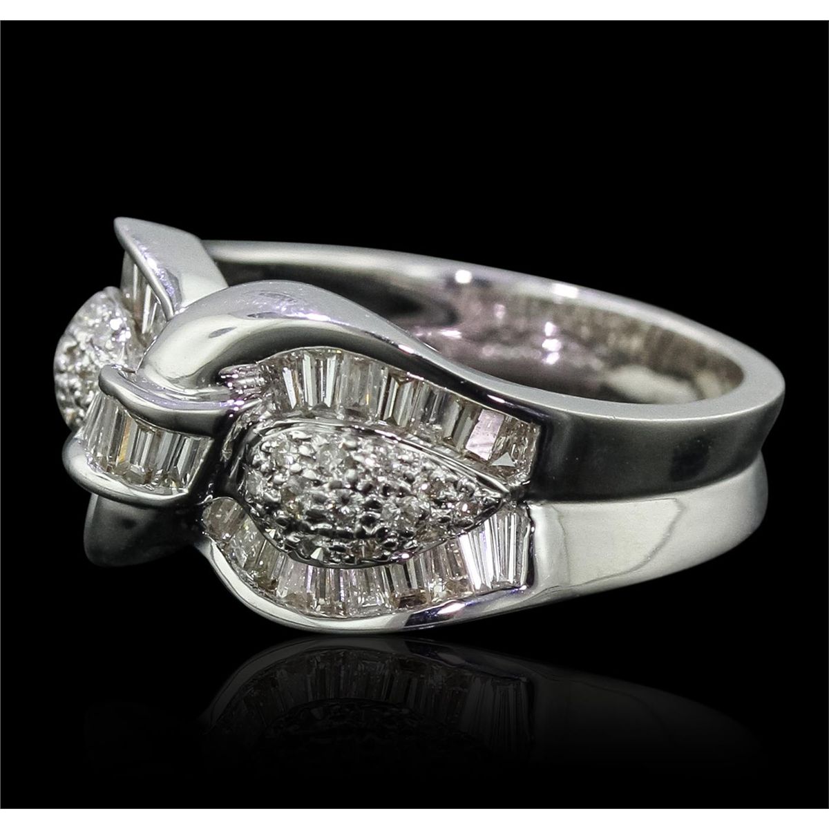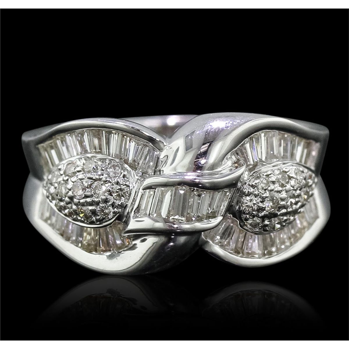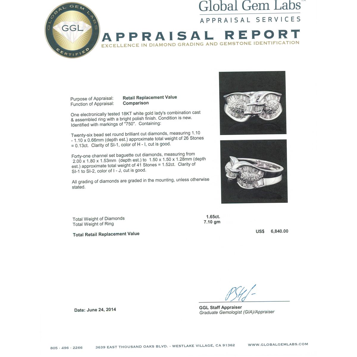 One electronically tested 18KT white gold Ladies combination cast & assembled ring with a bright polish finish. Condition is new. Identified with markings of "750". Containing: Twenty-Six bead set round brilliant cut diamonds, measuring 1.10 - 1.10 x 0.66mm (depth est.) approximate. Total Weight of 26 Stones = 0.13ct. Clarity: SI-1. Color: H - I, Cut is Good. Forty-One channel set baguette cut diamonds, measuring from 2.00 x 1.80 x 1.53mm (depth est.) to 1.50 x 1.50 x 1.28mm (depth est.) approximate. Total Weight of 41 Stones = 1.52ct. Clarity: SI-1 to SI-2. Color: I - J, Cut is Good. All grading of diamonds are graded in the mounting, unless otherwise stated. Total Weight of Diamonds 1.65ct. Total Weight of Ring 7.10 grams. GGL Appraised at $6,840.00.