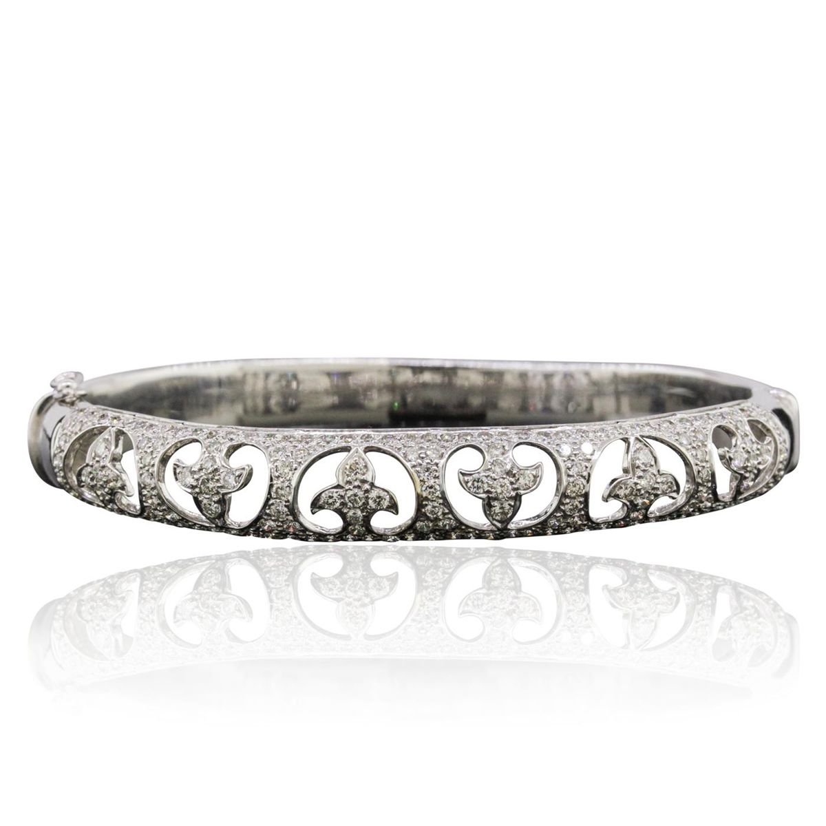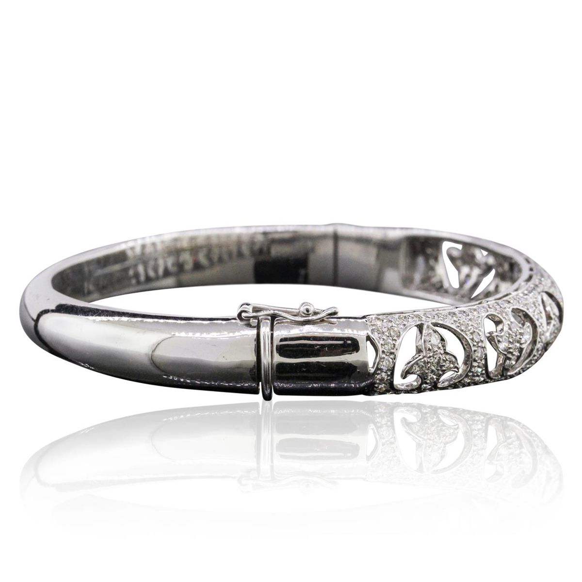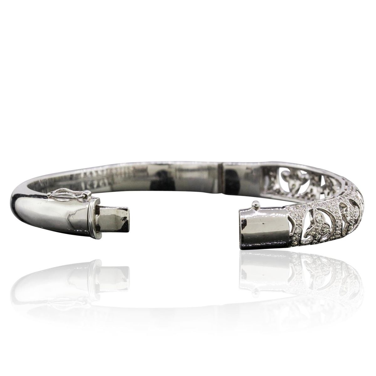 One electronically tested 18KT white gold ladies cast bangle bracelet with a bright polish finish. Measurements: 2.5" x 2.2". Condition is new. Containing: One Hundred Sixty-Seven prong set round brilliant cut diamonds, measuring 1.40 - 1.40 x 0.84mm (depth est.) approximate total weight of 167 Stones = 1.67ct. Clarity: SI-1 to SI-2. Color: J - K, Cut is Good. All diamonds are graded in the mounting, unless otherwise stated. Total Weight of Diamonds 1.67ct. Total Weight of Bracelet 25.00 grams. GGL Appraised at $7,855.00.