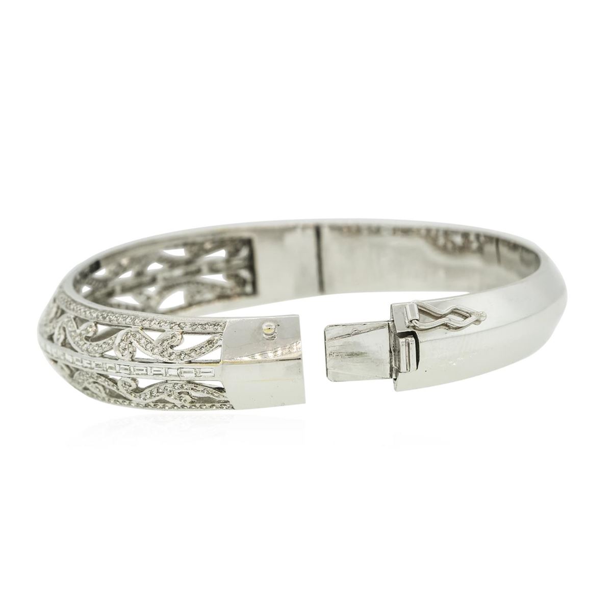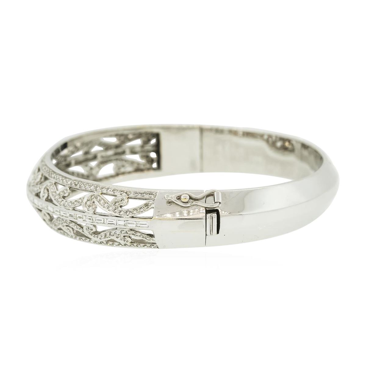 One electronically tested 18KT white gold ladies combination cast & assembled bangle bracelet with a bright polish finish. Measurements: 2.50" x 2.20". Identified with markings of "18K". Condition is new. Containing: Two Hundred Ninety-Eight prong set round brilliant cut diamonds, measuring 1.00 - 1.00 x 0.60mm (depth est.) approximate total weight of 298 Stones = 1.07ct. Clarity: SI-1 to SI-2. Color: I - J, Cut is Good. Thirty-Nine channel set baguette cut diamonds, measuring 2.00 x 1.00 x 0.85mm (depth est.) approximate total weight of 39 Stones = 0.61ct. Clarity: SI-1. Color: H - I, Cut is Good. All diamonds are graded in the mounting, unless otherwise stated. Total Weight of Diamonds 1.68ct. Total Weight of Bracelet 34.60 grams. GGL Appraised at $9,865.00.