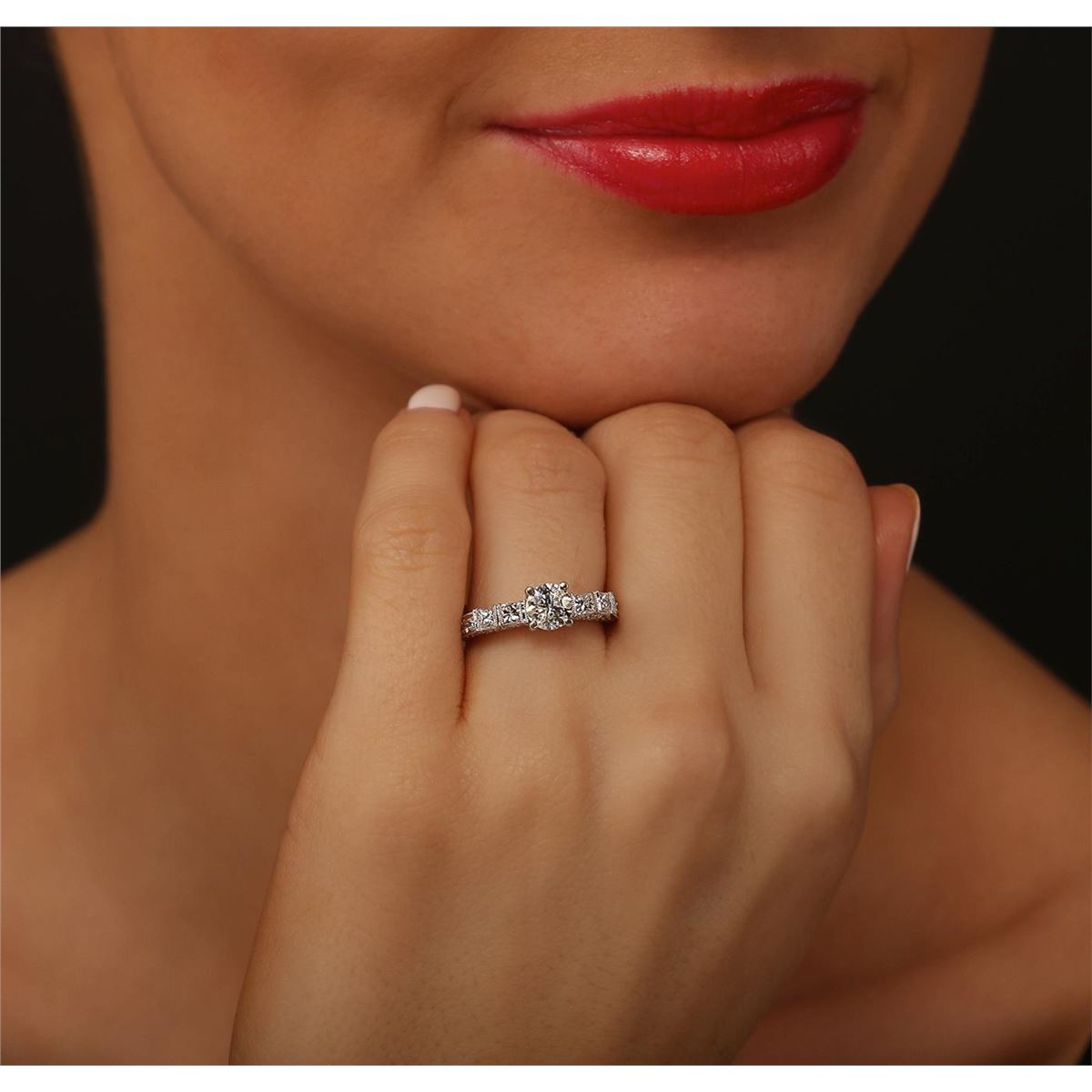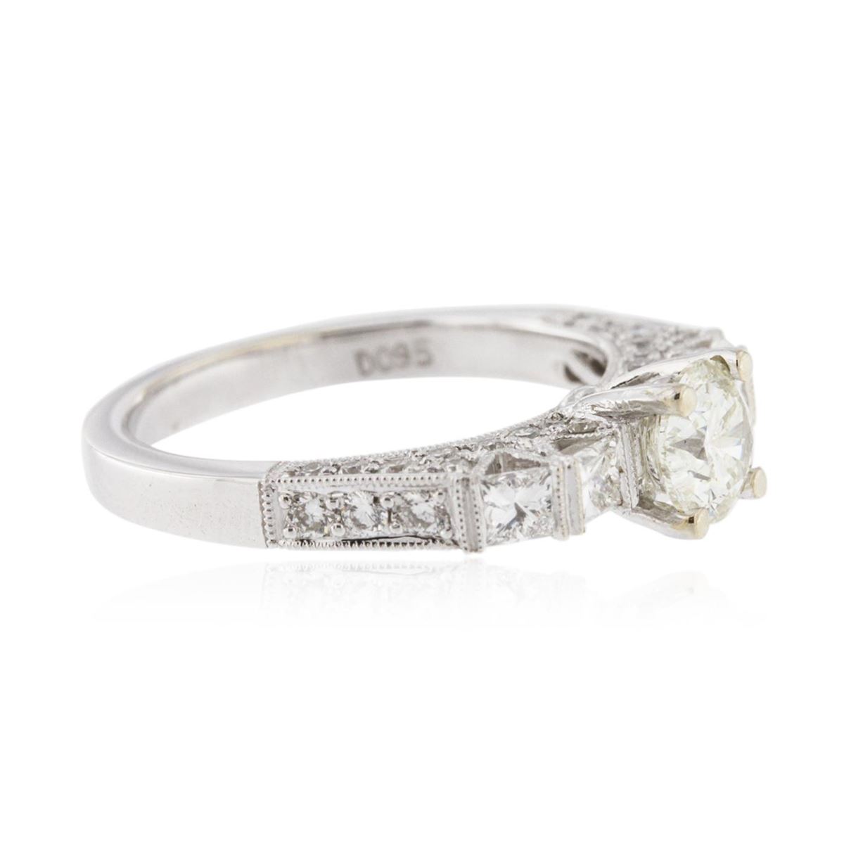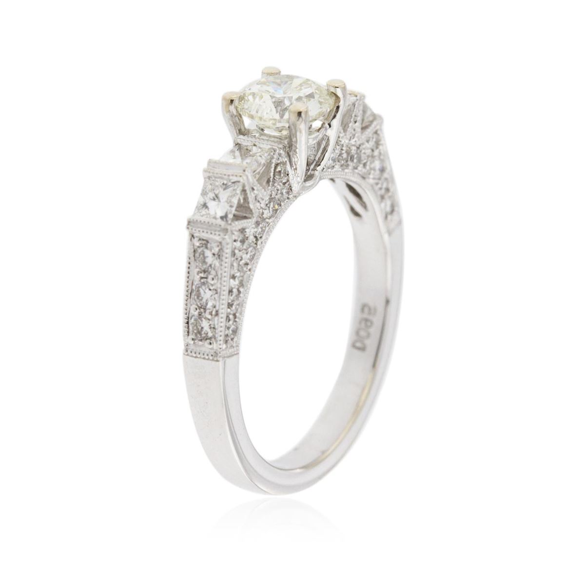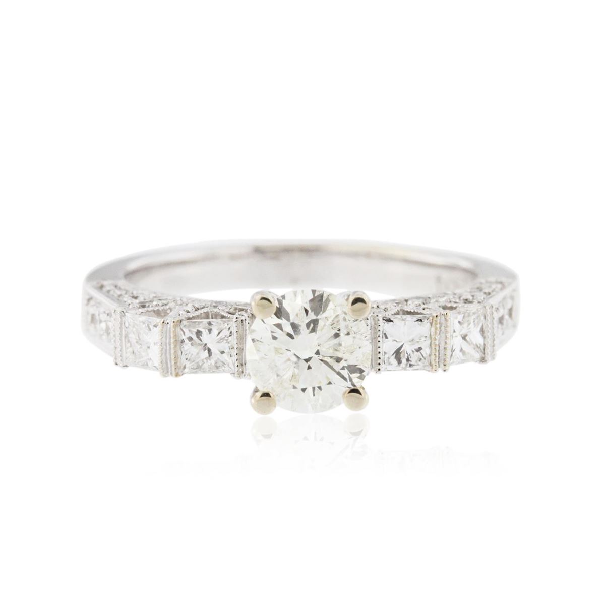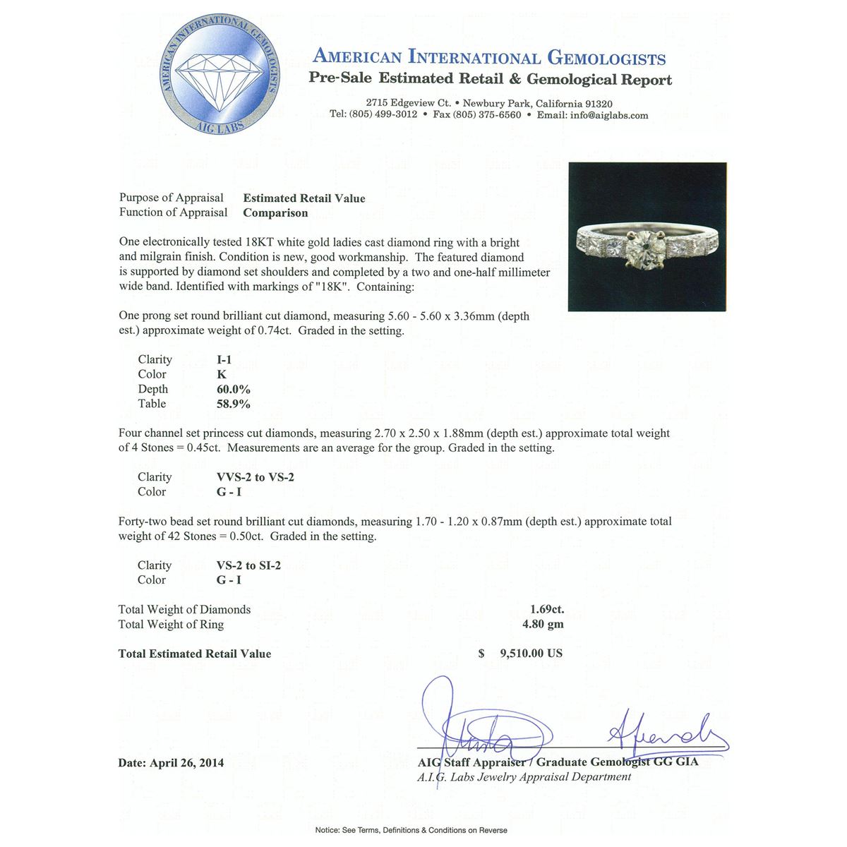 One electronically tested 18KT white gold ladies cast diamond ring with a bright and milgrain finish. Condition is new, good workmanship. The featured diamond is supported by diamond set shoulders and completed by a two and one-half millimeter wide band. Identified with markings of "18K". Containing: One prong set round brilliant cut diamond, measuring 5.60 - 5.60 x 3.36mm (depth est.) approximate weight of 0.74ct. Graded in the setting. Clarity: I-1 . Color: 60.0%. Table 58.9%. Four channel set princess cut diamonds, measuring 2.70 x 2.50 x 1.88mm (depth est.) approximate. Total Weight of 4 Stones = 0.45ct. Measurements are an average for the group. Graded in the setting. Clarity: VVS-2 to VS-2. Color: G - I Forty-Two bead set round brilliant cut diamonds, measuring 1.70 - 1.20 x 0.87mm (depth est.) approximate. Total Weight of 42 Stones = 0.50ct. Graded in the setting. Clarity: VS-2 to SI-2 . Color: G - I. Total Weight of Diamonds 1.69ct.. Total Weight of Ring 4.80 grams. AIG Appraised at $9,510.00.