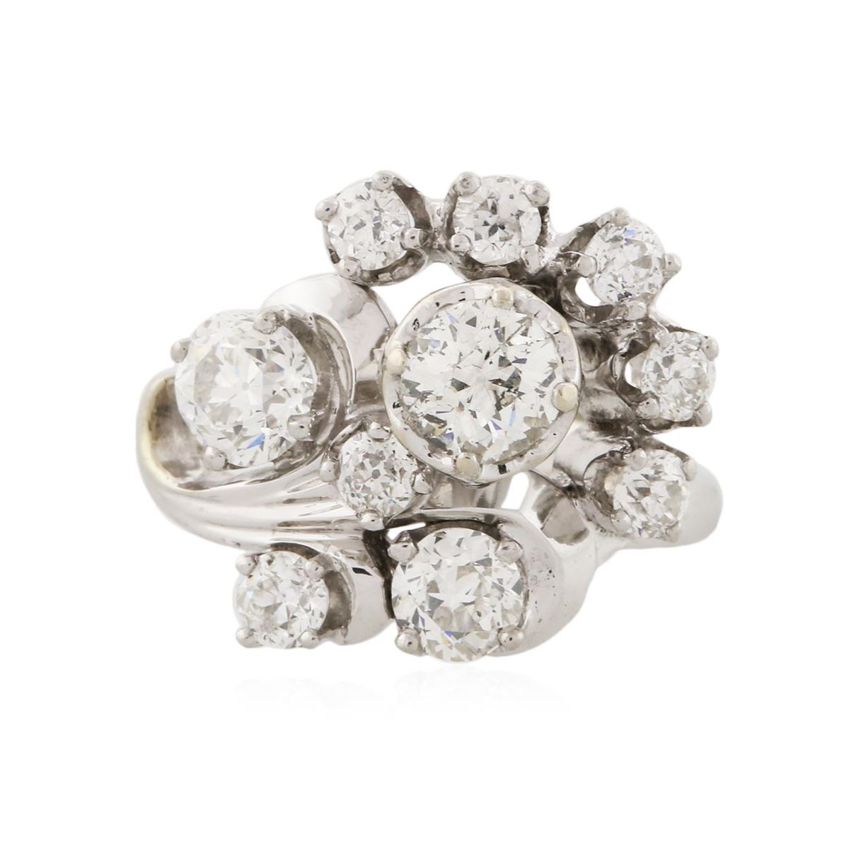 One electronically tested 18KT white gold ladies cast diamond cluster ring with a bright polish finish. The ring features a cluster of diamonds, completed by a two millimeter wide band. Identified with markings of "18K". Condition is good. Containing: One prong set Old European cut diamond, measuring 4.80 - 4.70 x 3.00mm approximate weight of 0.43ct with a medium blue fluorescence. Cutting style circa late 19th century. Graded in the setting. Clarity: SI-2 . Color: HDepth 63.8%. Table 40.4%. Two prong set Old European cut diamonds, measuring 4.70 - 3.90 x 2.42mm (depth est.) approximate. Total Weight of 2 Stones = 0.63ct. Graded in the setting. Clarity: VS-2 to SI-1 . Color: H - I Seven prong set Old European cut diamonds, measuring 3.00 - 2.60 x 1.61mm (depth est.) approximate. Total Weight of 7 Stones = 0.63ct. Cutting style circa late 19th century. Graded in the setting. Clarity: VS-2 to SI-1 . Color: H - I. Total Weight of Diamonds 1.69ct. AIG Appraised at $8,415.00.