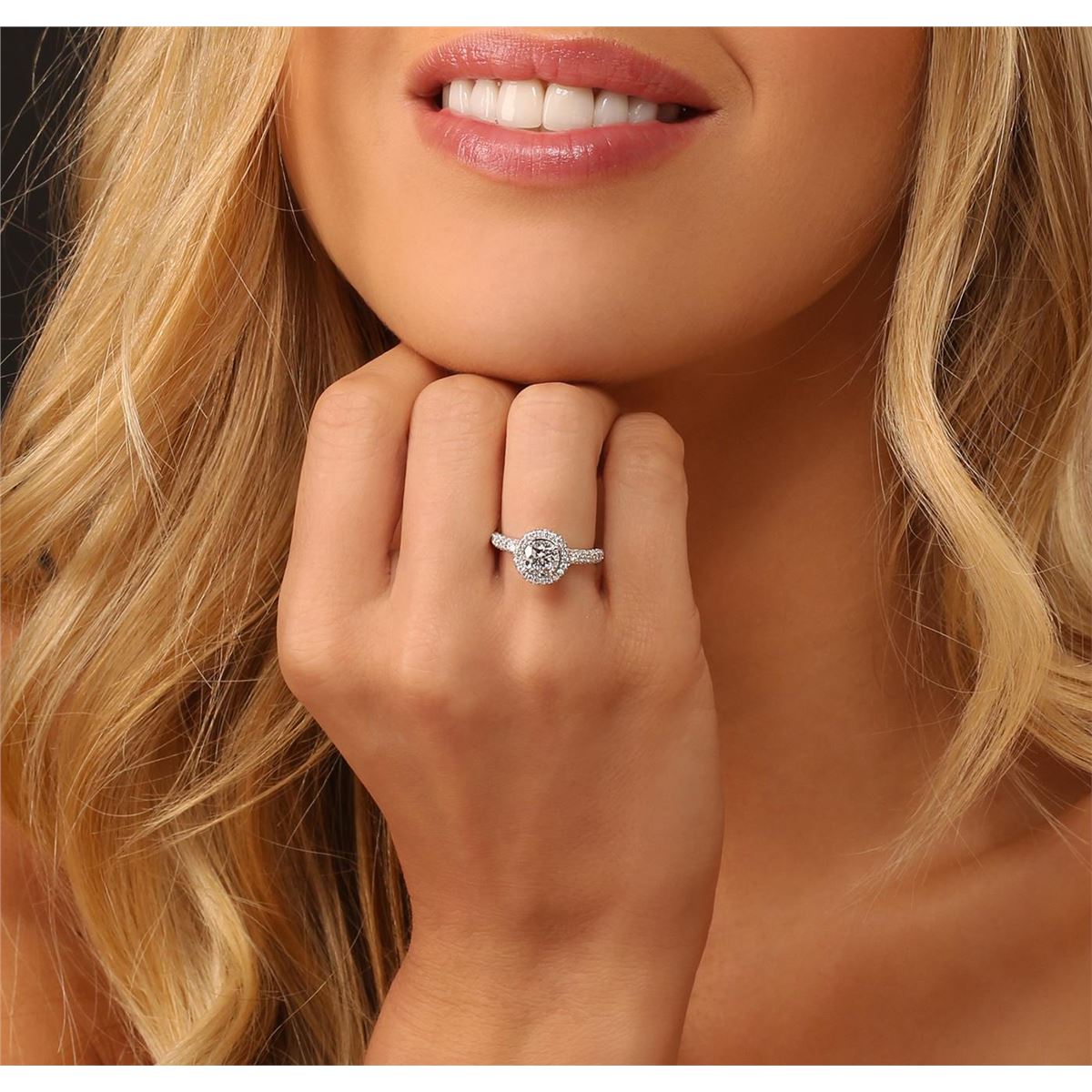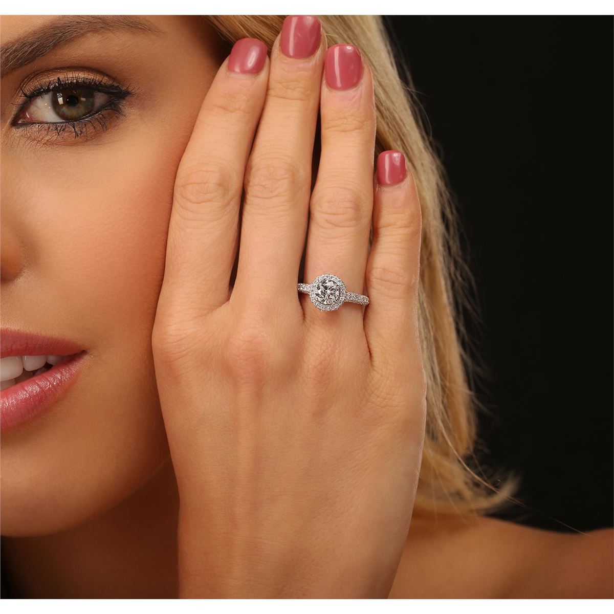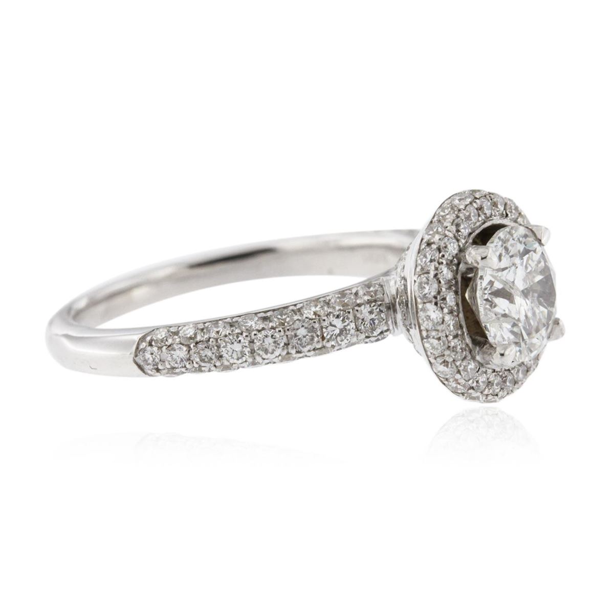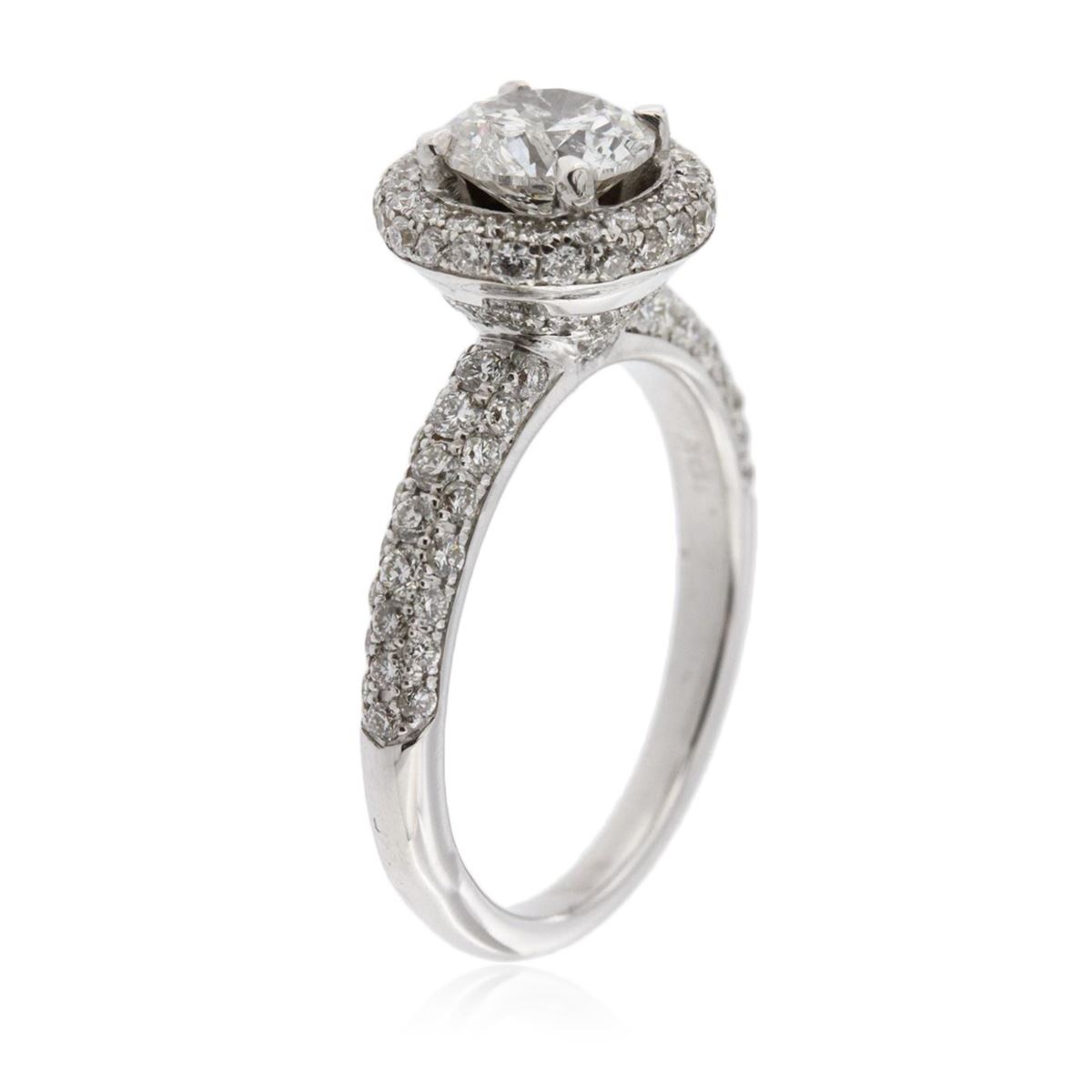 One 18KT white gold Ladies combination cast & assembled engagement ring with a bright polish finish. Identified with markings of "18K". Condition is excellent. Containing: One prong set round brilliant cut diamond, measuring 6.30 - 6.30 x 3.78mm (depth est.) approximate weight of 0.97ct. Clarity of I-2, Color of H, Cut is Good. One Hundred Twelve bead set round brilliant cut diamonds, measuring 1.30 - 1.00 x 0.69mm (depth est.) approximate total weight of 112 Stones = 0.75ct. Clarity of VS-2 to SI-1, Color of G - H, Cut is Very Good. Total Weight of Diamonds 1.72ct. Total Weight of Ring 4.70gm. GGL Appraised at $14,050.00.