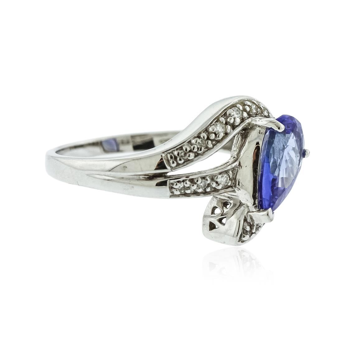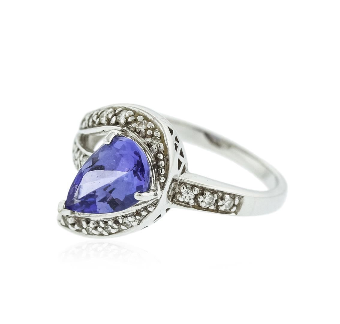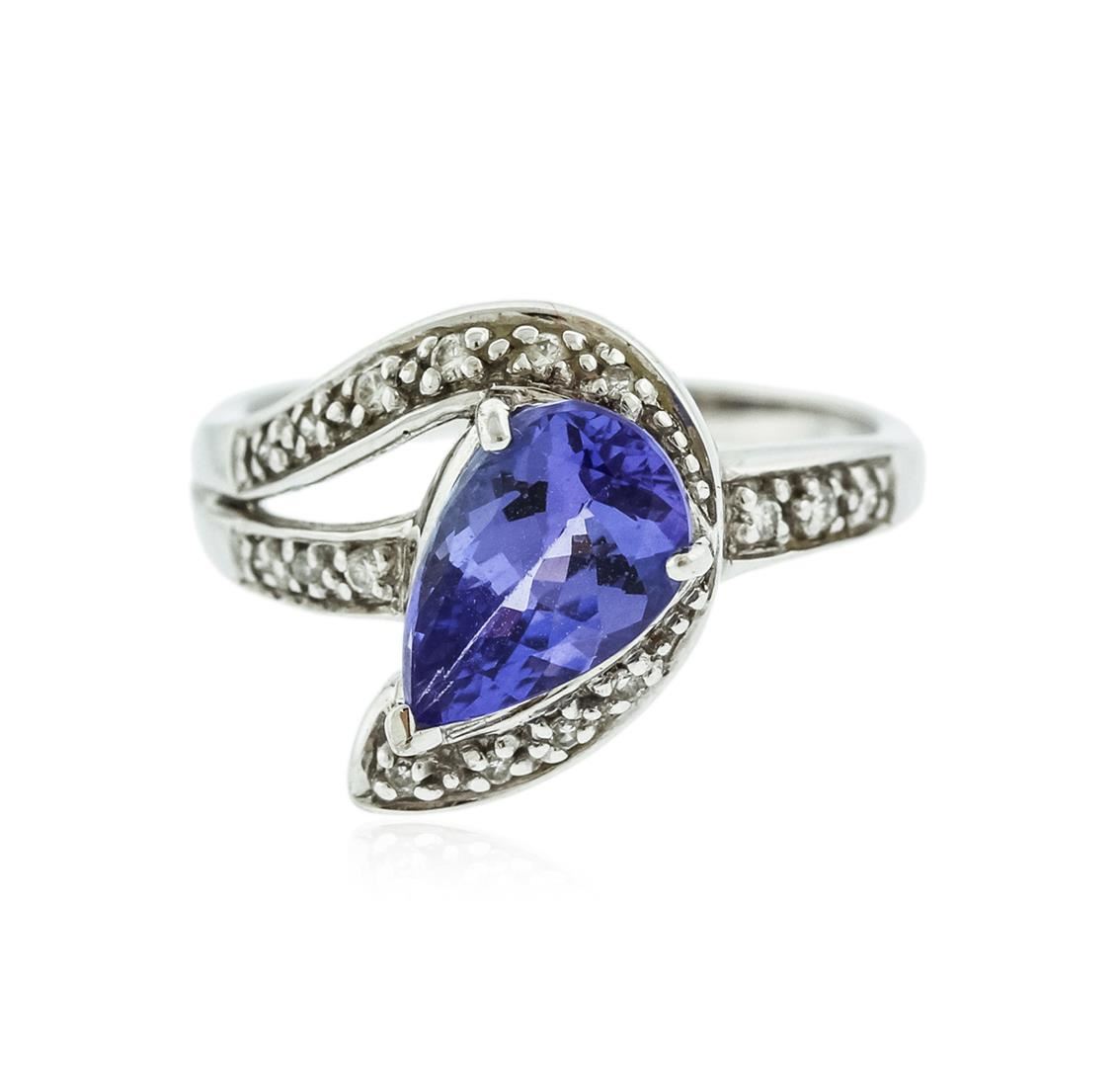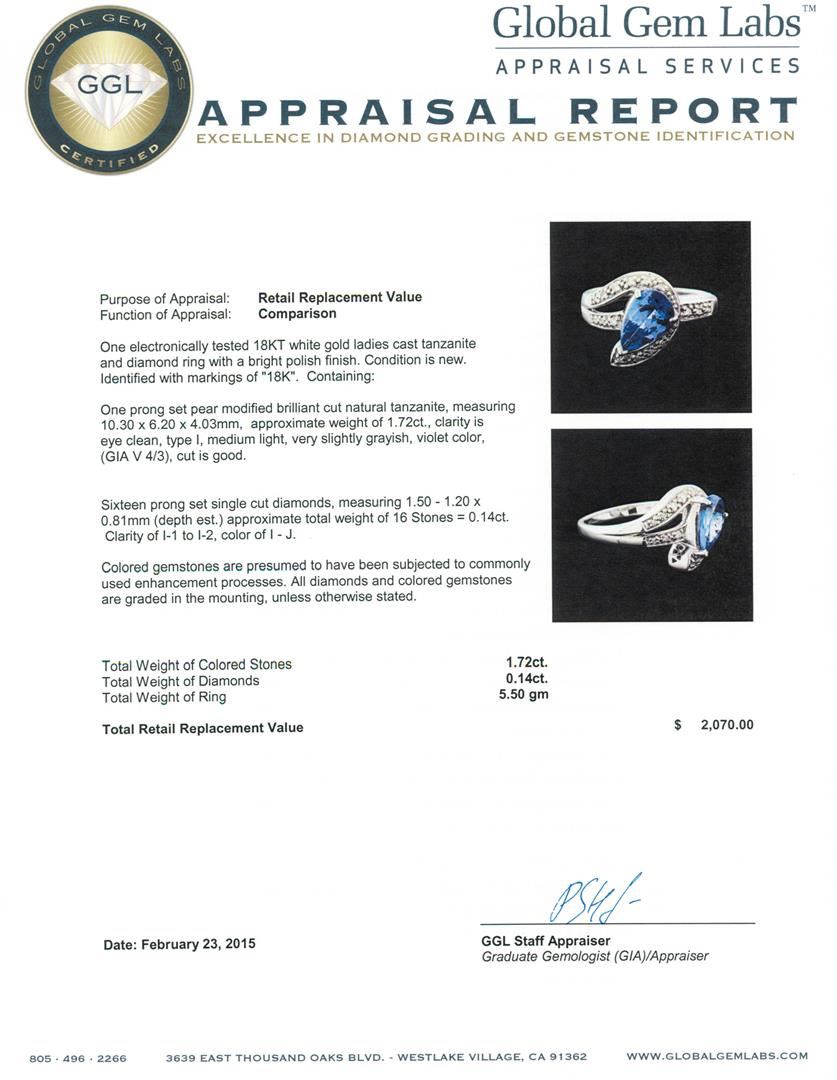 One electronically tested 18KT white gold ladies cast tanzanite and diamond ring with a bright polish finish. Identified with markings of "18K". Condition is new. Containing: One prong set pear modified brilliant cut natural tanzanite, measuring 10.30 x 6.20 x 4.03mm, approximate weight of 1.72ct., clarity is eye clean, type I, medium light, very slightly grayish, violet color, (GIA V 4/3), cut is good. Sixteen prong set single cut diamonds, measuring 1.50 - 1.20 x 0.81mm (depth est.) approximate total weight of 16 Stones = 0.14ct. Clarity: I-1 to I-2. Color: I - J. Colored gemstones are presumed to have been subjected to commonly used enhancement processes. All diamonds and colored gemstones are graded in the mounting, unless otherwise stated. Total Weight of Colored Stones 1.72ct. Total Weight of Diamonds 0.14ct. Total Weight of Ring 5.50 grams. GGL Appraised at $2,070.00.