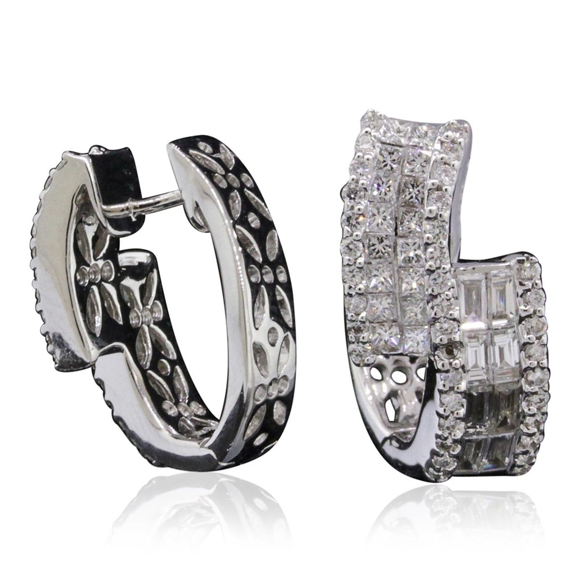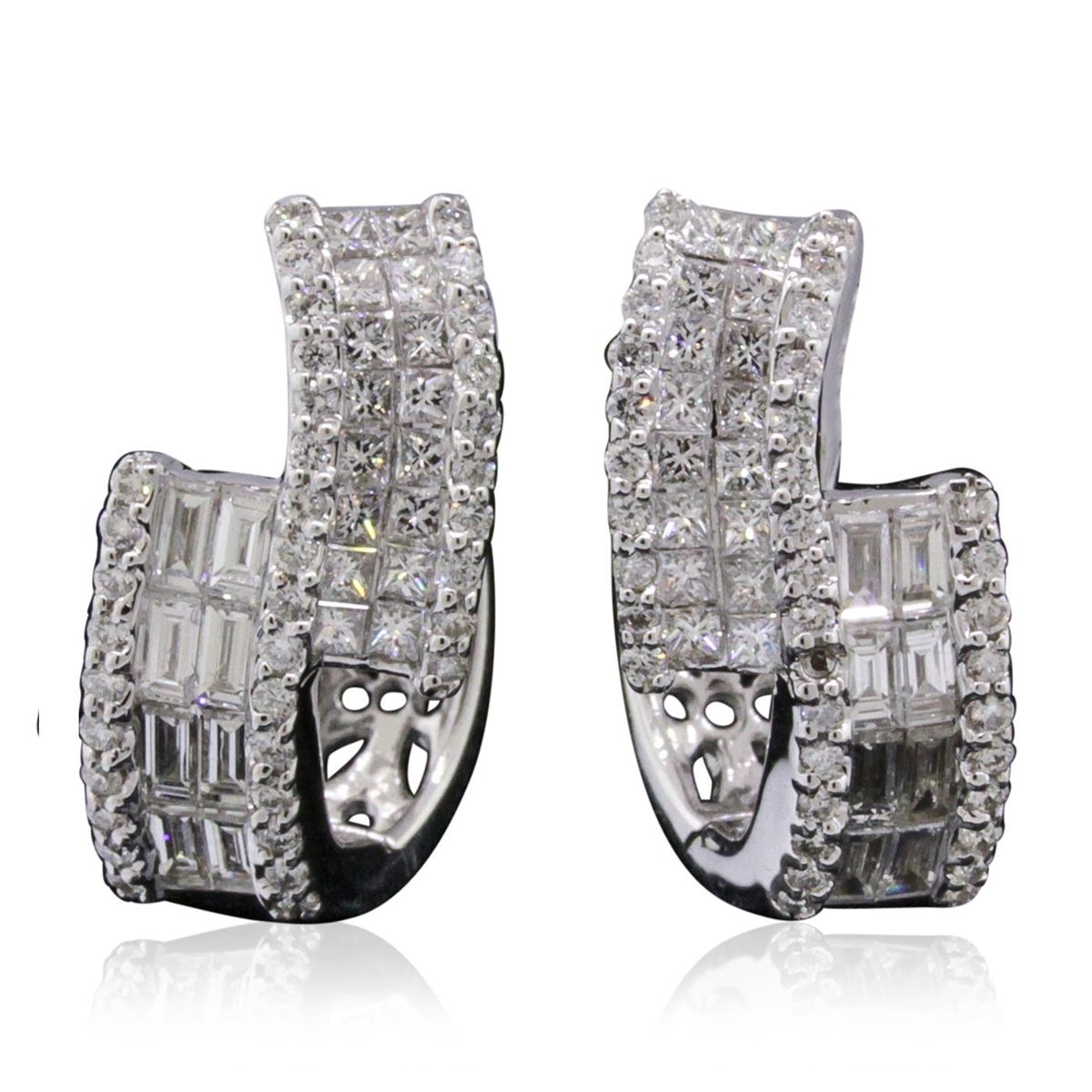 One pair of earrings featuring: 18KT white gold weighing 9.1 grams containing brilliant cut diamonds, princess cut diamonds, and baguette cut diamonds for a total weight of 1.72cts. .