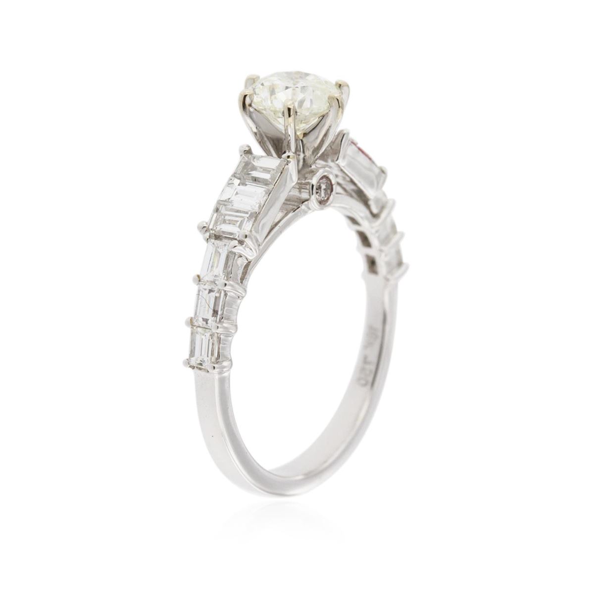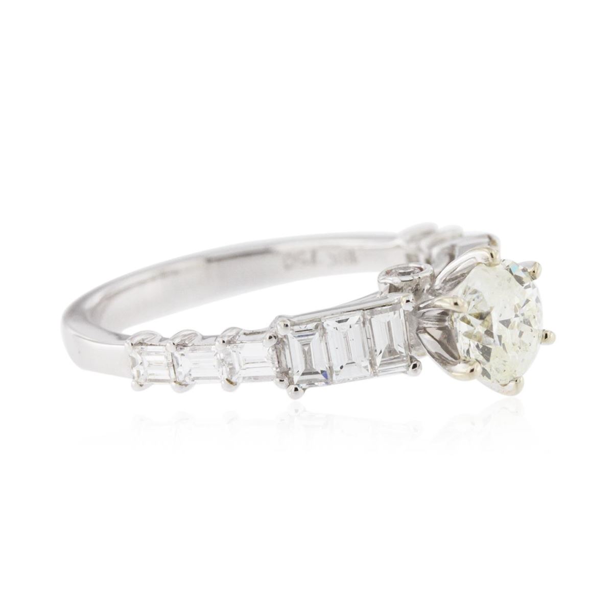 One electronically tested 18KT white gold ladies cast & assembled diamond unity ring with a bright finish. Condition is good. The featured diamond is set within tapering diamond set shoulders, completed by a two millimeter wide band. Identified with markings of "18K 750". Containing: One prong set round brilliant cut diamond, measuring 5.82 - 5.80 x 3.88mm (depth est.), 4.00%. GTCF approximate weight of 0.83ct. Graded in the setting. Clarity: I-1 . Depth: 66.8%. Table 55.1%. Twelve channel set baguette cut diamonds, measuring from 2.60 x 1.90 x 1.29mm (depth est.) to 3.30 x 2.00 x 1.40mm (depth est.) approximate. Total Weight of 12 Stones = 0.85ct. Graded in the setting. Clarity: VS-1 to VS-2 . Color: H - I Two bezel set round brilliant cut diamonds, measuring 1.90 - 1.90 x 1.14mm (depth est.) approximate. Total Weight of 2 Stones = 0.05ct. Graded in the setting. Clarity: I-1 . Color: I - J. Total Weight of Diamonds 1.73ct.. Total Weight of Ring 3.74 grams. AIG Appraised at $6,850.00.