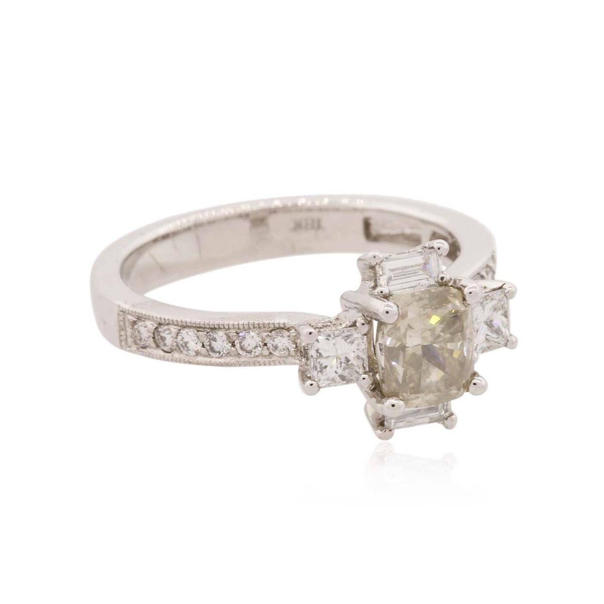 One electronically tested 18KT white gold ladies cast diamond unity ring. The featured diamond is set within a stylized diamond bezel supported by diamond set shoulders, completed by a three millimeter wide band. Bright polish finish with milgrain detailing. Identified with markings of "18K". Condition is new, good workmanship. Containing: One prong set cushion cut diamond, measuring 5.80 x 5.05 x 3.85mm (depth est.) approximate weight of 1.04ct with a faint yellow fluorescence. Graded in the setting. Clarity: SI-2. Depth: 76.2%. Table 68.3%. Thirty prong & bead set round, princess & baguette cut diamonds (depth est.) approximate. Total Weight of 30 Stones = 0.70ct. Graded in the setting. Clarity: VS-1 to SI-1. Color: G - I. Total Weight of Diamonds 1.74ct. Total Weight of Unity Ring 4.25gm. AIG Appraised at $9,310.00.