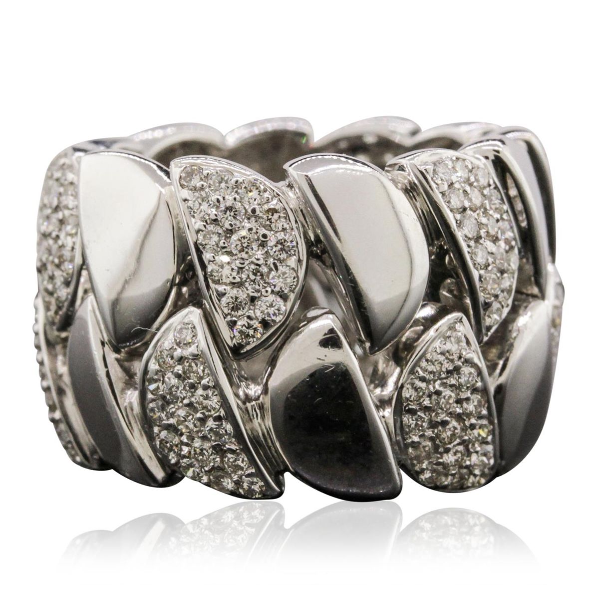 One electronically tested 18KT white gold ladies cast & assembled diamond ring with a bright polish finish. Condition is new, good workmanship. Continuous fifteen millimeter wide ring features a series of diamond set half moon shaped links and matching white gold links. Ring size 7. Containing: One Hundred Eighty bead set round brilliant cut diamonds, measuring 1.40 - 1.30 x 0.81mm (depth est.) approximate. Total Weight of 180 Stones = 1.75ct. Graded in the setting. Clarity: VS-1 to SI-1. Color: G - I. Total Weight of Diamonds 1.75ct. Total Weight of Ring 15.07 grams. AIG Appraised at $10,285.00.