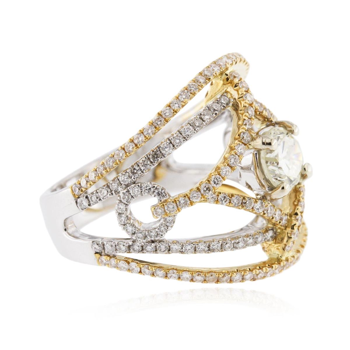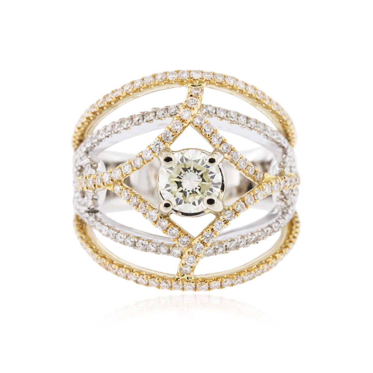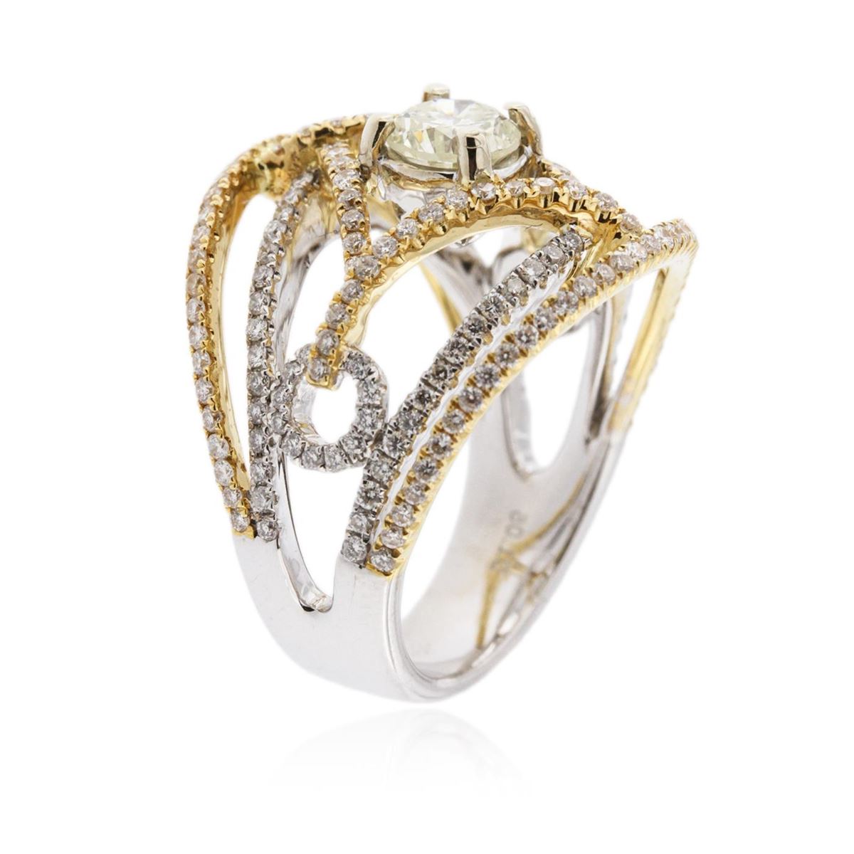 One electronically tested 18KT White Gold ladies cast & assembled diamond ring. Condition is good. The featured diamond is set within intertwining diamond ribbons, completed by a five millimeter wide band. Bright polish finish with Yellow Gold accents. Identified with markings of "K18". Containing: One prong set round brilliant cut diamond, measuring 5.50 - 5.45 x 3.29mm (depth est.) approximate weight of 0.70ct with a medium blue fluorescence. Graded in the setting. Clarity: I-1 . Depth: 60.0%. Table 69.3%. Two Hundred prong set round brilliant cut diamonds, measuring 1.20 - 1.00 x 0.66mm (depth est.) approximate. Total Weight of 200 Stones = 1.05ct. Graded in the setting. Clarity: SI-1 to SI-2 . Color: G - I. Total Weight of Diamonds 1.75ct. Total Weight of Ring 10.03 grams. AIG Appraised at $9,930.00.