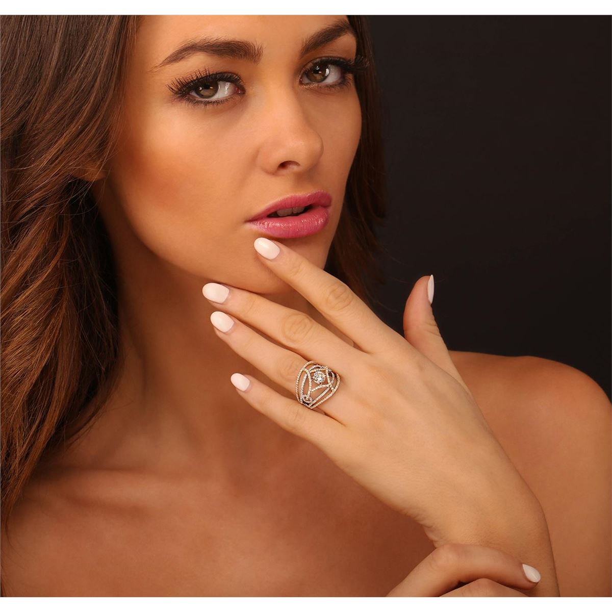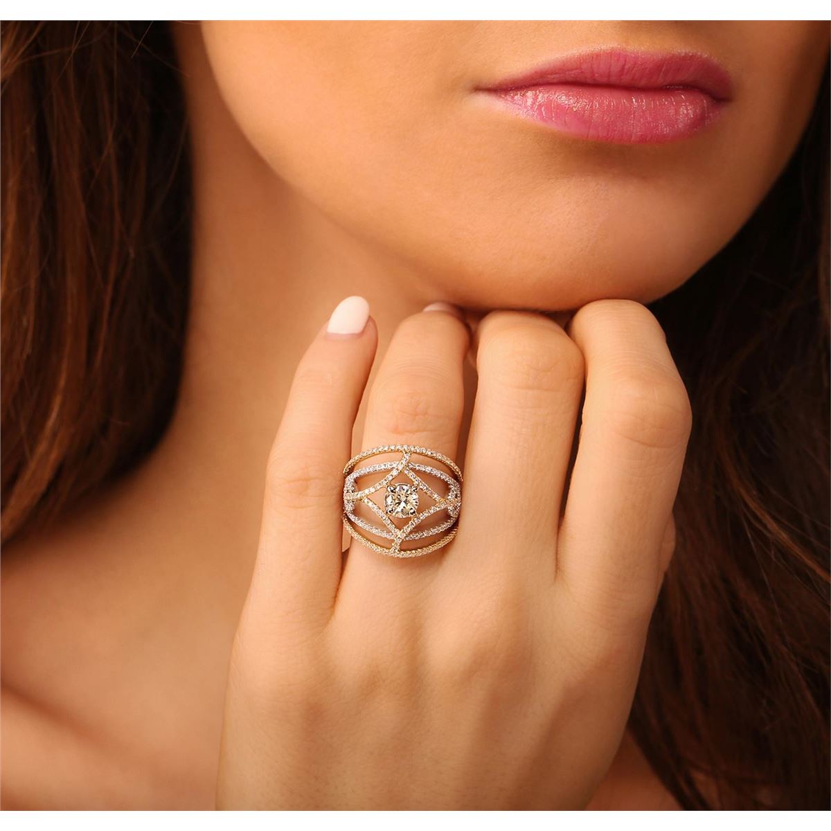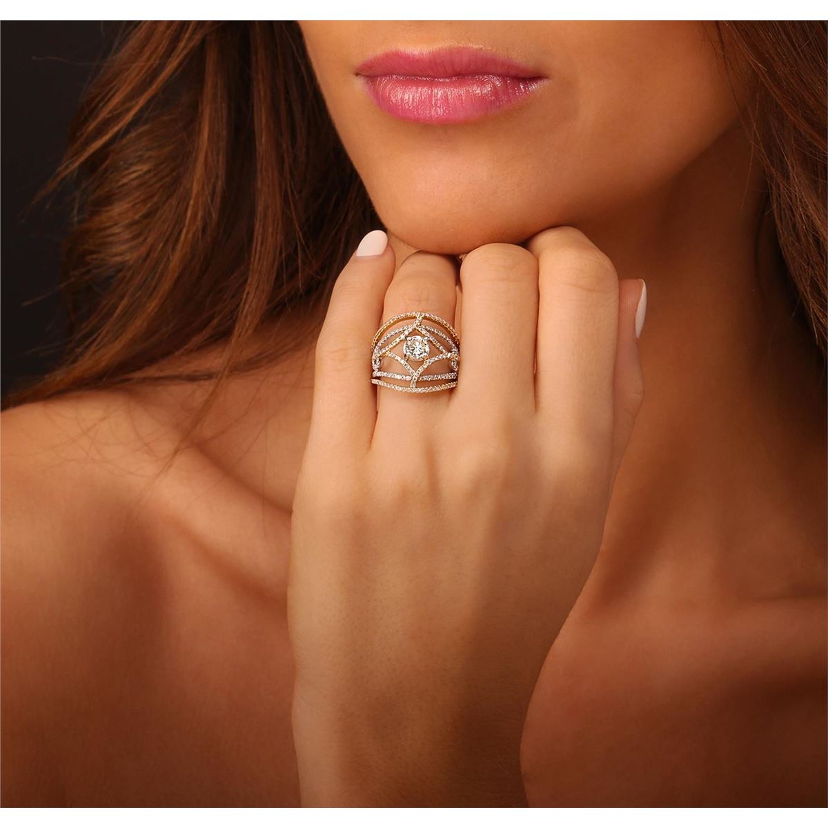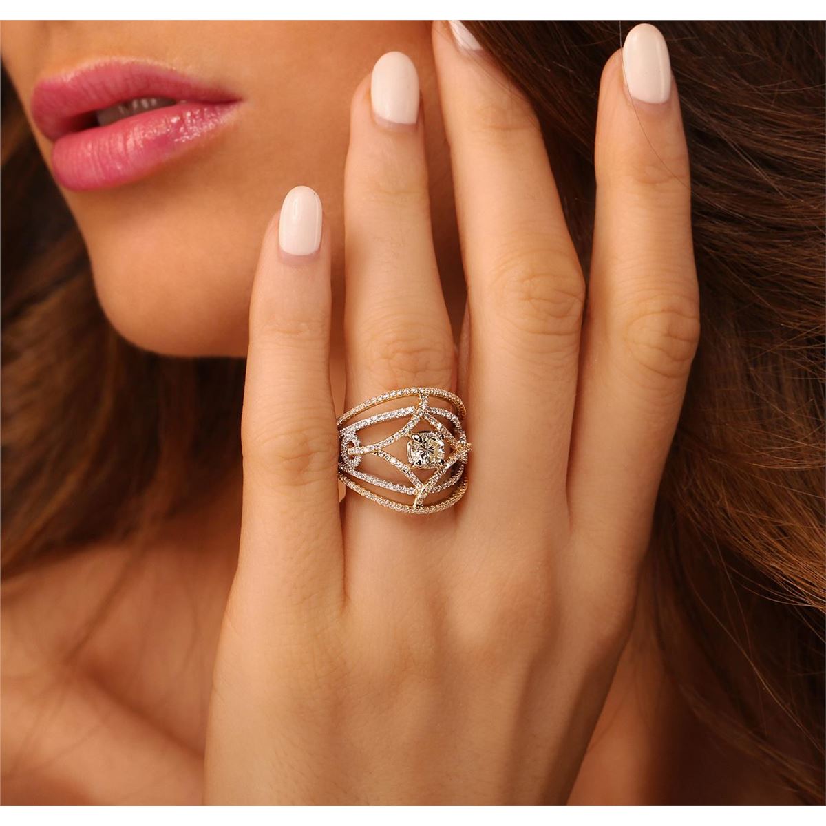 One electronically tested 18KT White Gold ladies cast & assembled diamond ring. Condition is good. The featured diamond is set within intertwining diamond ribbons, completed by a five millimeter wide band. Bright polish finish with Yellow Gold accents. Identified with markings of "K18". Containing: One prong set round brilliant cut diamond, measuring 5.50 - 5.45 x 3.29mm (depth est.) approximate weight of 0.70ct with a medium blue fluorescence. Graded in the setting. Clarity: I-1 . Depth: 60.0%. Table 69.3%. Two Hundred prong set round brilliant cut diamonds, measuring 1.20 - 1.00 x 0.66mm (depth est.) approximate. Total Weight of 200 Stones = 1.05ct. Graded in the setting. Clarity: SI-1 to SI-2 . Color: G - I. Total Weight of Diamonds 1.75ct. Total Weight of Ring 10.03 grams. AIG Appraised at $9,930.00.