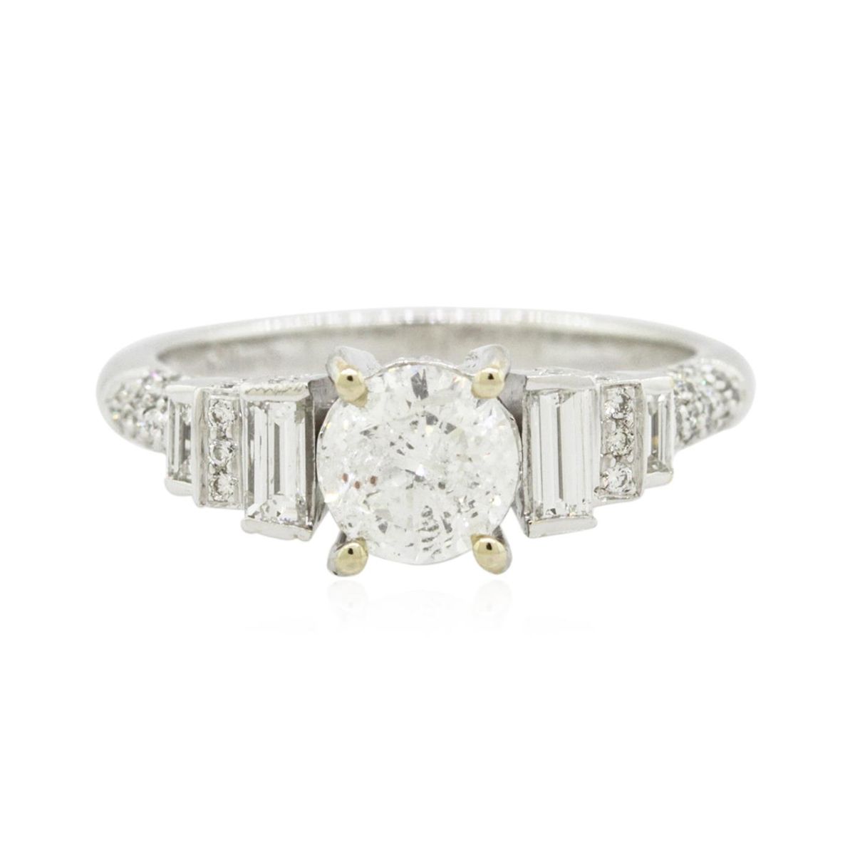 One electronically tested 18KT White Gold ladies cast diamond unity ring with a bright polish finish. The featured diamond is supported by diamond set shoulders, completed by a two millimeter wide band. Identified with markings of "18K 750". Condition is new, good workmanship. Containing: One prong set round brilliant cut diamond, measuring 6.05 - 6.00 x 3.85mm (depth est.) approximate weight of 0.95ct with a medium strong blue fluorescence. Graded in the setting. Clarity: I-2. Color: G. Depth 63.9%. Table 61.4%. Eighty-Six bead set round brilliant cut diamonds, measuring 1.20 - 1.10 x 0.69mm (depth est.) approximate total weight of 86 Stones = 0.55ct. Graded in the setting. Clarity: VS-1 to SI-1. Color: G - I Four channel set baguette cut diamonds, measuring from 3.20 x 1.60 x 1.12mm (depth est.) to 4.20 x 1.80 x 1.26mm (depth est.) approximate total weight of 4 Stones = 0.27ct. Graded in the setting. Clarity: VVS-2 to VS-1. Color: G - H. Total Weight of Diamonds 1.77ct. Total Weight of Unity Ring 5.06 grams. AIG Appraised at $11,670.00.