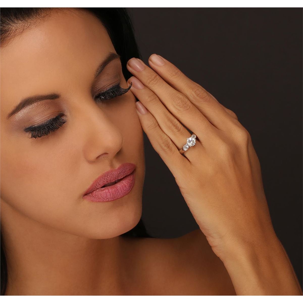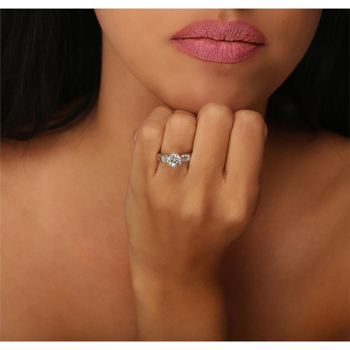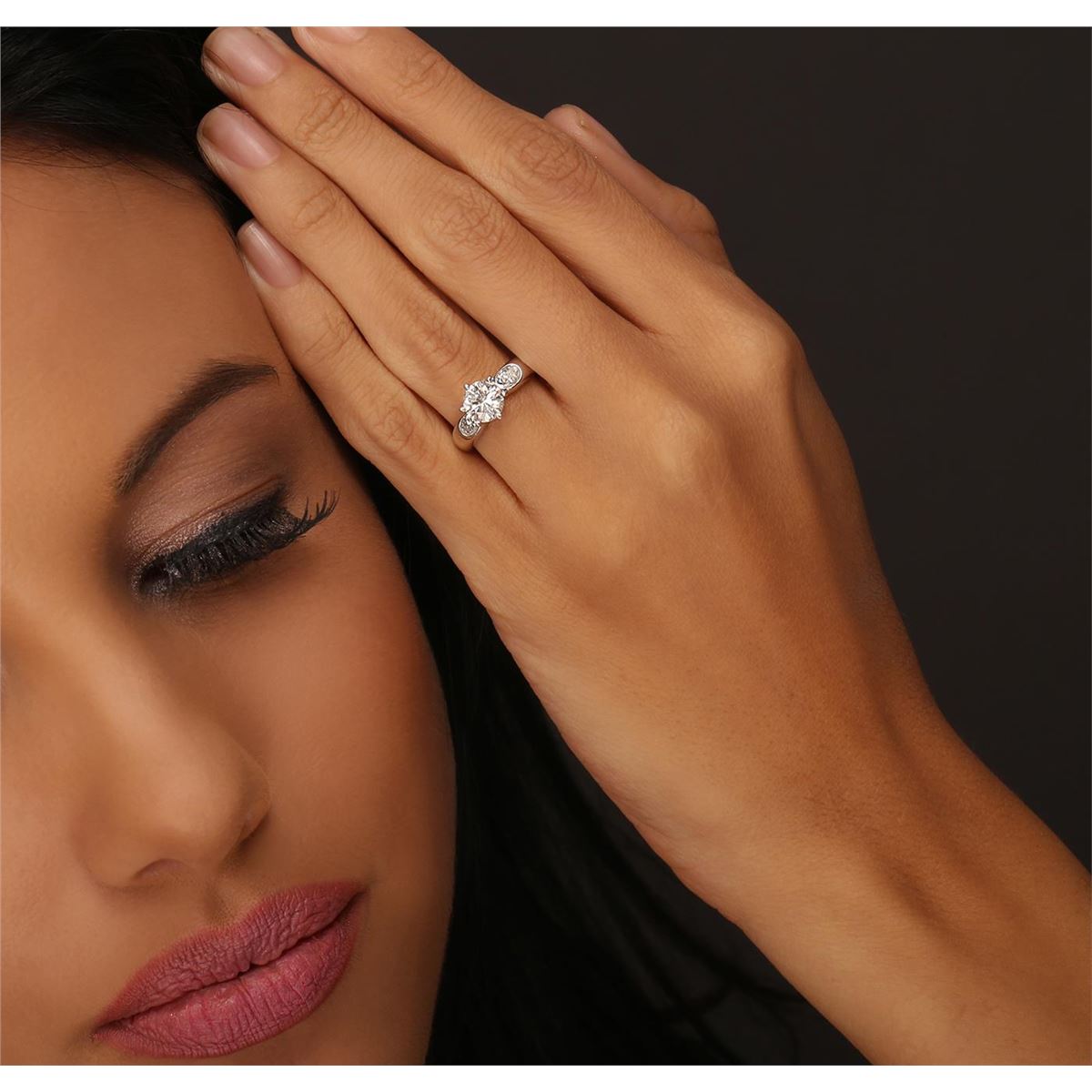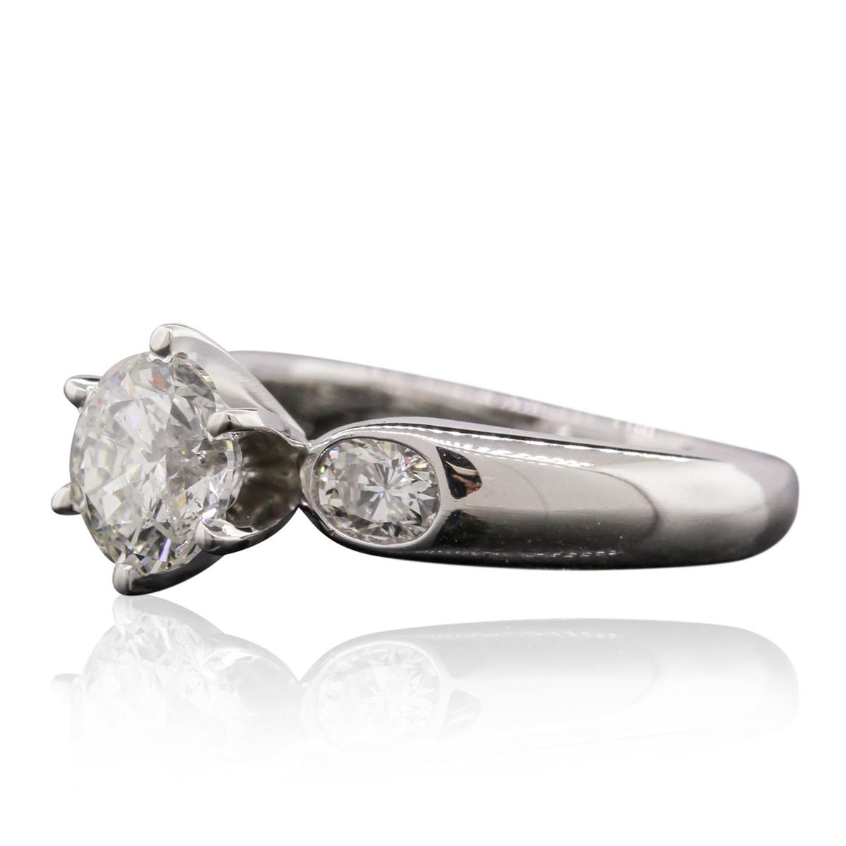 One electronically tested 18KT white gold ladies cast diamond unity ring with a bright polish finish. The featured diamond is accented by a single diamond on either side, completed by a two and one-half millimeter wide band. Identified with markings of "750". Condition is good. Containing: One prong set round brilliant cut diamond, measuring 6.65 - 6.60 x 4.35mm (depth est.) approximate weight of 1.26ct with a faint blue fluorescence. Graded in the setting. Clarity: I-1. Color: 65.6%. Table 60.3%. Two bezel set oval shaped cut diamonds, measuring 4.50 x 3.20 x 2.30mm (depth est.) approximate. Total Weight of 2 Stones = 0.52ct. Measurements are an average for the pair. Graded in the setting. Clarity: VS-2 to SI-1. Color: H - I. Total Weight of Diamonds 1.78ct. Total Weight of Ring 4.94 grams. AIG Appraised at $18,825.00.